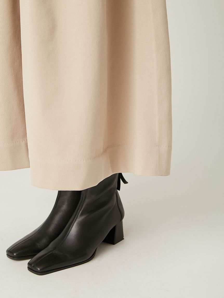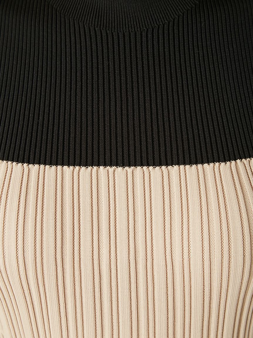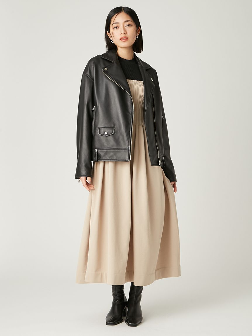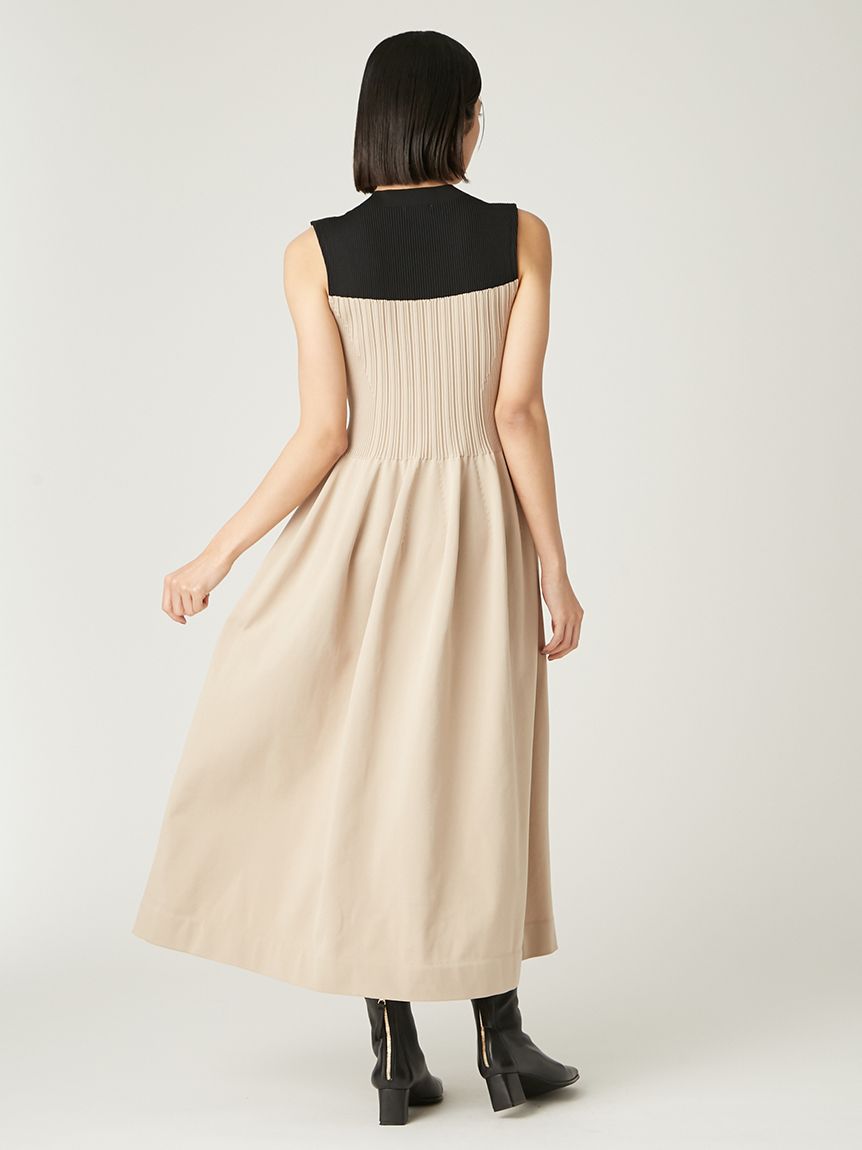 上身以兩種異素材編織交錯,透過立體拼接線條修飾比例,展現顯瘦效果。裙身部分則以天竺編織延展,自然向下輕盈展開,營造柔美流線感。選用細緻聚酯纖維紗線,兼具彈性與適度挺感,帶來輕盈舒適的穿著體驗。