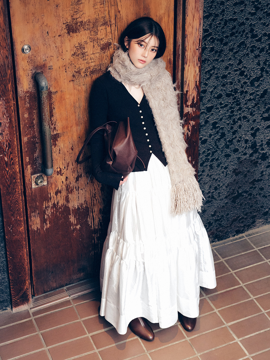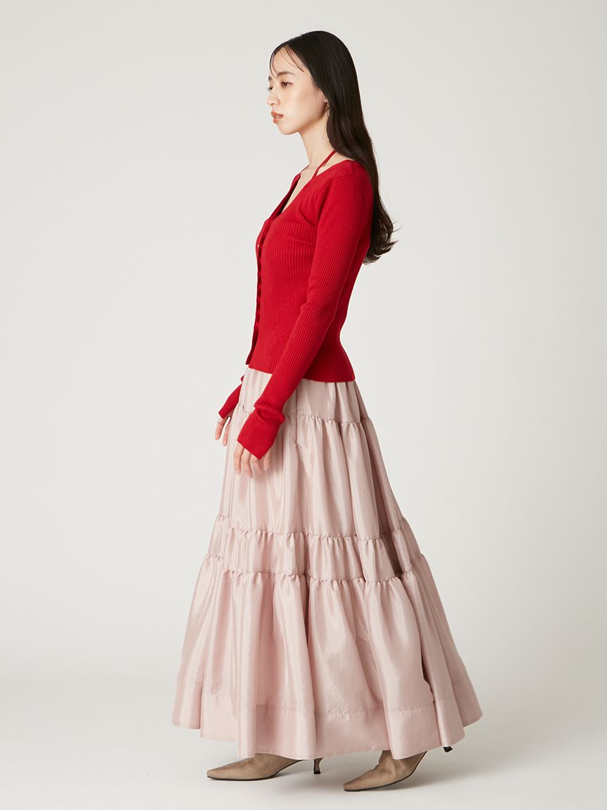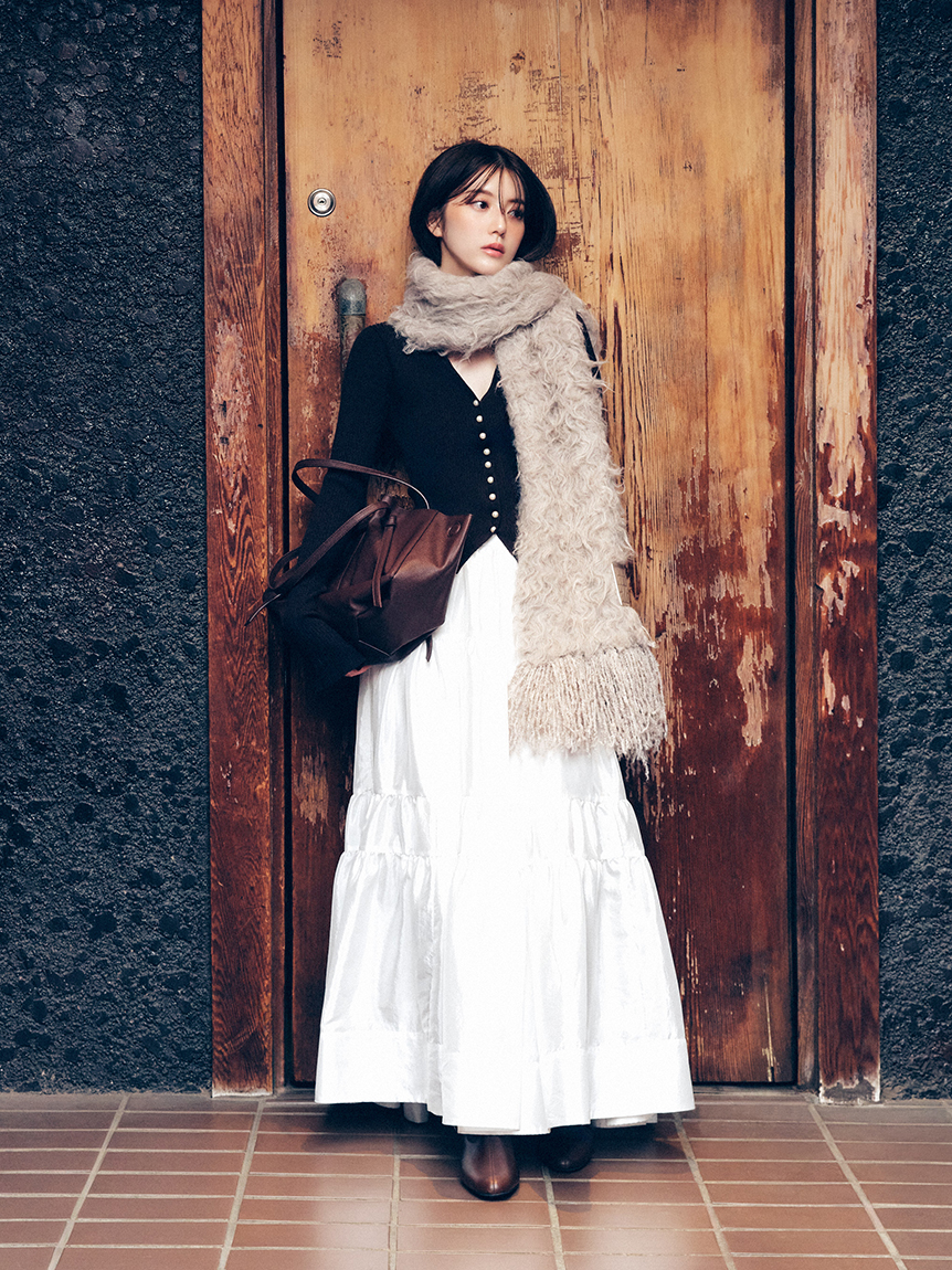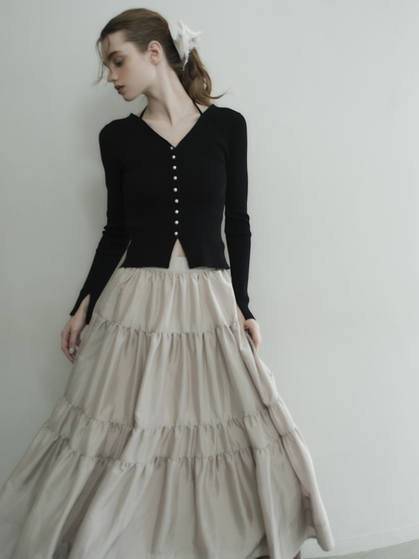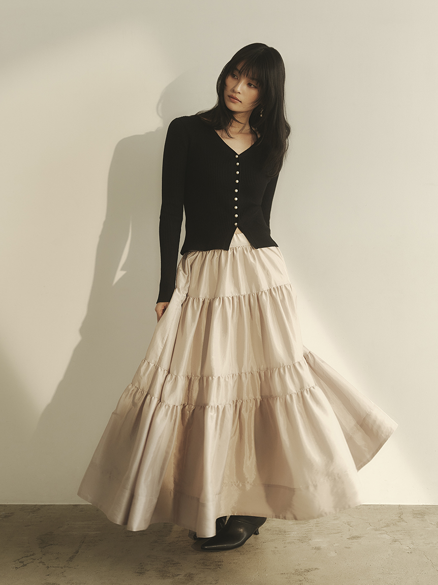 層疊裙採用豐盈蓬鬆的剪裁,與開襟衫搭配時能突顯明暗對比。