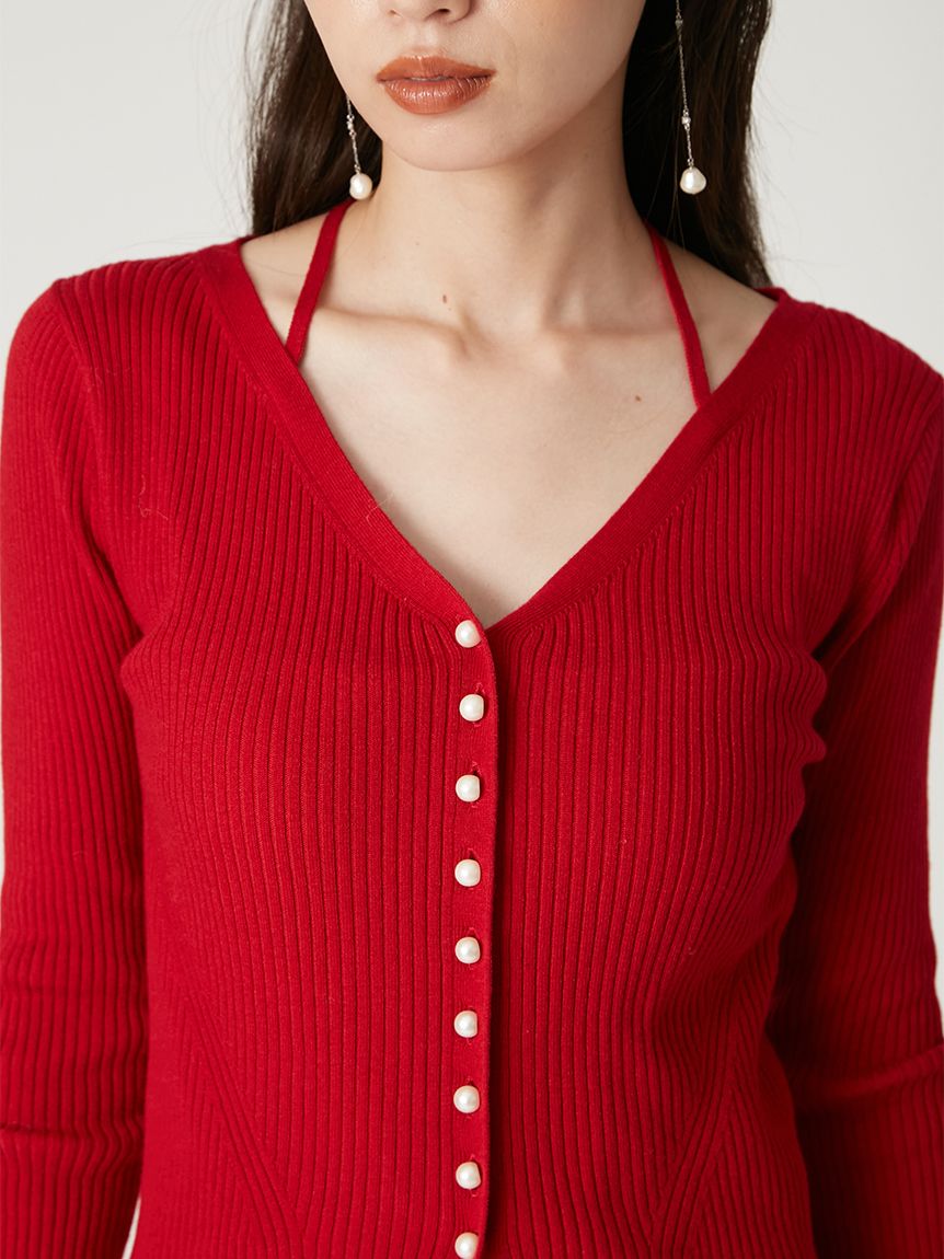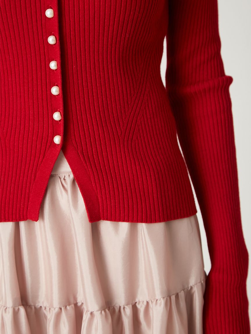 開襟衫上奢華排列的珍珠鈕扣更顯華麗。