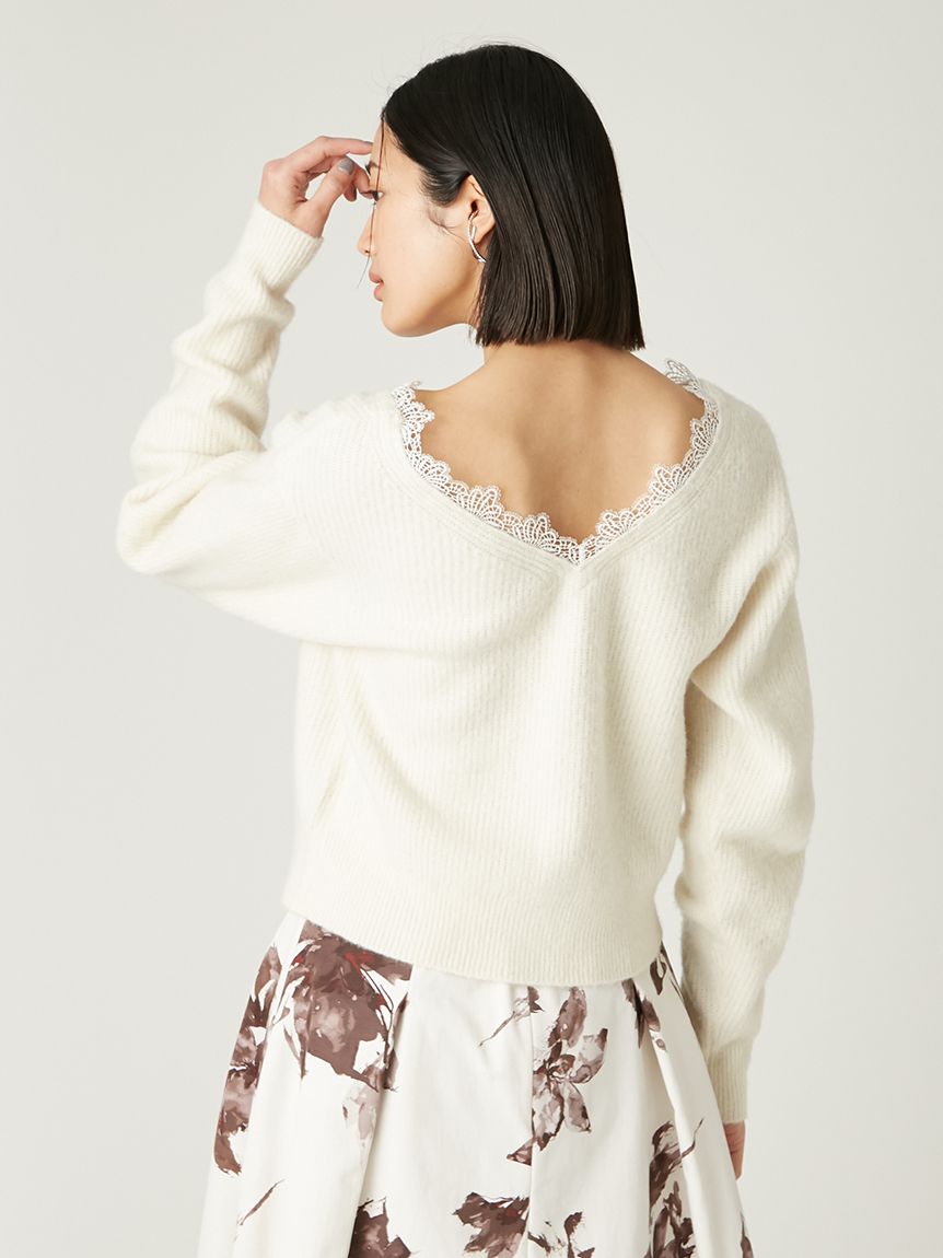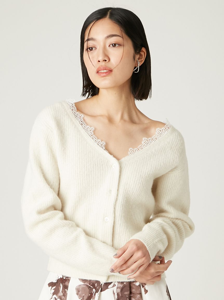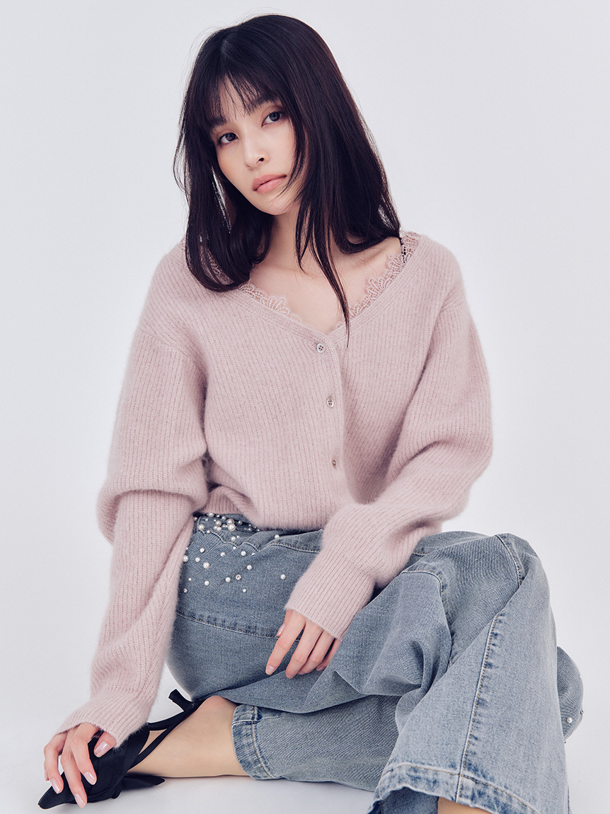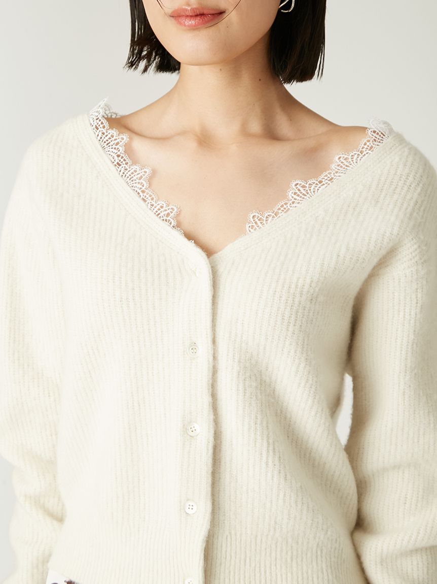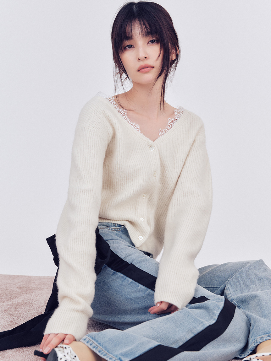 V領針織外套,領口與背部皆以精緻蕾絲修飾,增添女性柔美氣息。