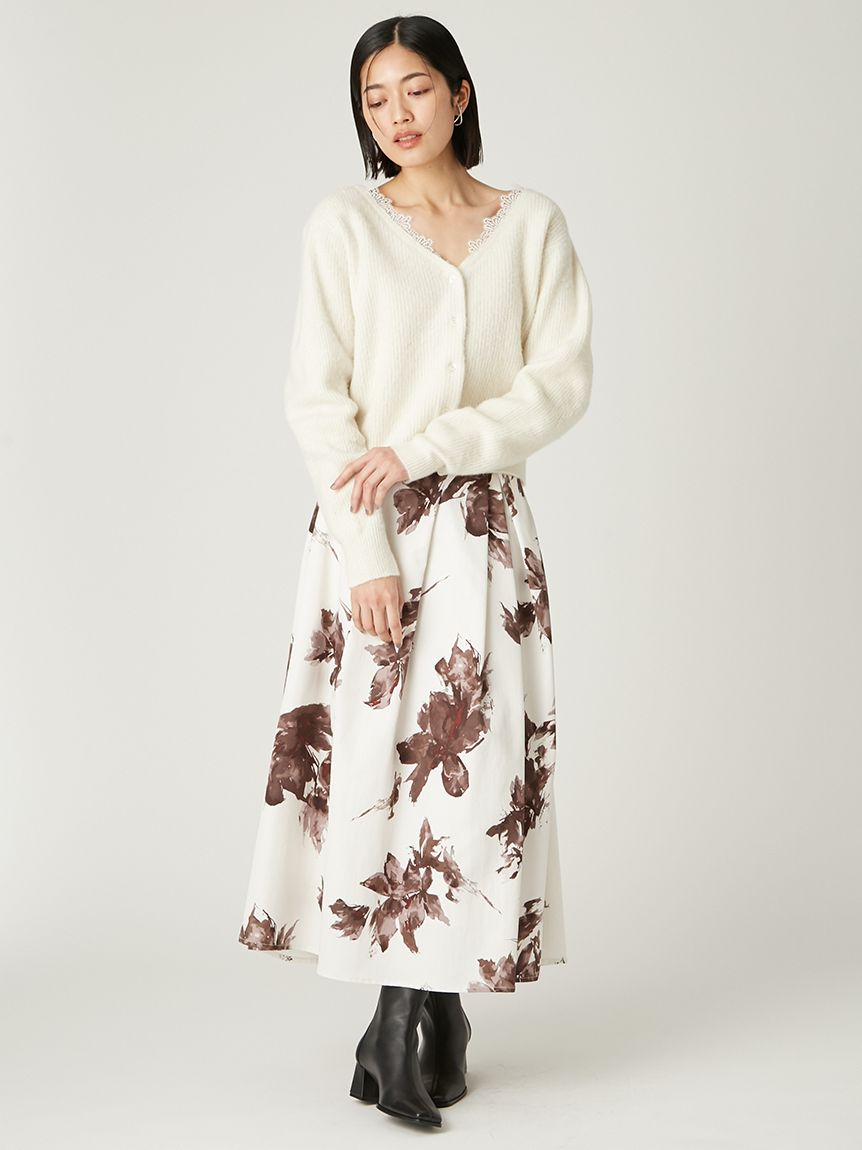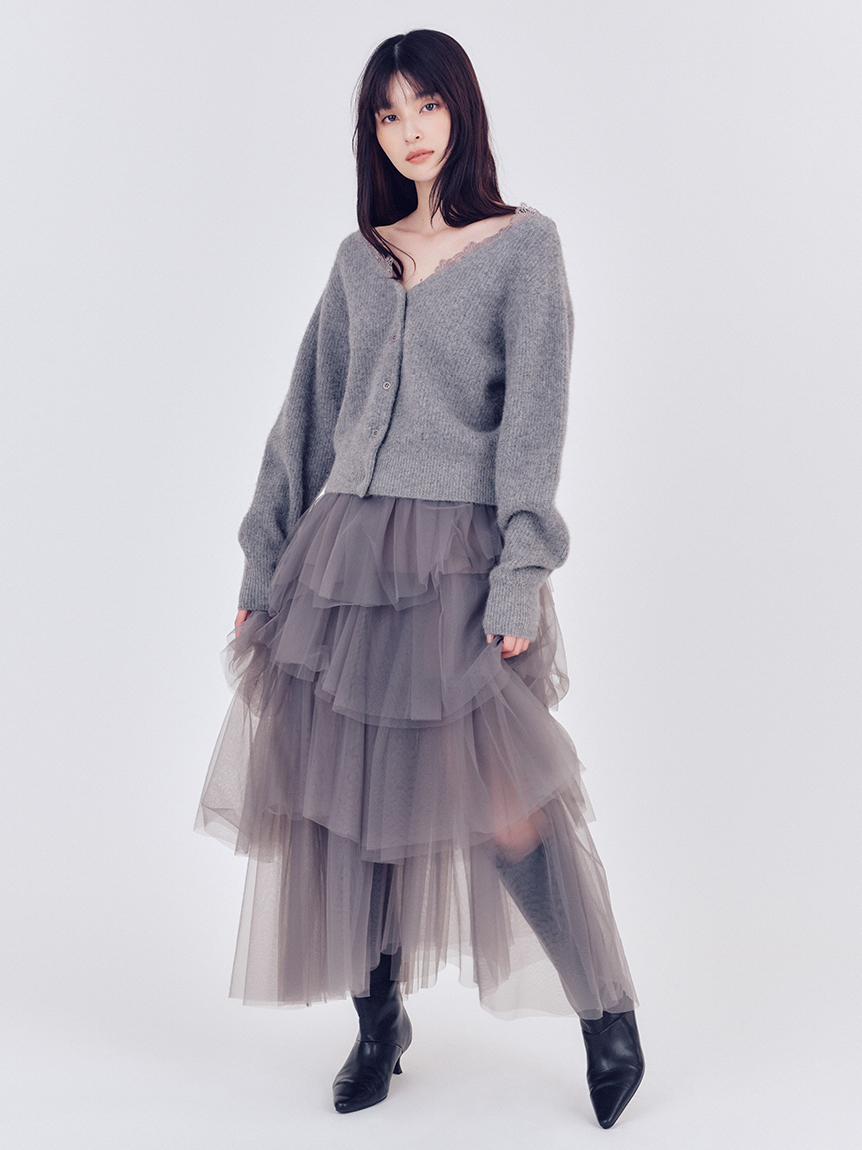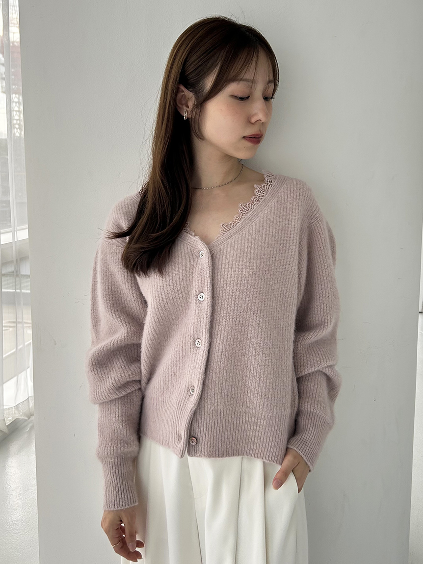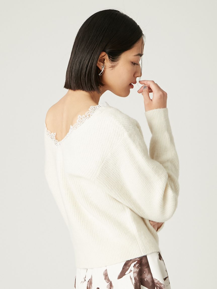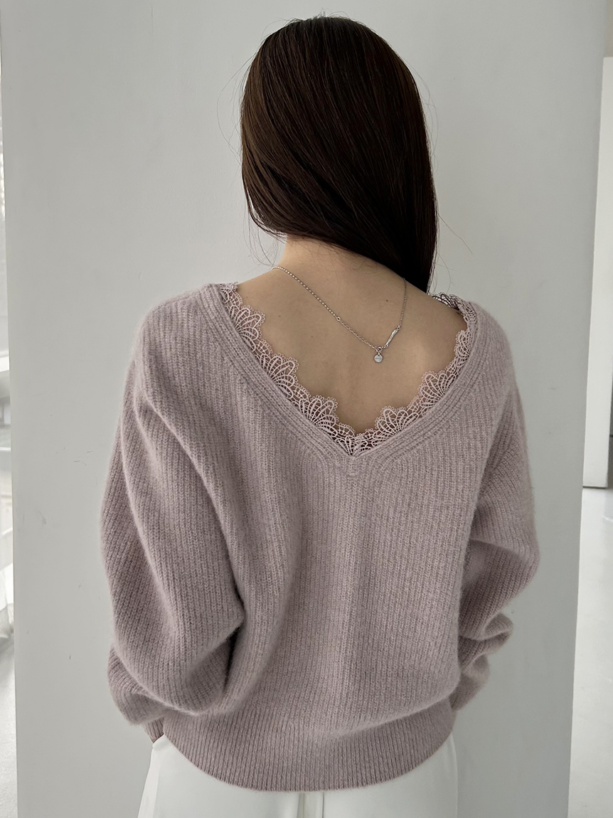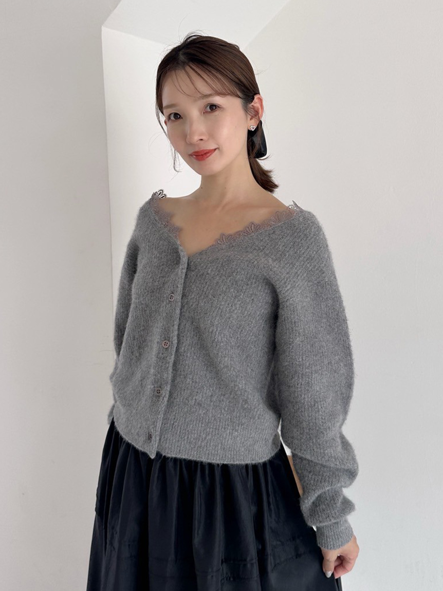 V領針織外套,領口與背部皆以精緻蕾絲修飾,增添女性柔美氣息。