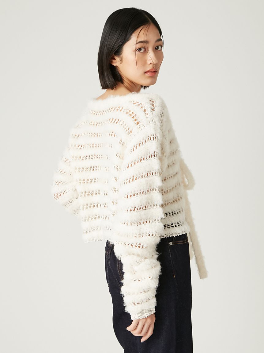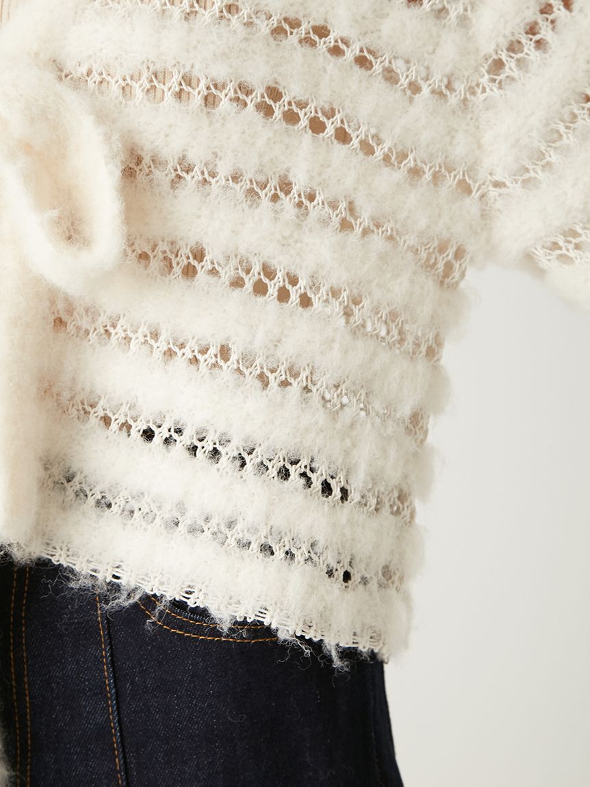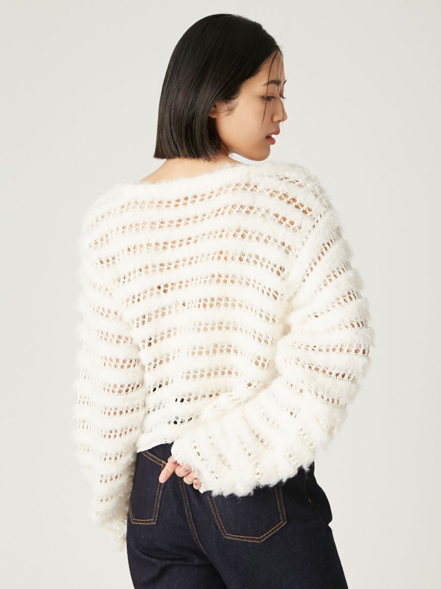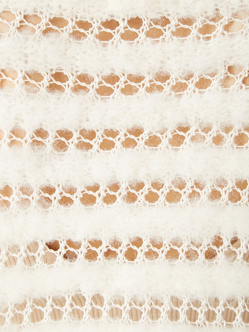 柔軟毛感與透膚網狀編織交錯成條紋,混搭異材質營造豐富層次感。