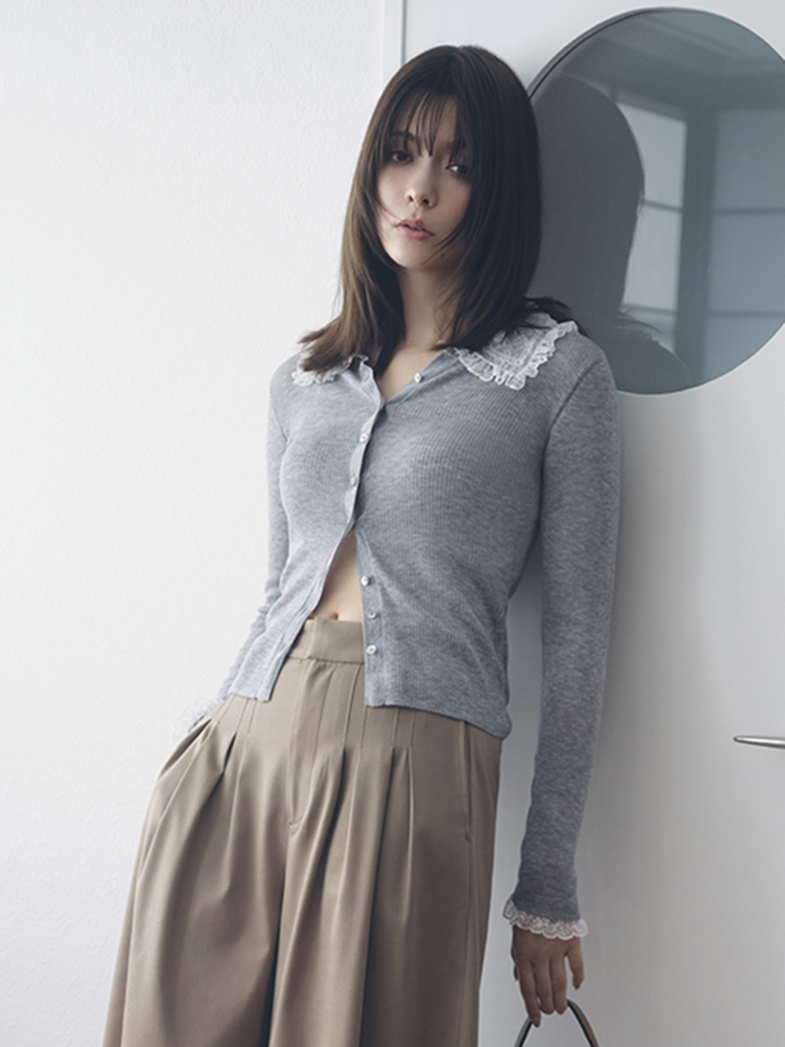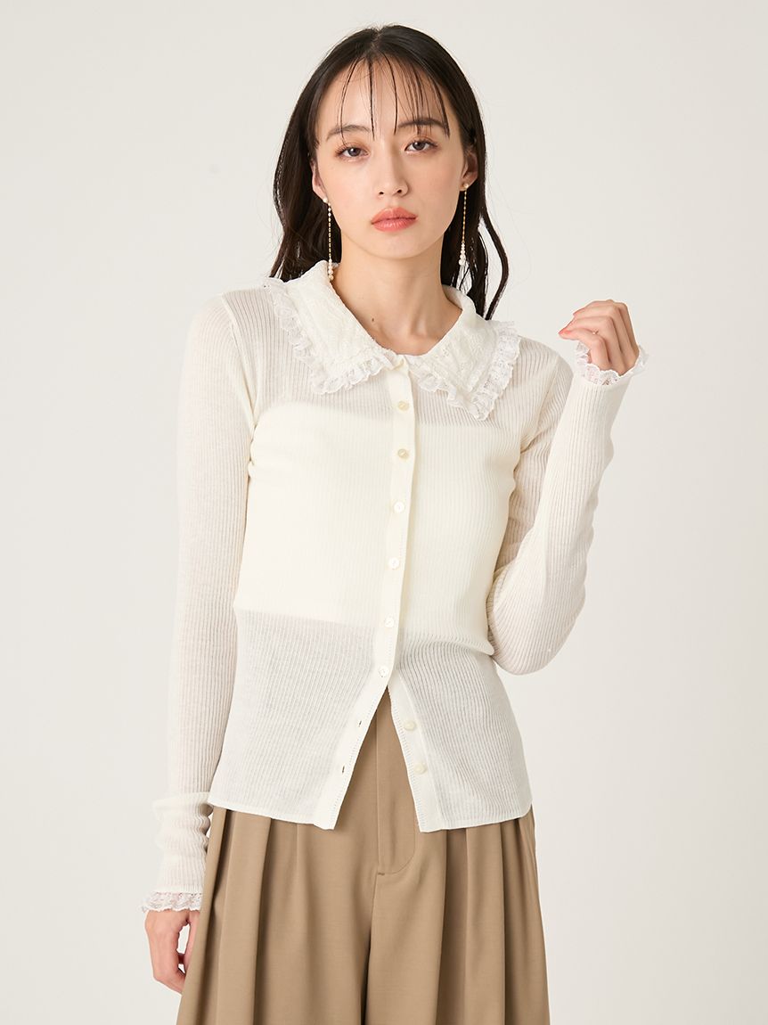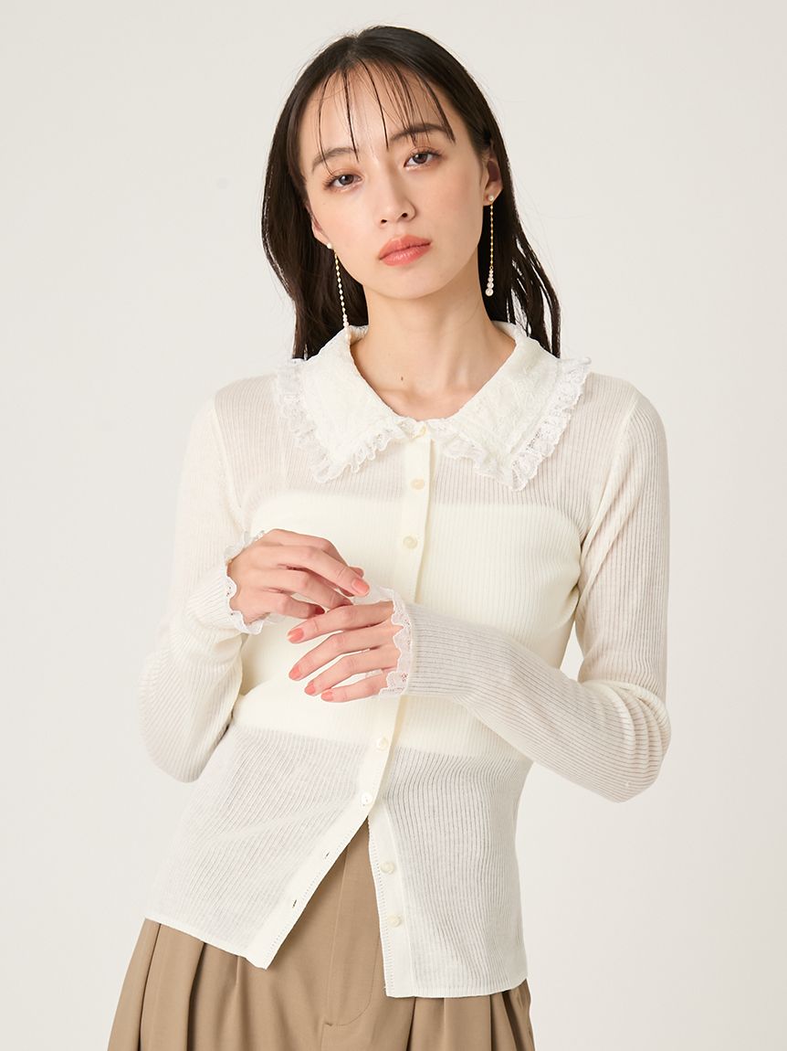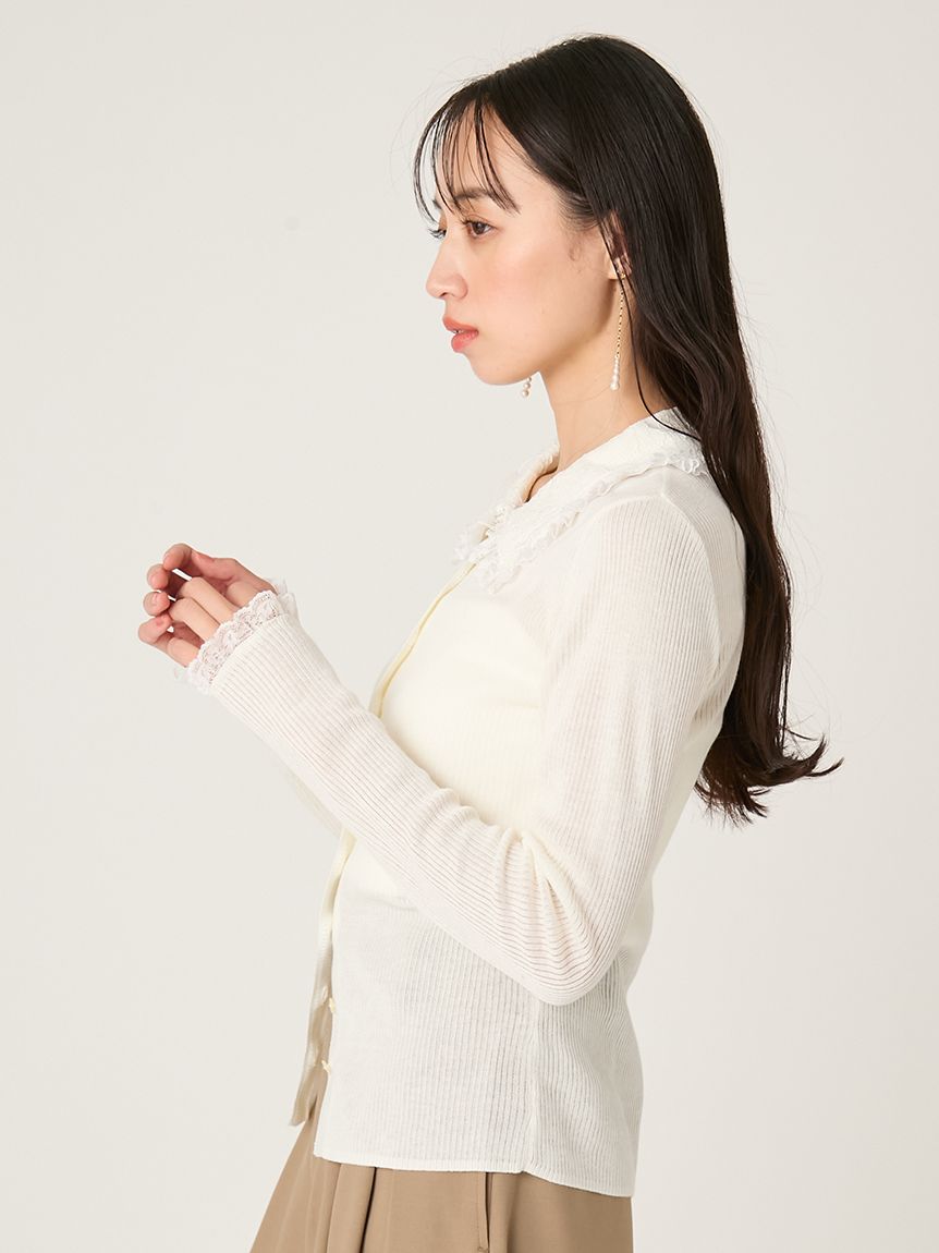 以半透感羅紋編織打造的修身針織外套,搭配蕾絲領設計。