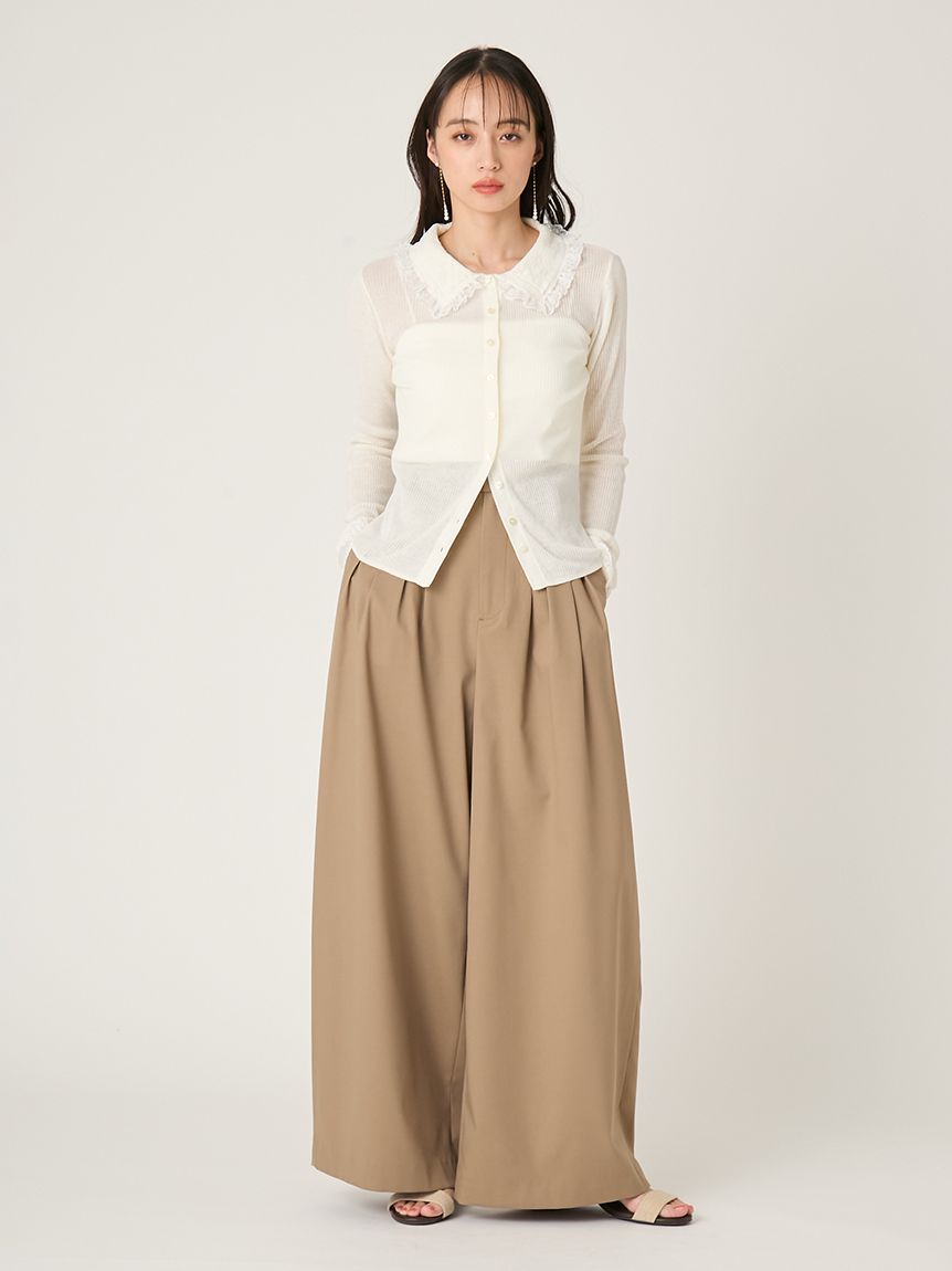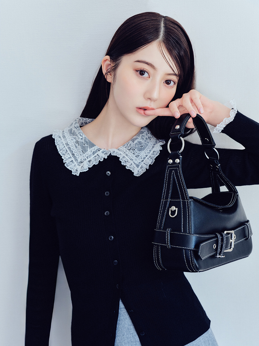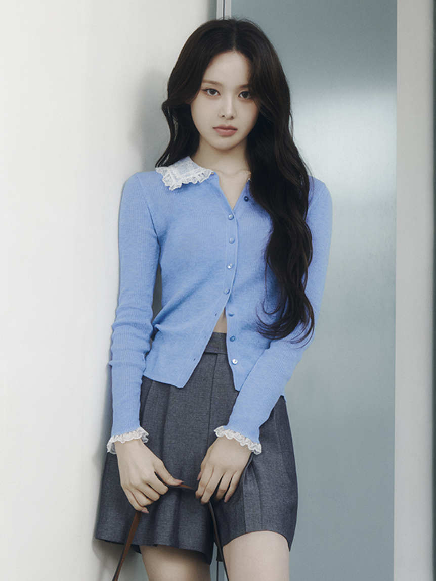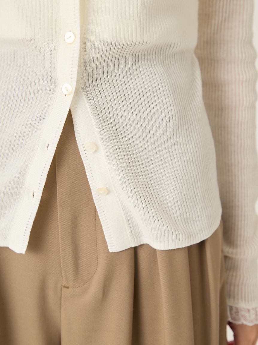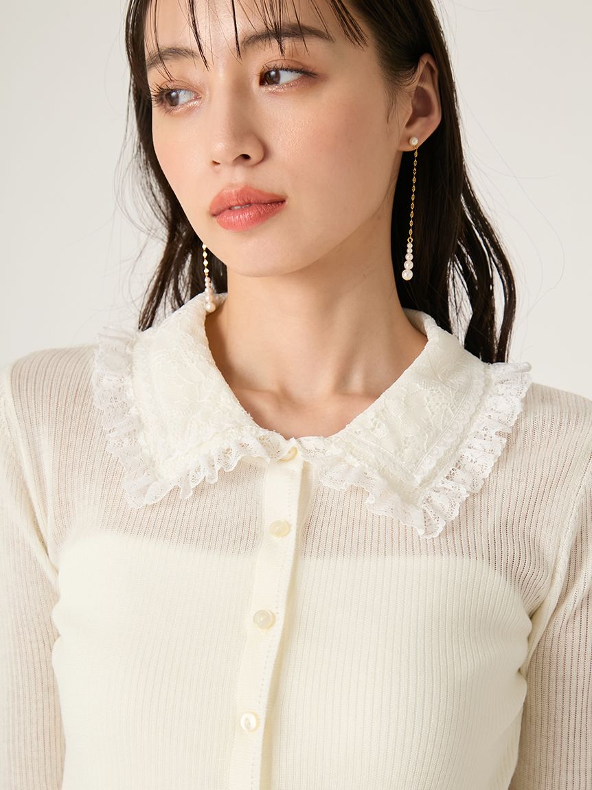 以半透感羅紋編織打造的修身針織外套,搭配蕾絲領設計。