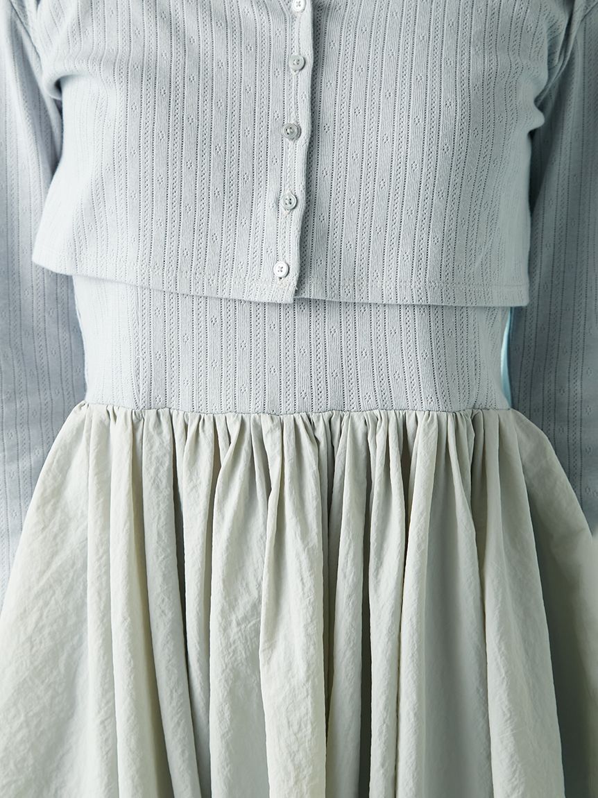 洋裝與外套的上身部分採用親膚針眼針織布,裙擺部分則使用具適中挺度的布帛材質,兼顧版型感與舒適度。