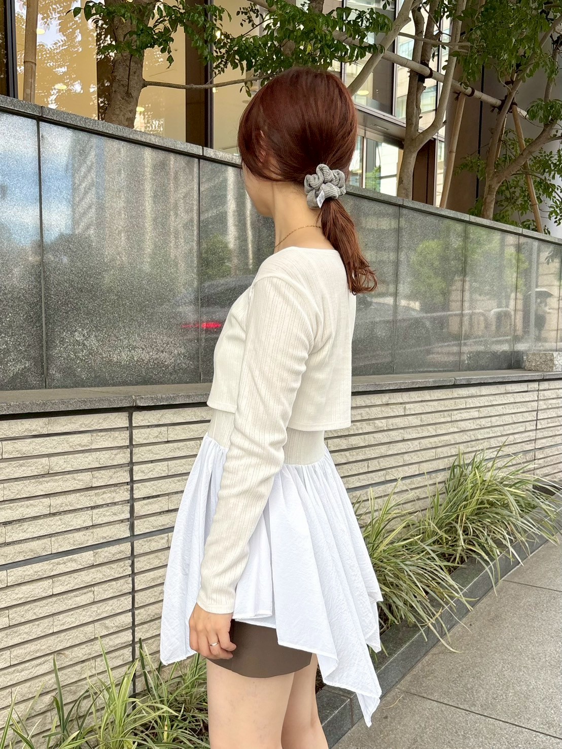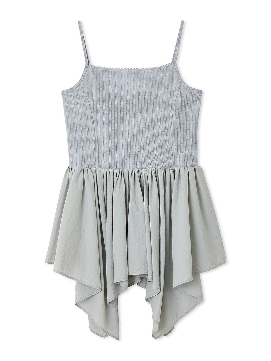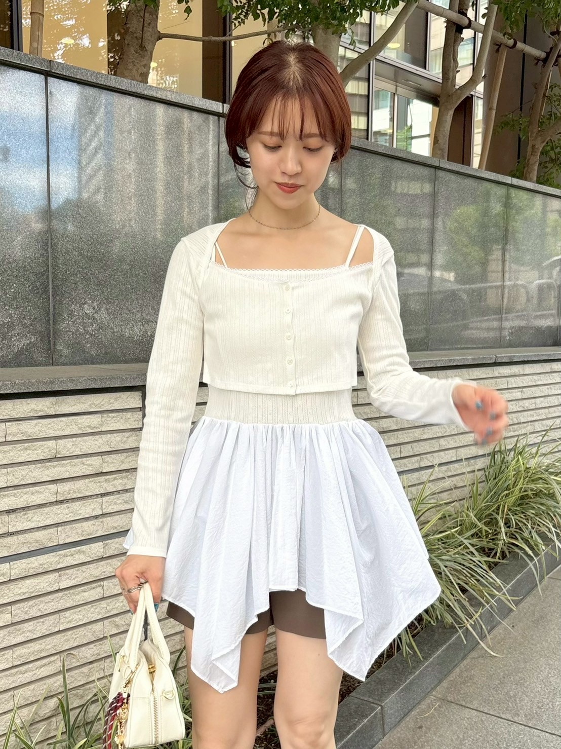 以荷葉下擺設計為亮點的迷你背心洋裝,搭配短版針織外套的套裝組合,輕鬆營造穿搭層次感。