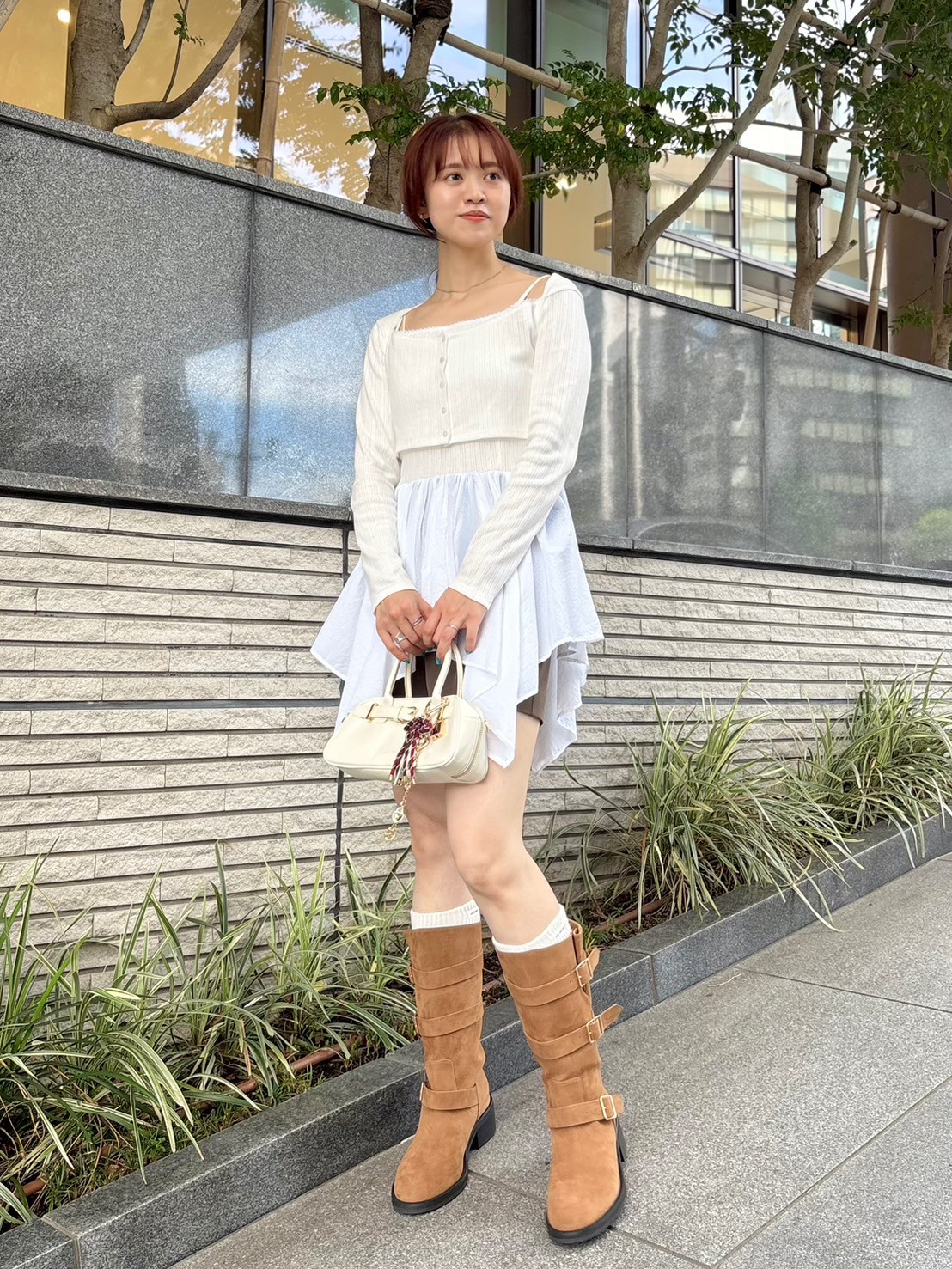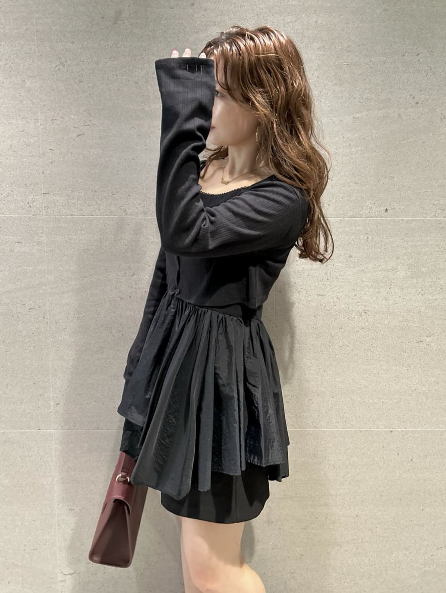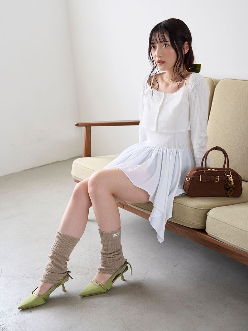 以荷葉下擺設計為亮點的迷你背心洋裝,搭配短版針織外套的套裝組合,輕鬆營造穿搭層次感。