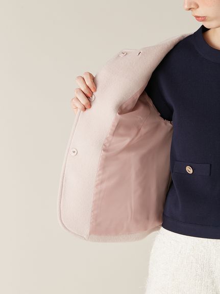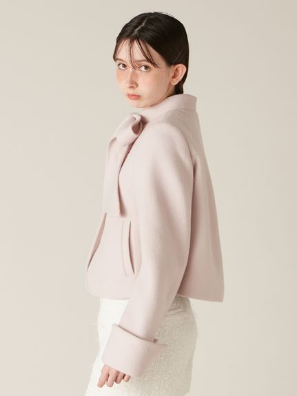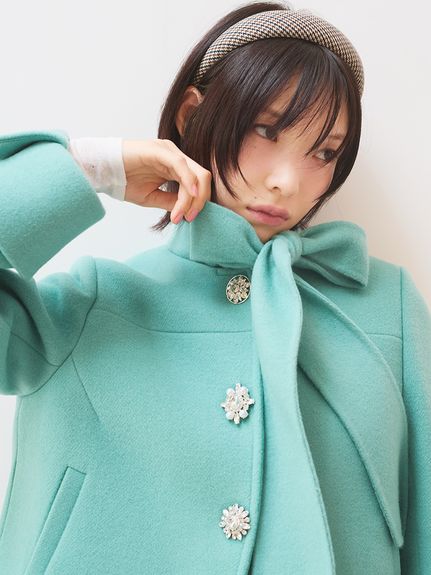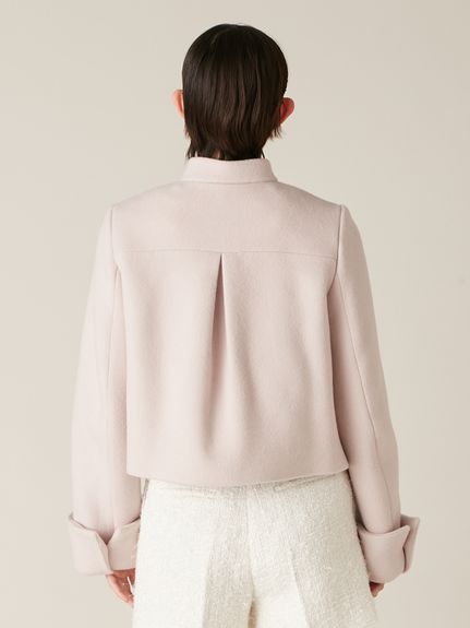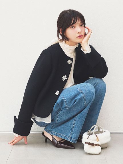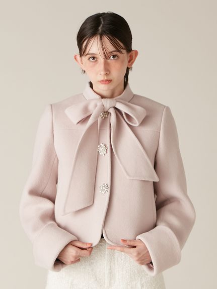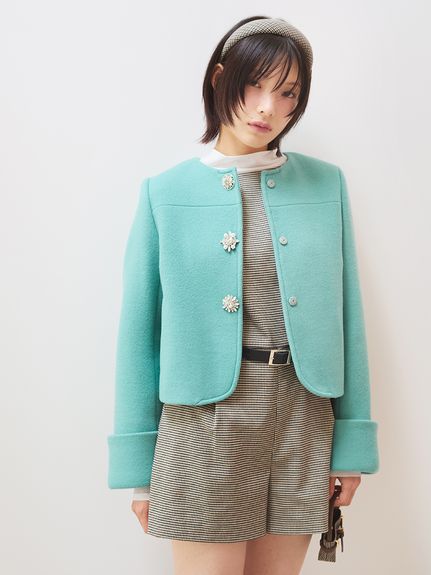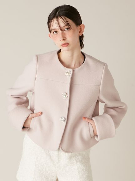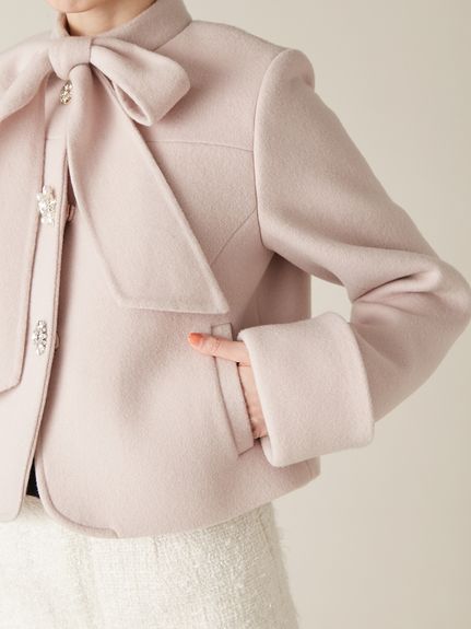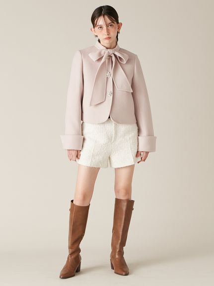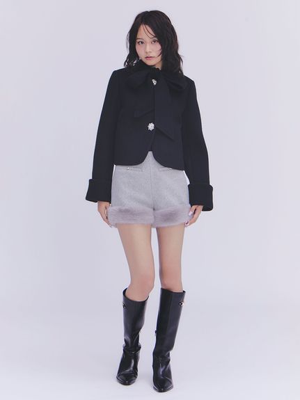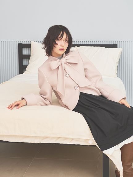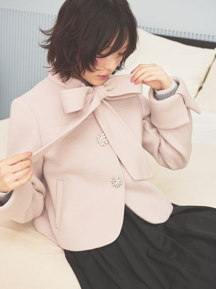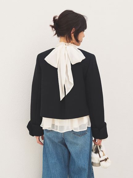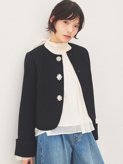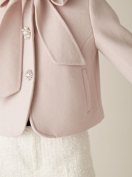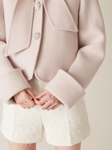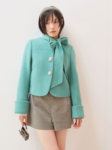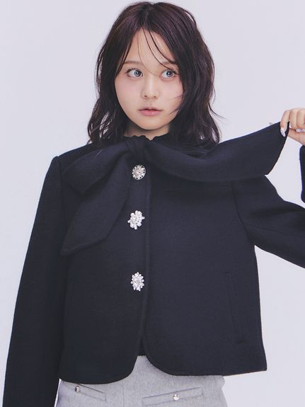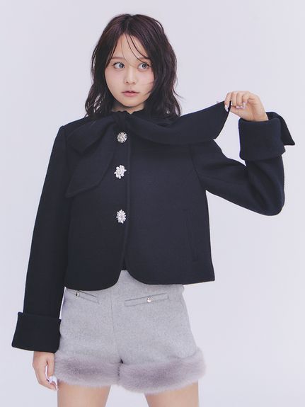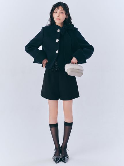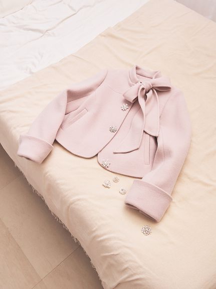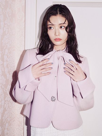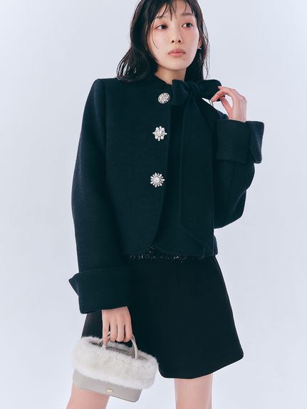 以大顆不同造型的水鑽增添華麗感,打造主角感十足的短版外套。可拆式領口蝴蝶結設計,拆下即可變身無領短外套,隨心變換造型。微短的衣長營造修飾比例的俐落感,輕盈舒適的穿著感宛如小外套般靈活,不論日常或特別場合皆能駕馭。