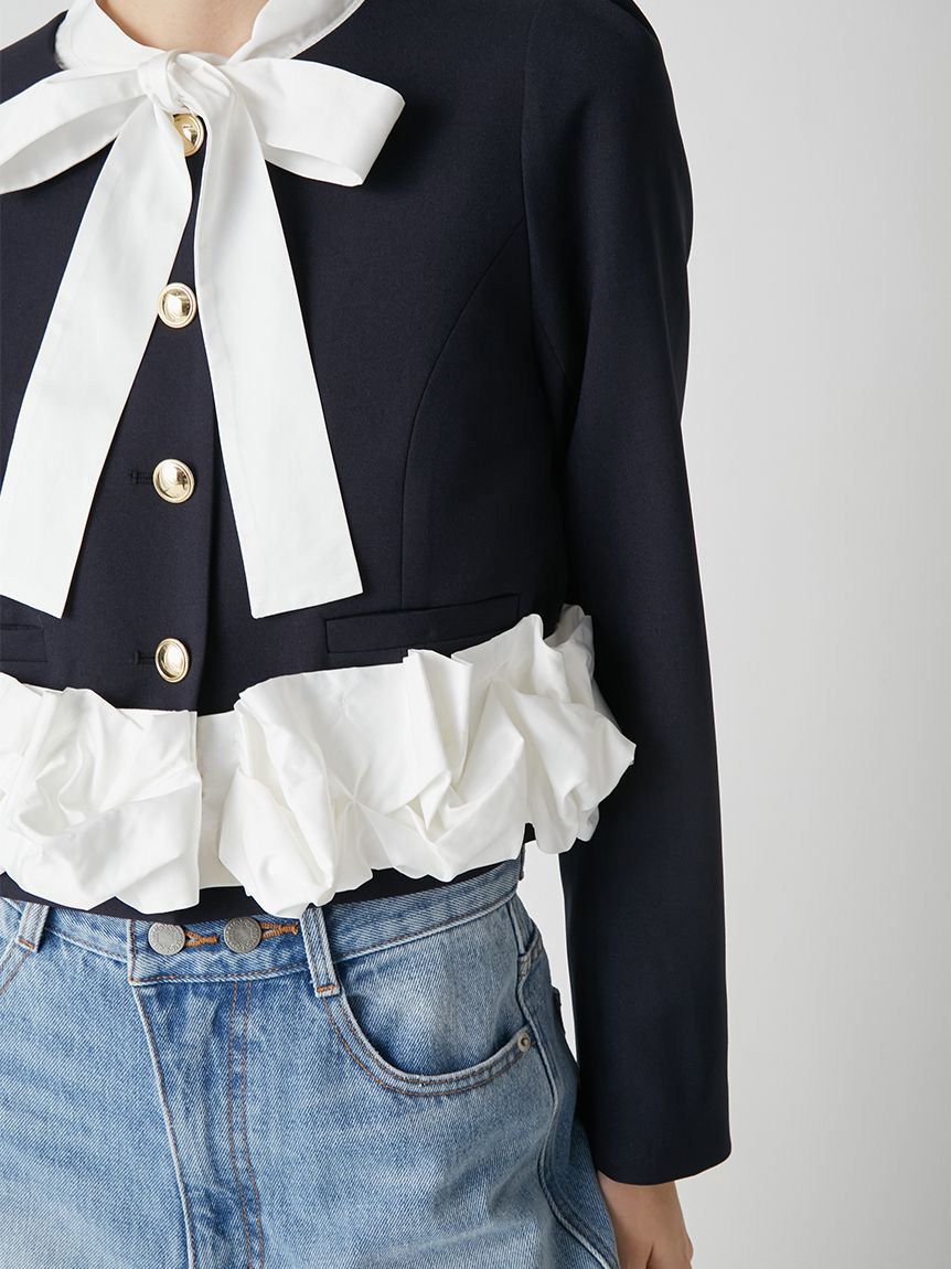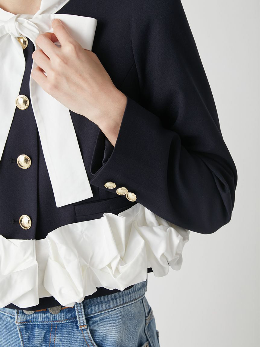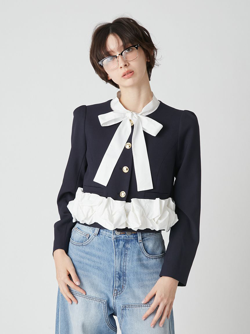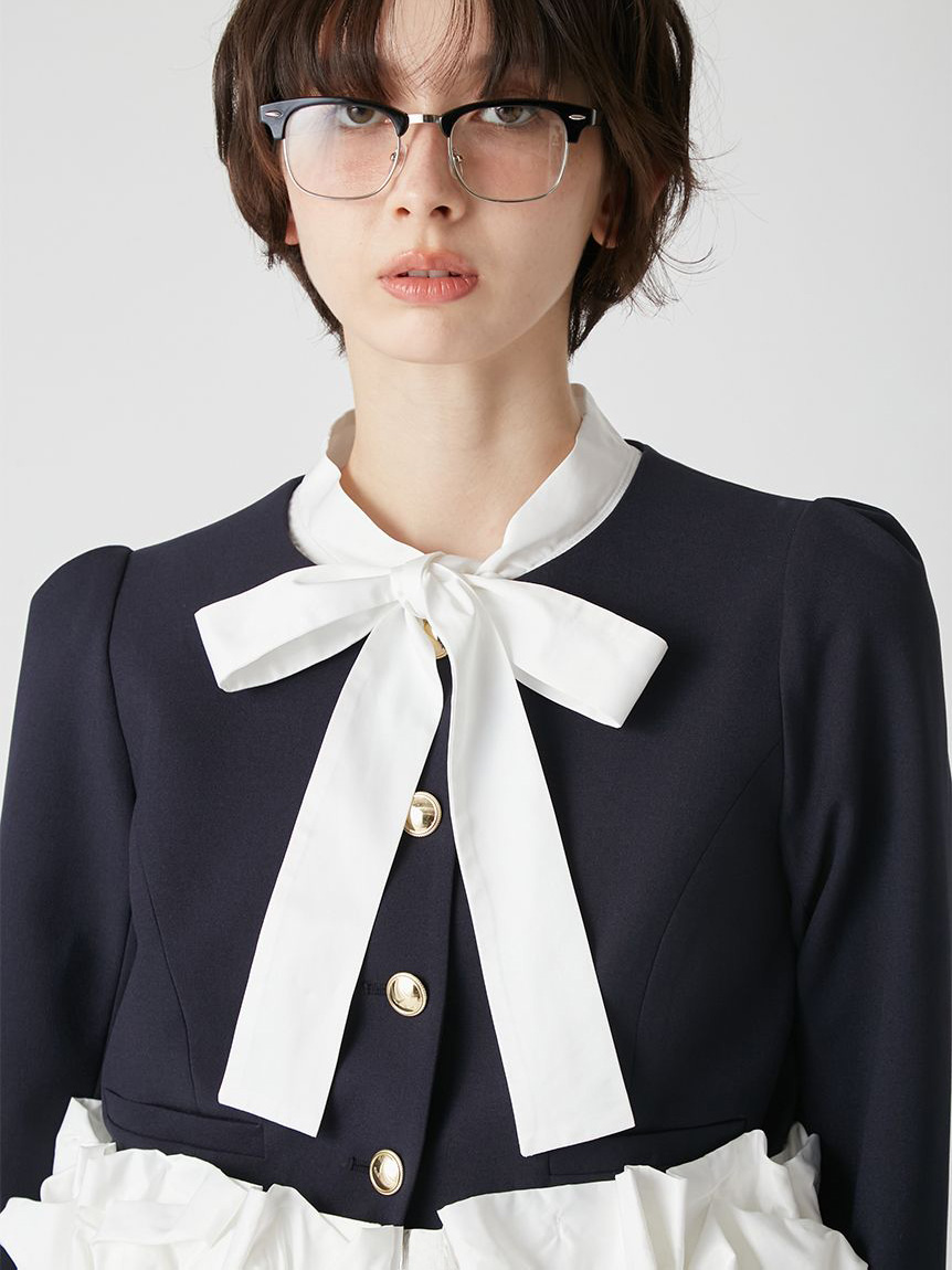 無領外套拼接了緞面蝴蝶結與荷葉邊,散發出經典氛圍的一件單品。