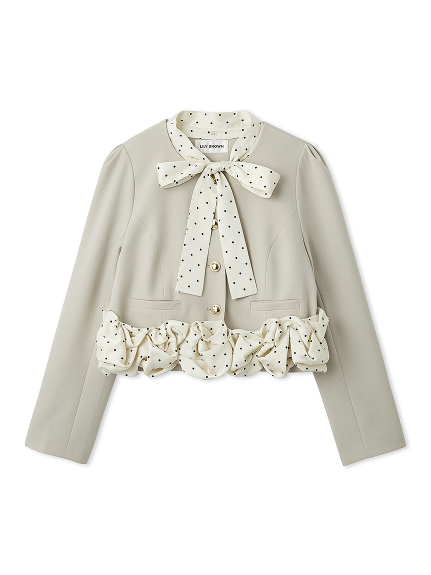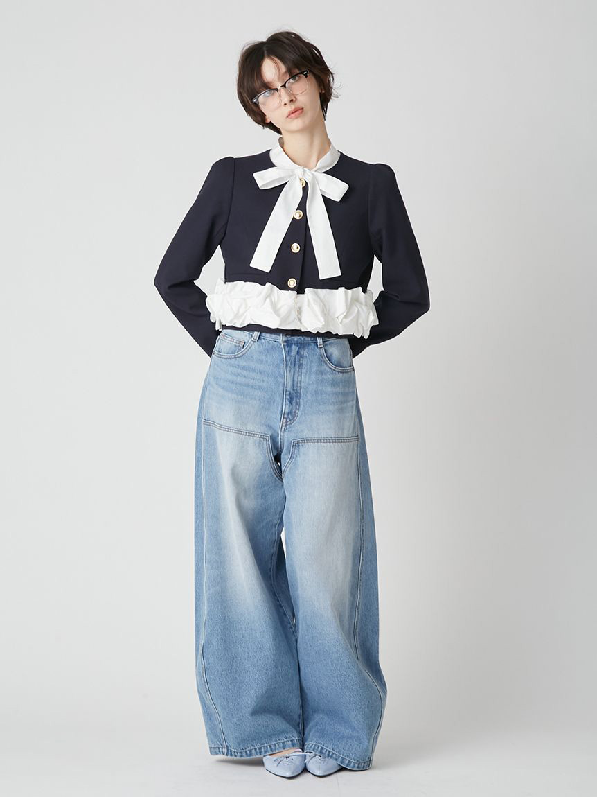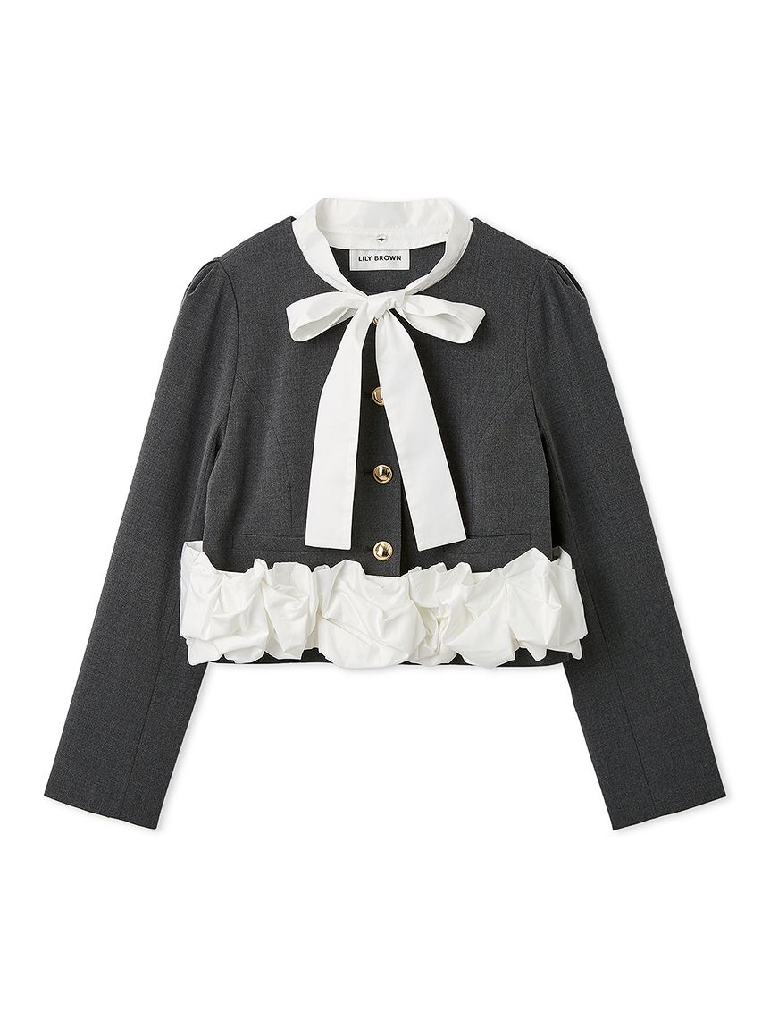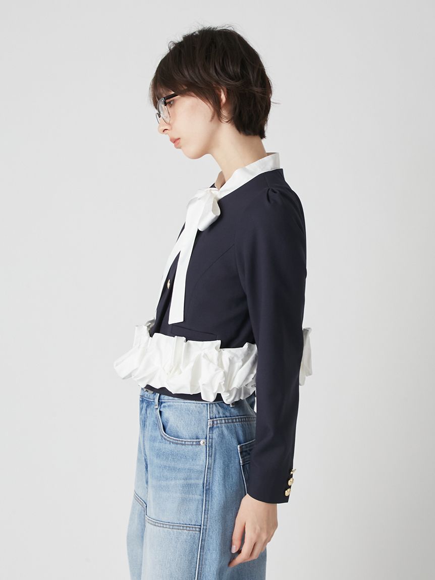 無領外套拼接了緞面蝴蝶結與荷葉邊,散發出經典氛圍的一件單品。