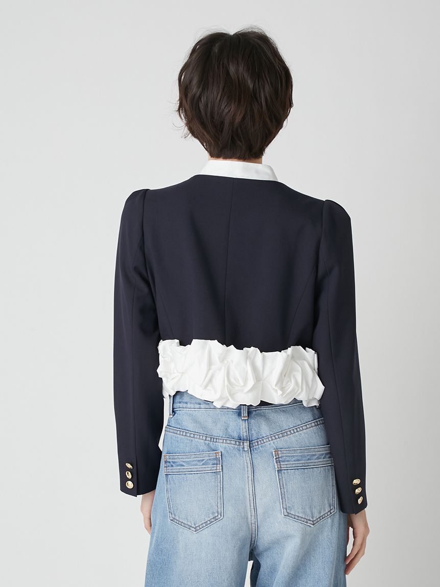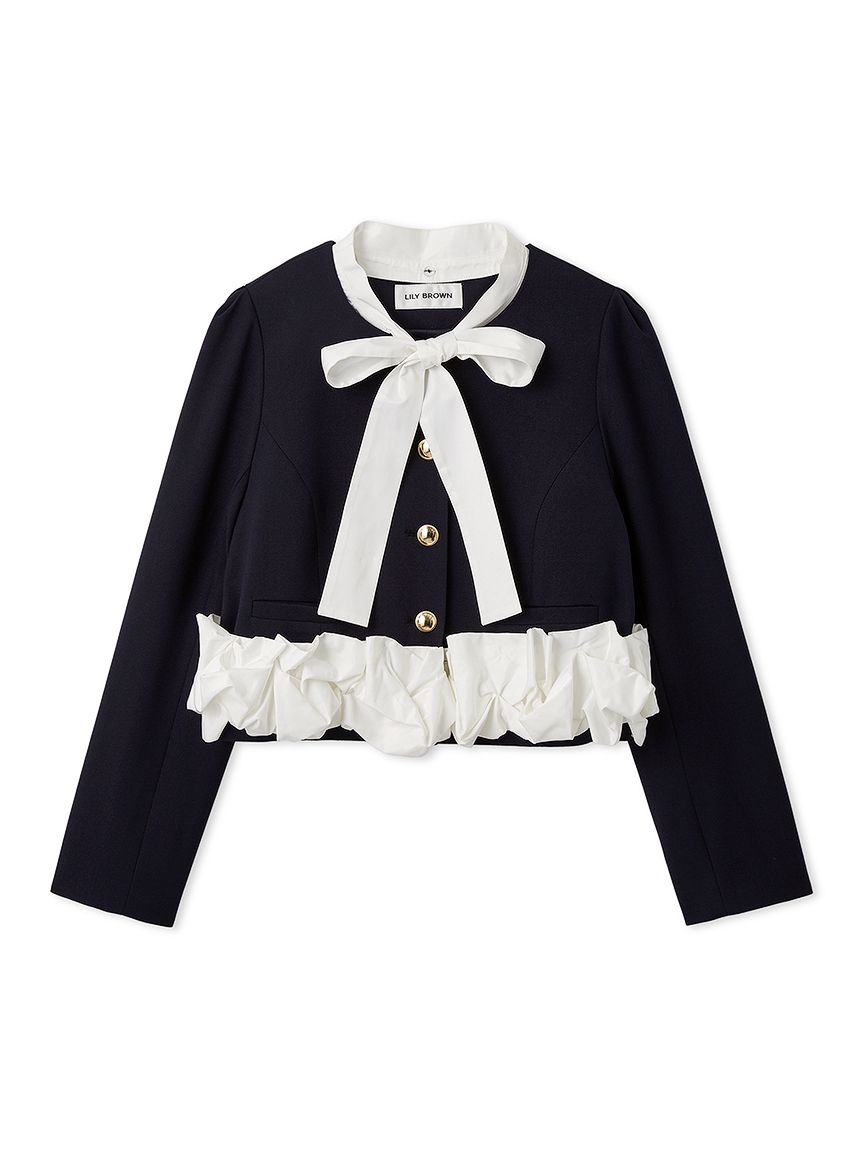 【蝴蝶結與荷葉邊增添華麗感的拼接無領外套】
