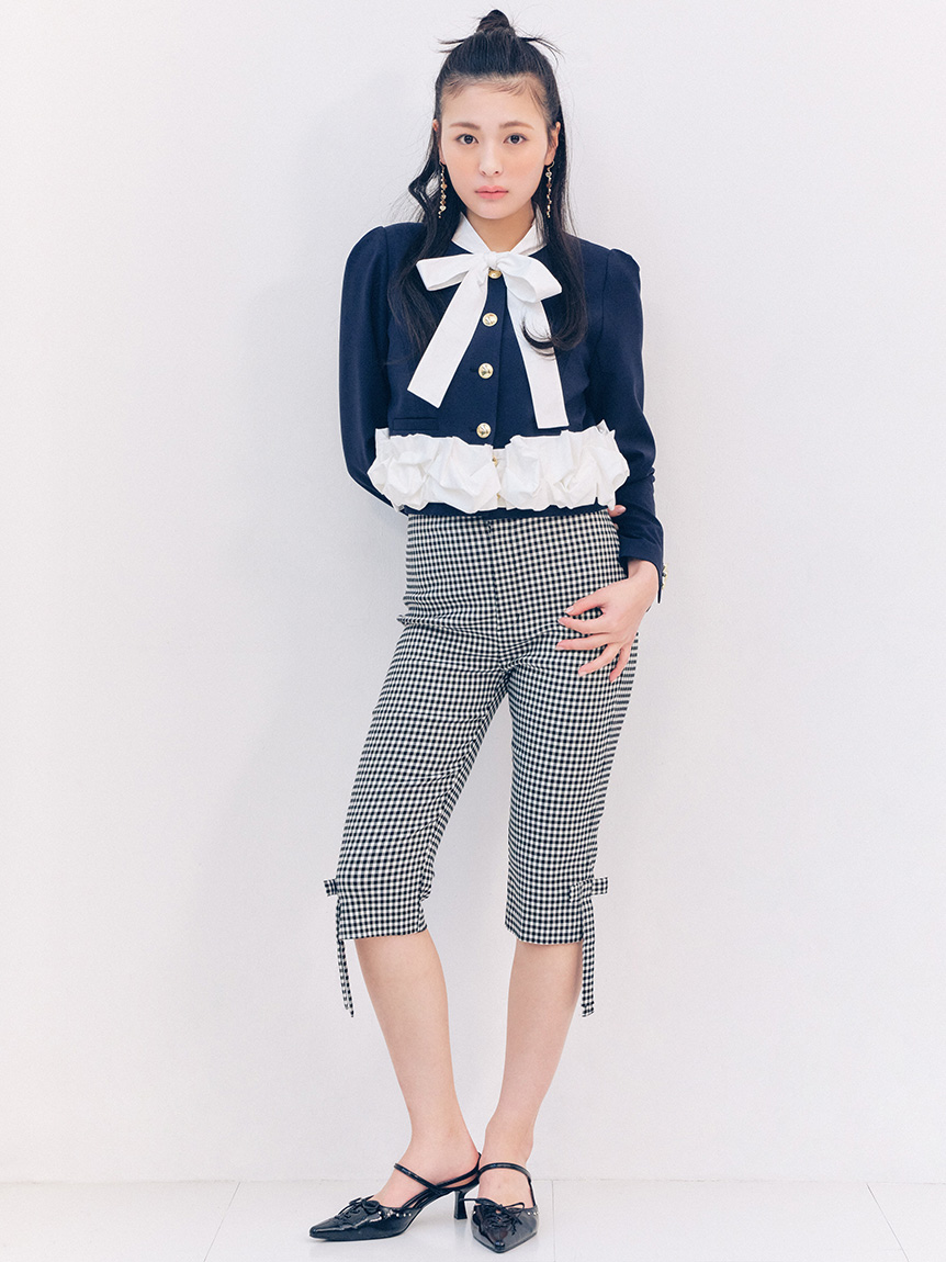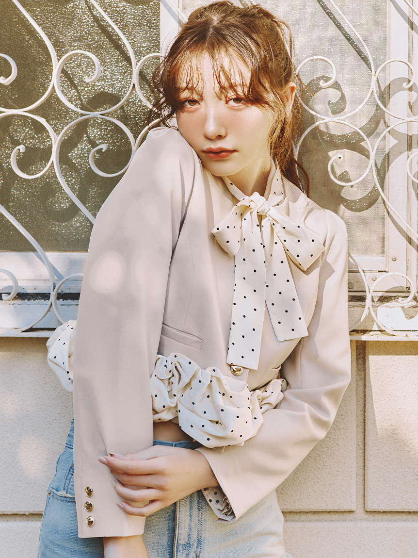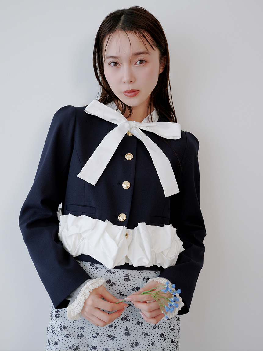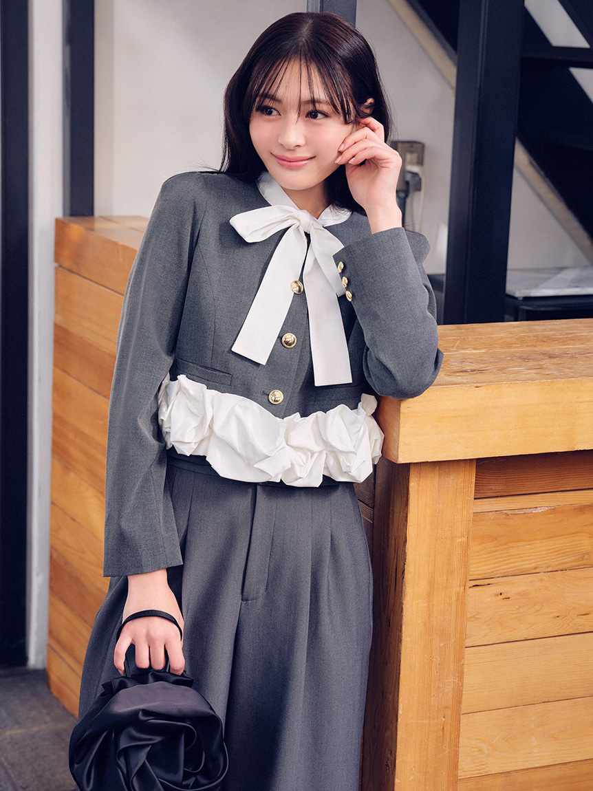 蝴蝶結與金色鈕扣的精緻細節,搭配荷葉邊引人注目的華麗感,一件就能完成有存在感的造型。