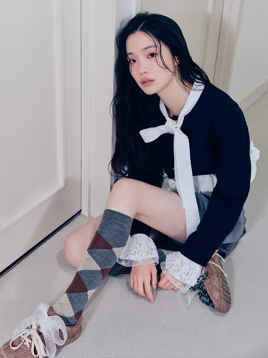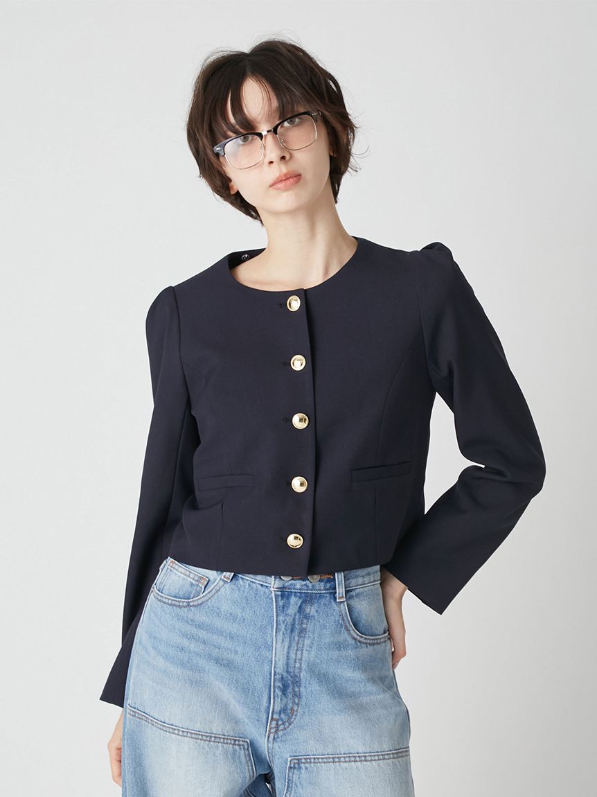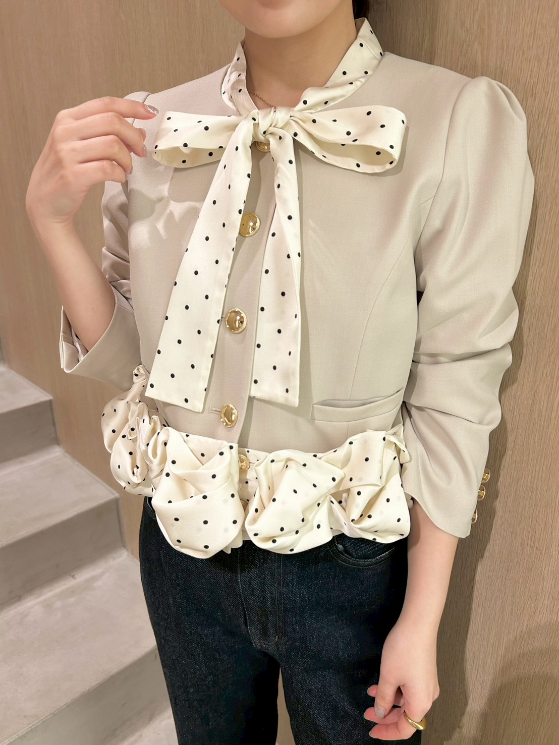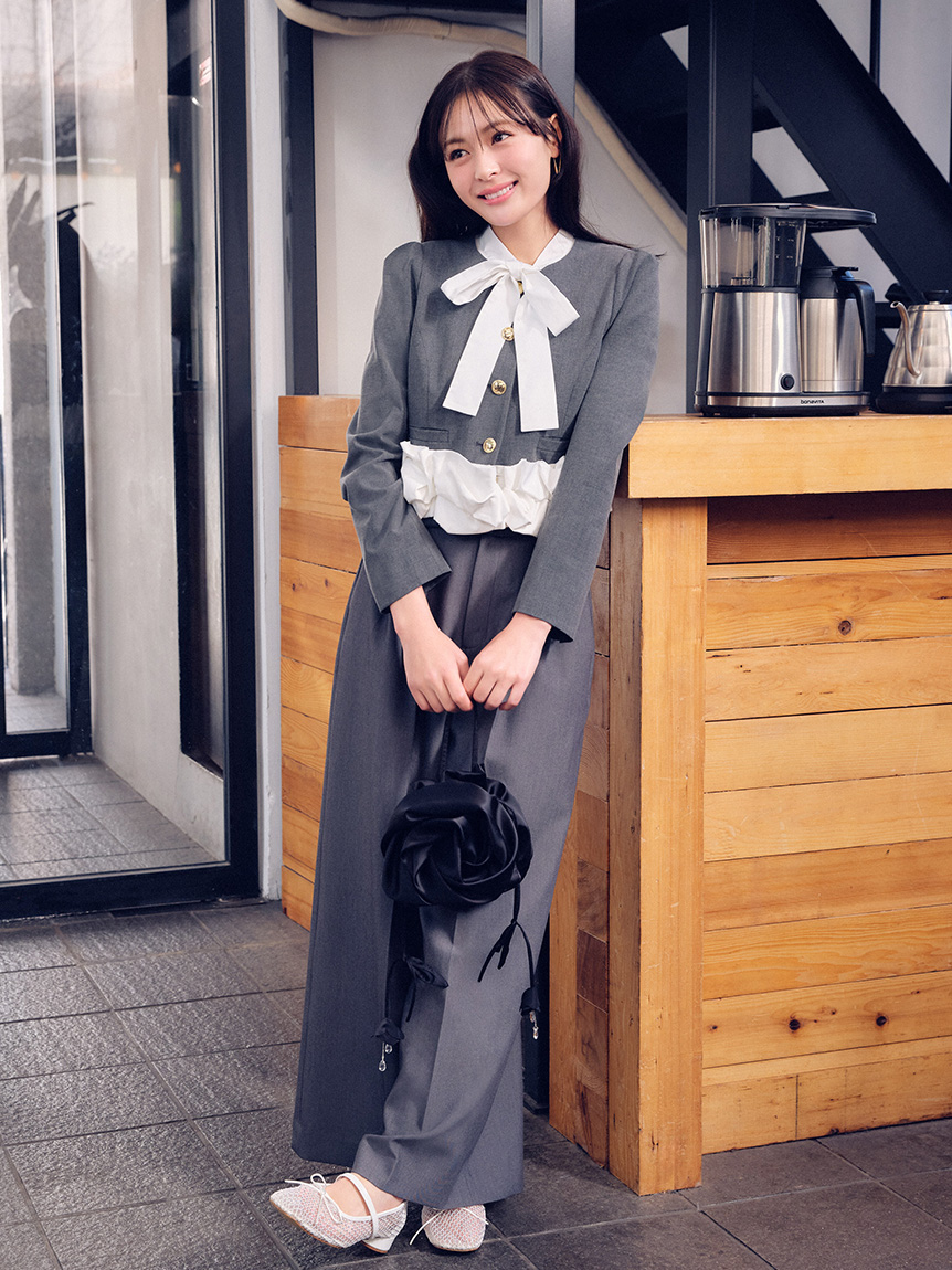 蝴蝶結與金色鈕扣的精緻細節,搭配荷葉邊引人注目的華麗感,一件就能完成有存在感的造型。