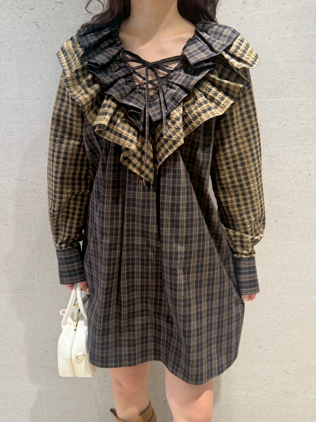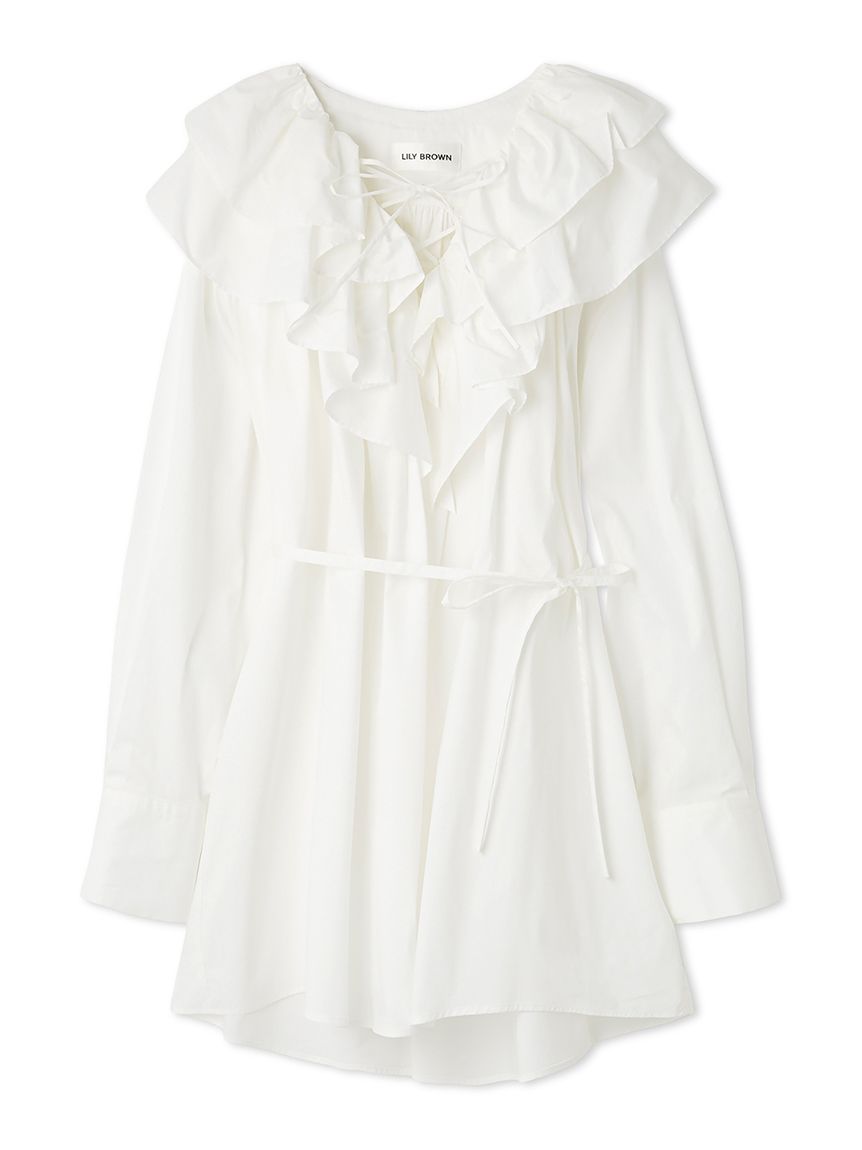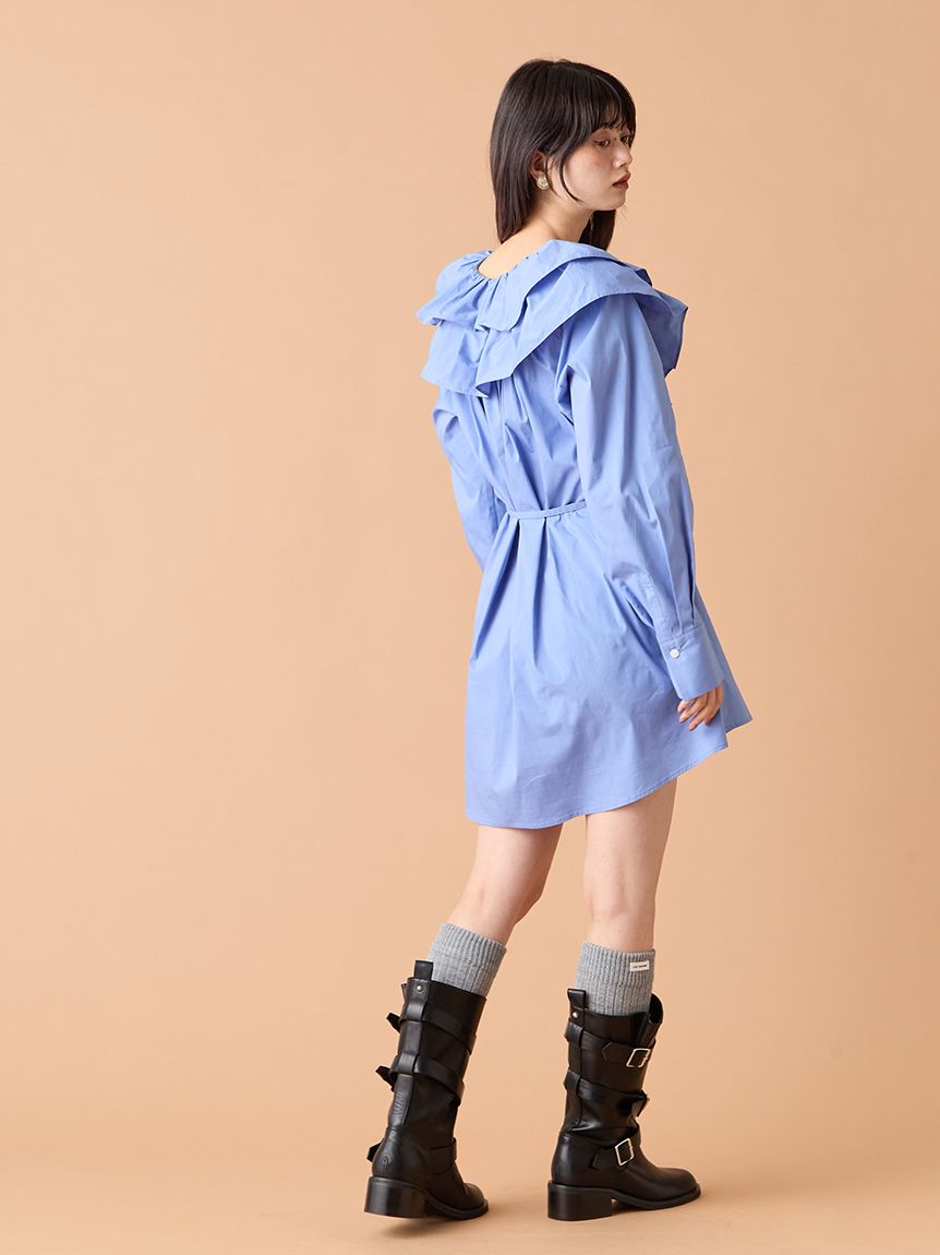 領口豐富的荷葉邊設計,為臉部周圍增添華麗感的迷你洋裝。採用適度挺度的襯衫布料,帶出輕甜而不過於甜美的休閒感。