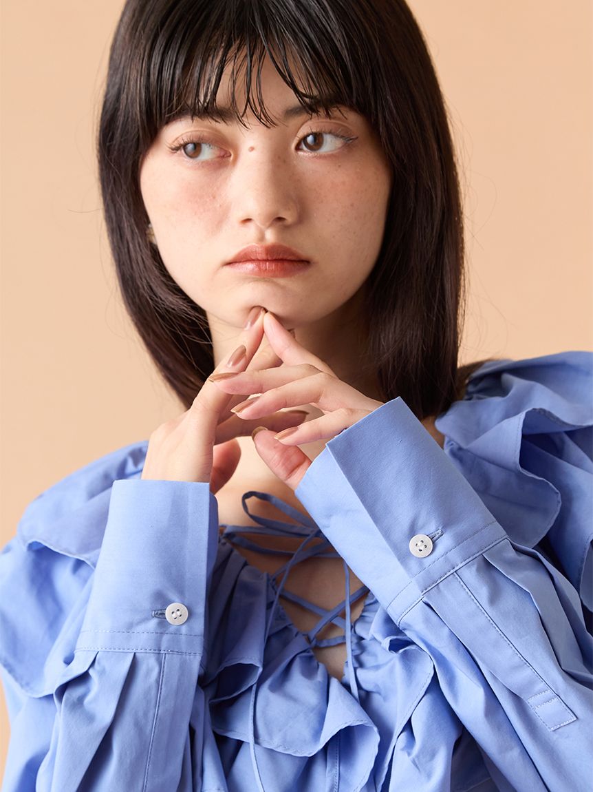 選用適度挺度的襯衫布料,立體荷葉邊細節更加鮮明,即使單穿也能展現存在感與造型魅力。