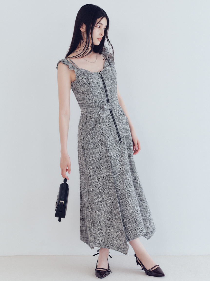 兼具女性魅力與時尚感,存在感十足的連身裙。束腰風剪裁與前襟拉鍊設計令人印象深刻,胸前採用層疊式細節營造立體感。不規則下襬增添動態與個性,單穿即能完成整體造型的主角級單品。