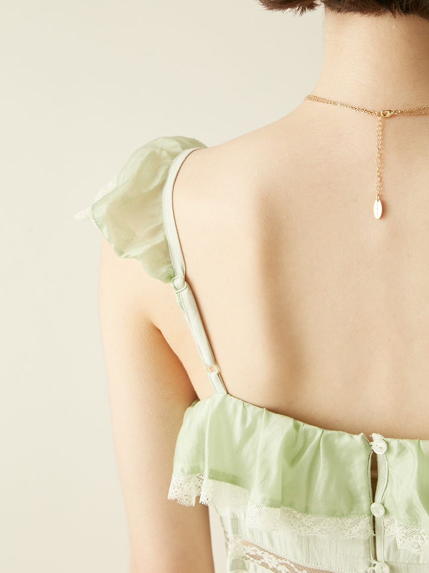 棉料與透膚材質異材質拼接,呈現豐富表情。適度透膚與輕盈感,非常適合季節交替時穿著。