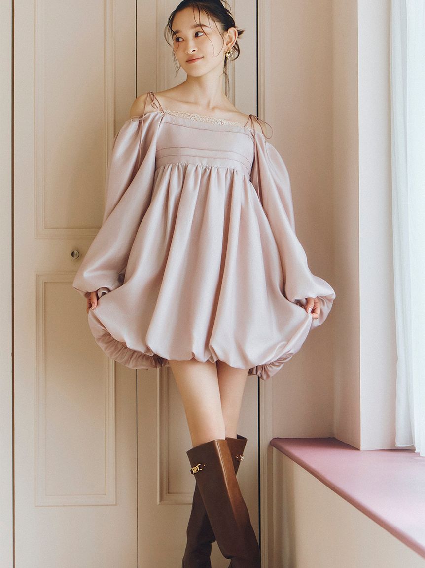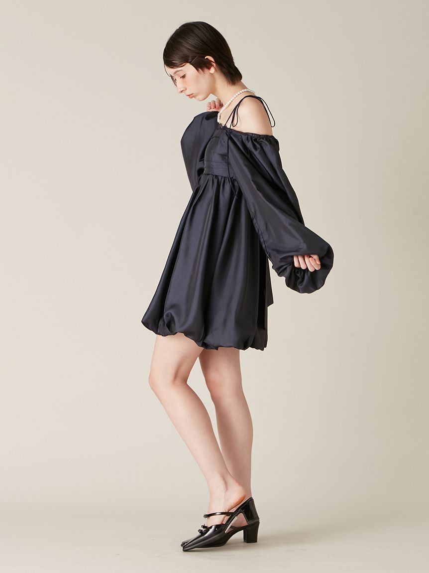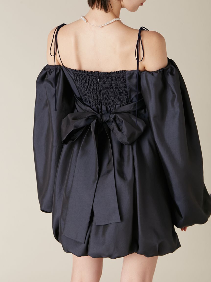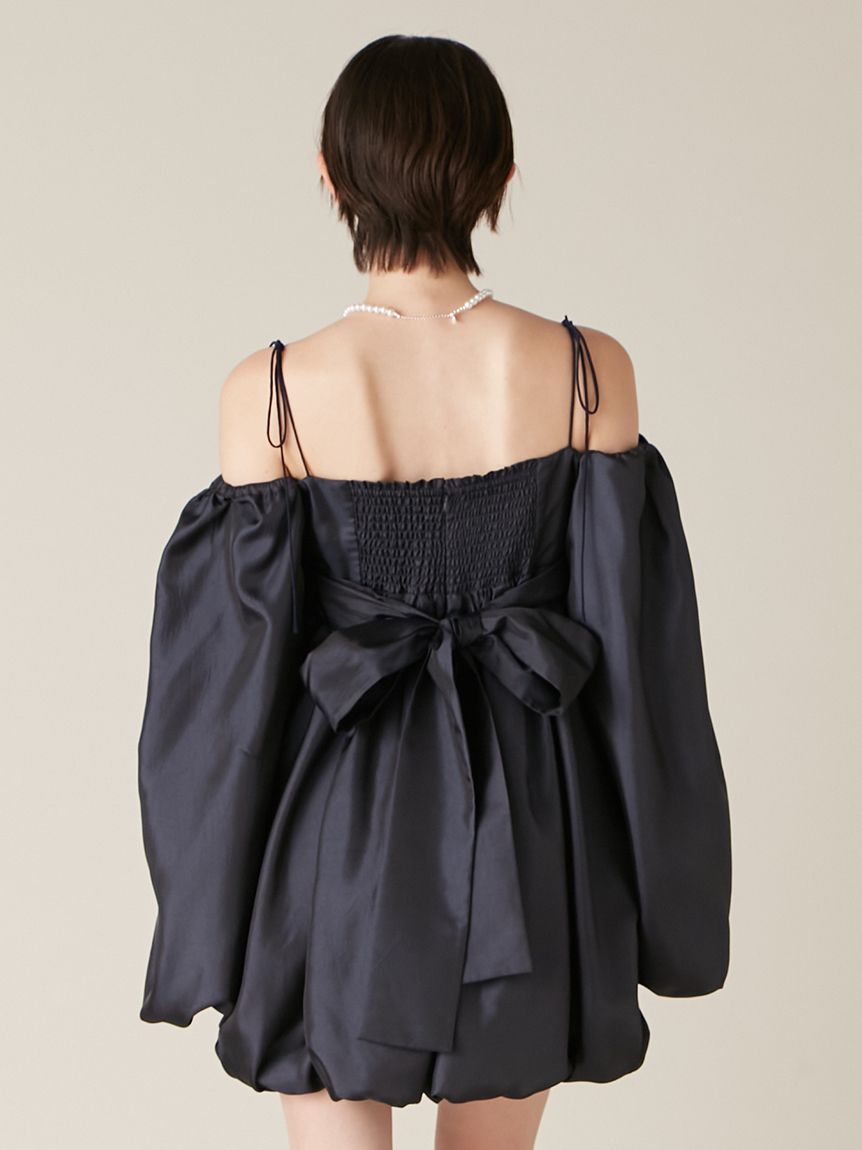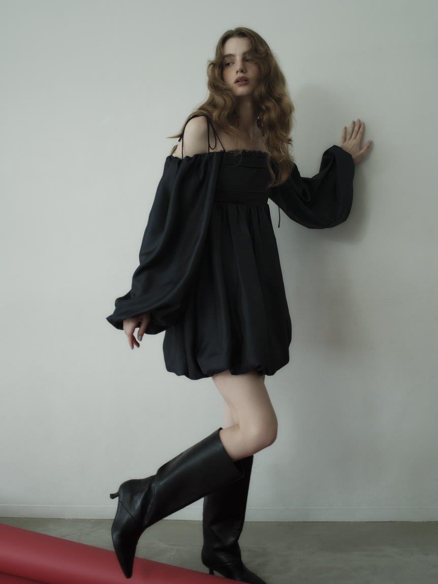 融合摩登氛圍與細膩甜美感的迷你洋裝。採用帶有復古加工的斜紋布材質,呈現自然光澤與挺度,營造出優雅且具存在感的輪廓。腰間點綴份量感十足的蝴蝶結,增添柔和氣息。亦可將袖子微微下拉,打造一字領露肩穿法,展現更鮮明的時尚氛圍。