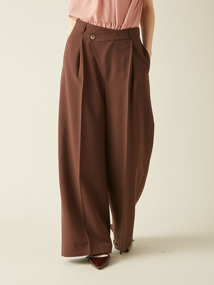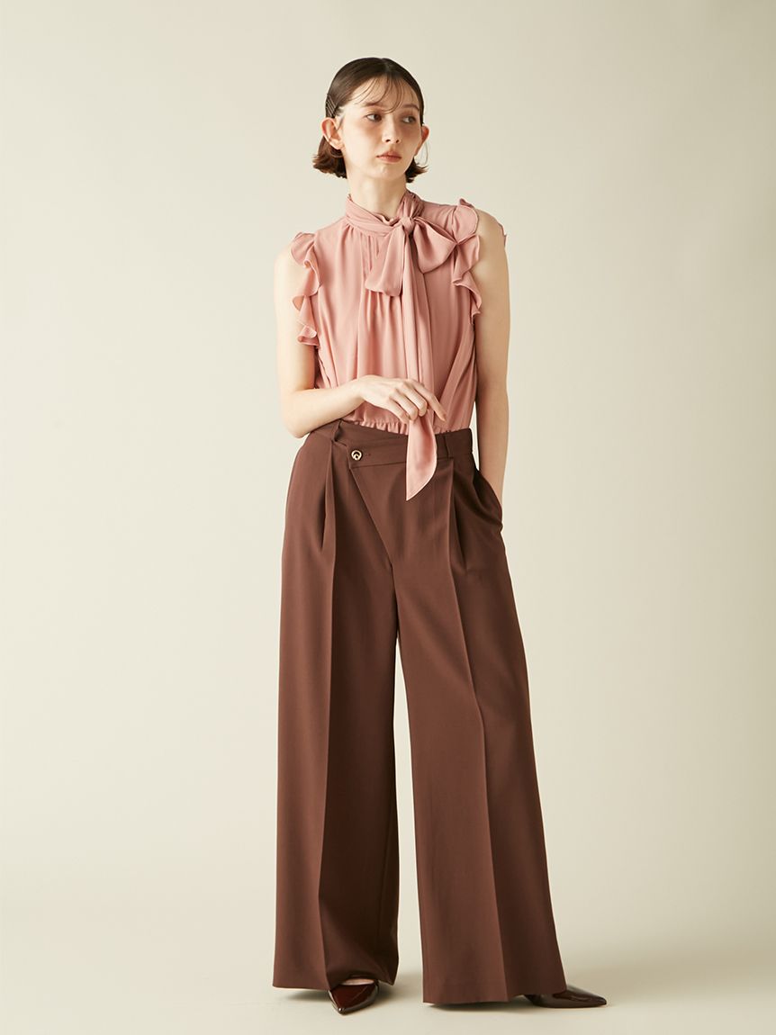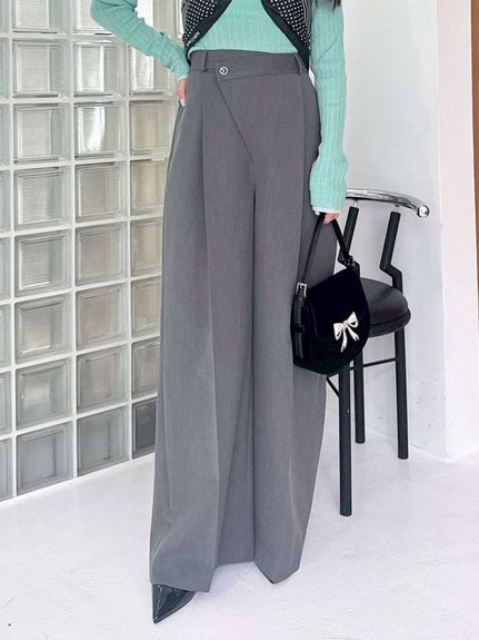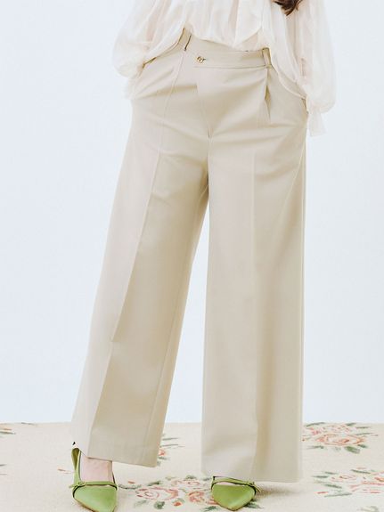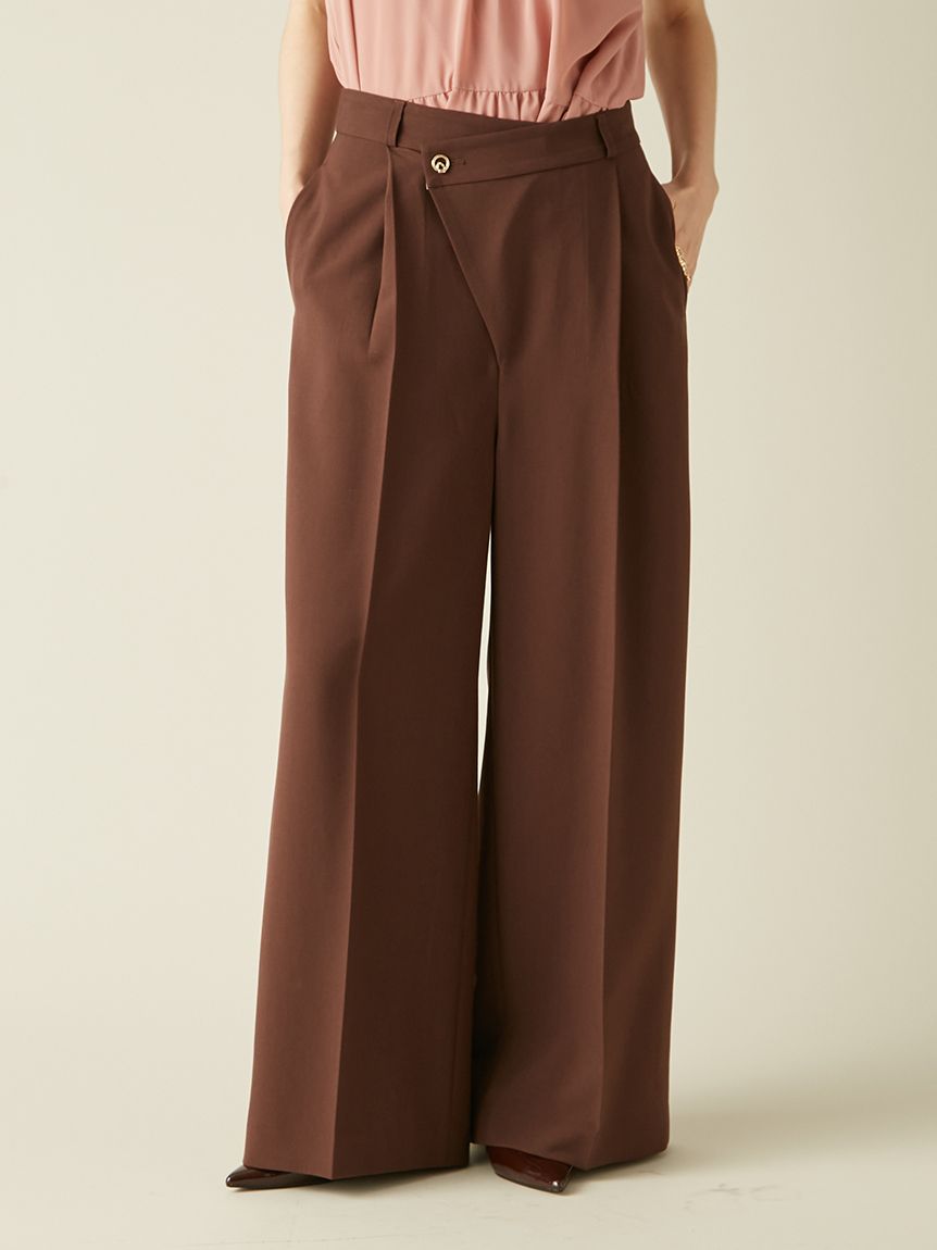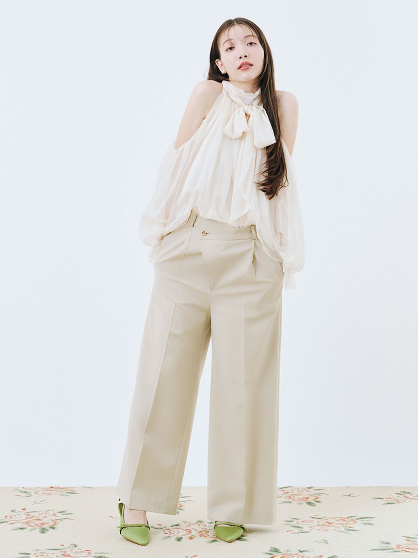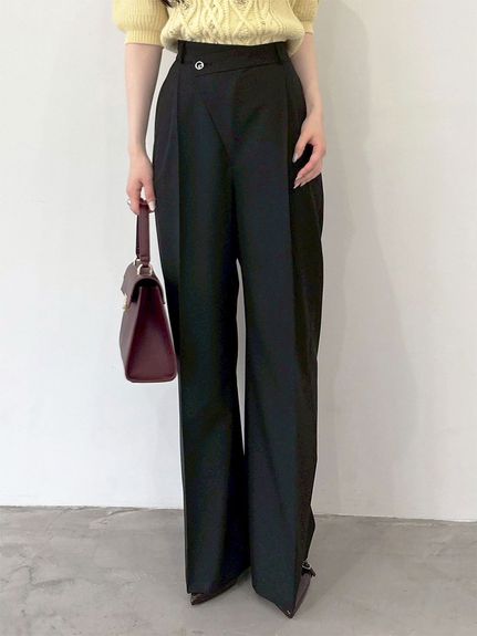 「LILY BROWN」推出的塔克寬褲,以俐落修長的寬版剪裁展現優雅氣場。不對稱腰頭結合隱約點綴的裝飾釦,為經典版型注入本季的摩登元素。