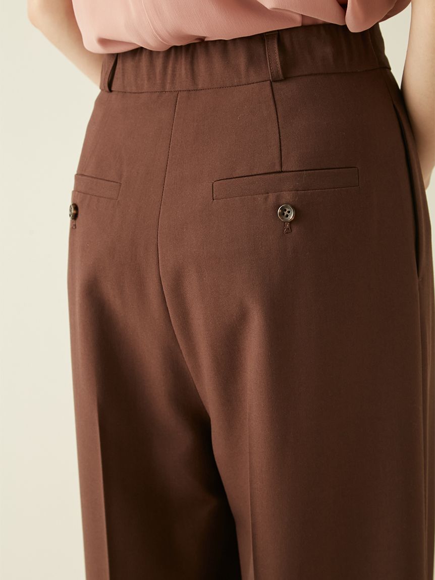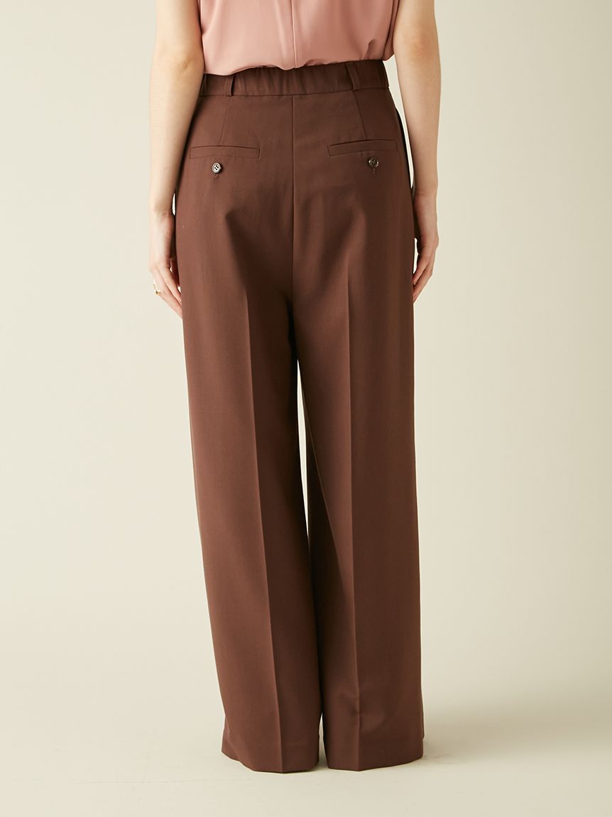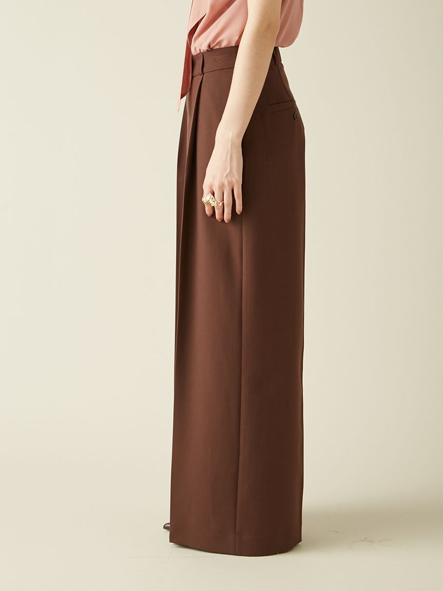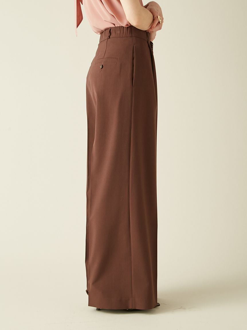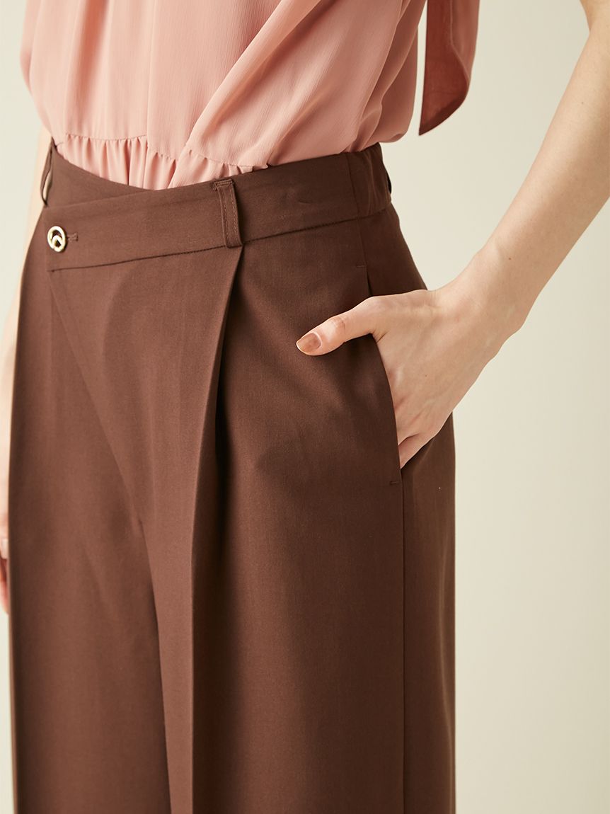「LILY BROWN」推出的塔克寬褲,以俐落修長的寬版剪裁展現優雅氣場。不對稱腰頭結合隱約點綴的裝飾釦,為經典版型注入本季的摩登元素。