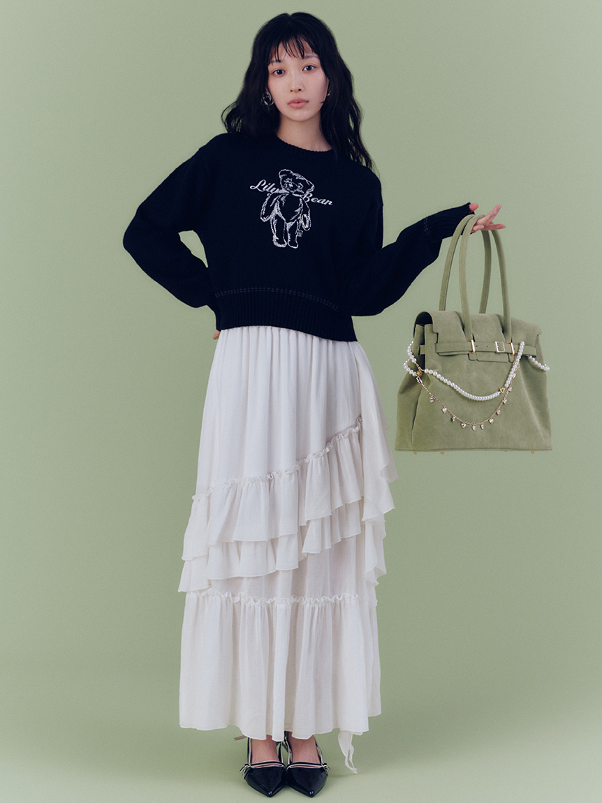 運用大量荷葉邊與褶飾,營造出隨著動作而變化的立體層次感。裙身線條帶有恰到好處的垂墜感,不會過度蓬鬆,在甜美與洗鍊之間取得完美平衡。