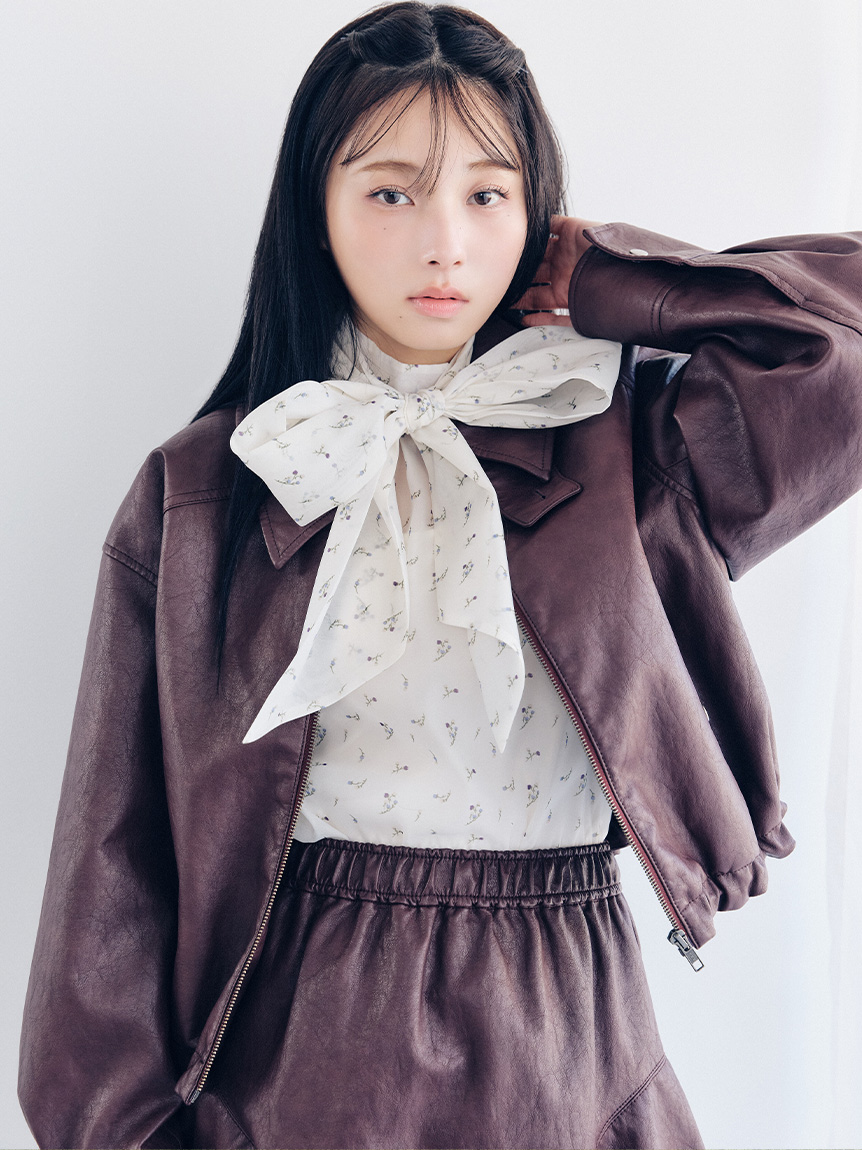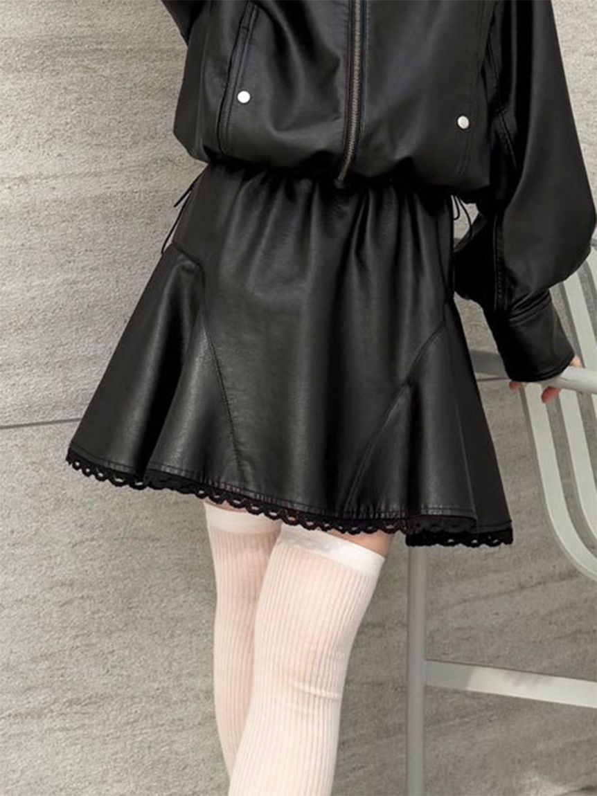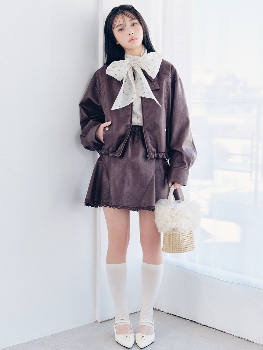 與拉鍊外套(品號LWFJ261101)同材質打造的喇叭迷你裙。