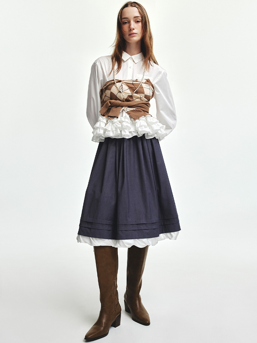 【下擺荷葉設計成為亮點的華麗剪裁襯衫】