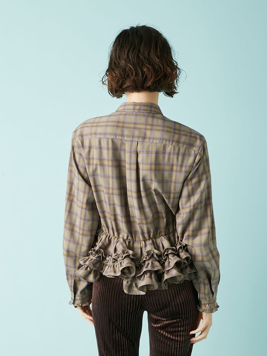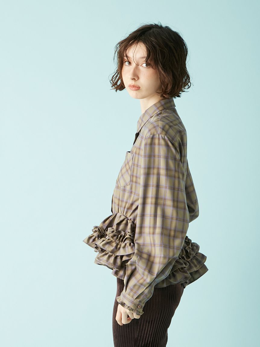 大膽點綴於下擺的荷葉邊成為視覺焦點,營造出充滿華麗感的襯衫。腰部拼接處採用鬆緊設計,能自然固定於腰間位置。兩側荷葉採不對稱流線設計,並以後長前短的剪裁比例修飾身形,展現俐落又優雅的造型。