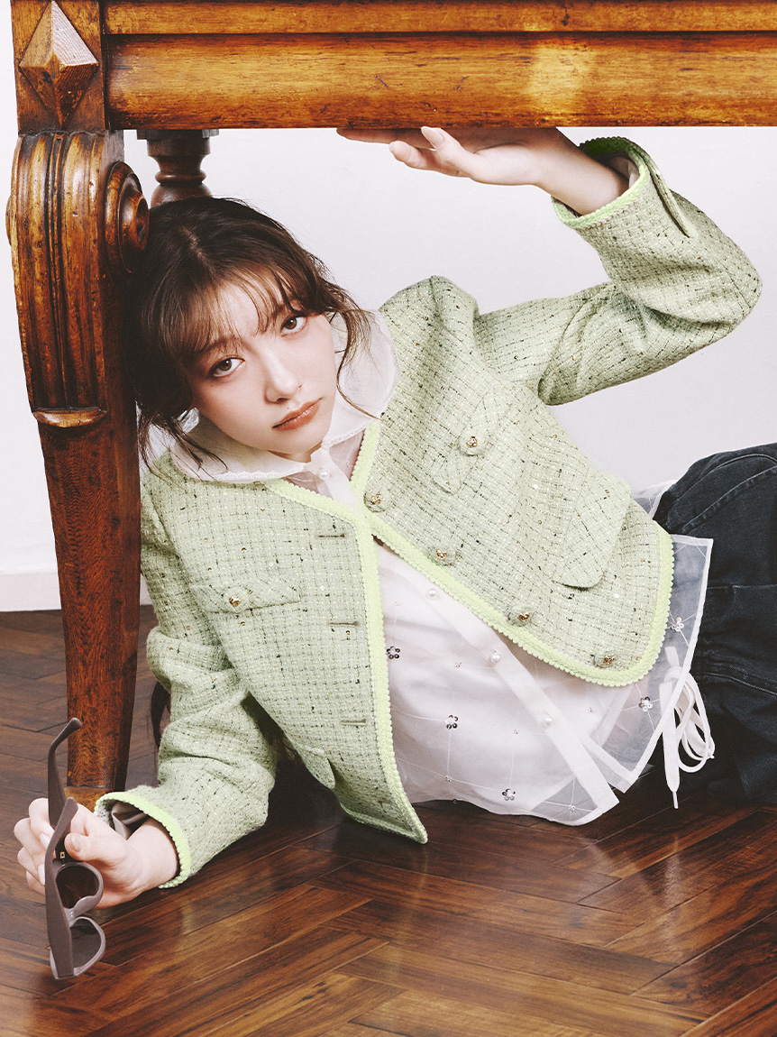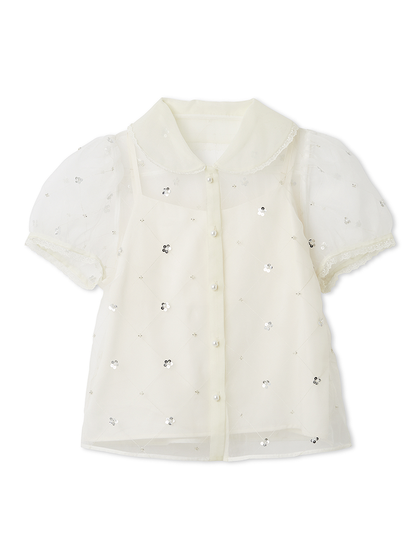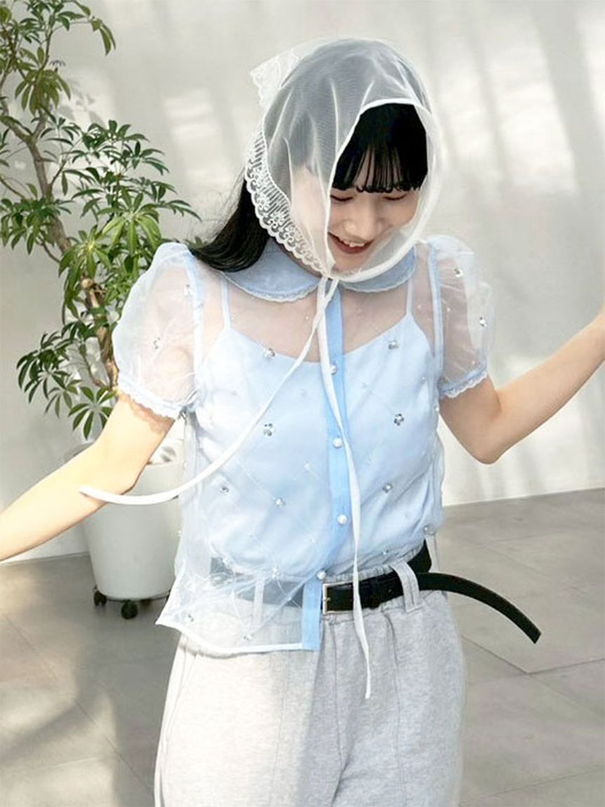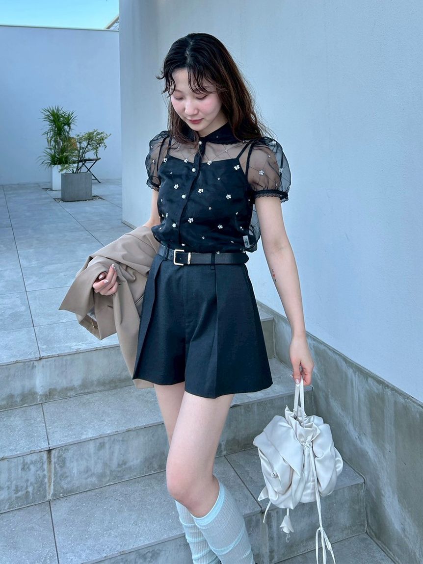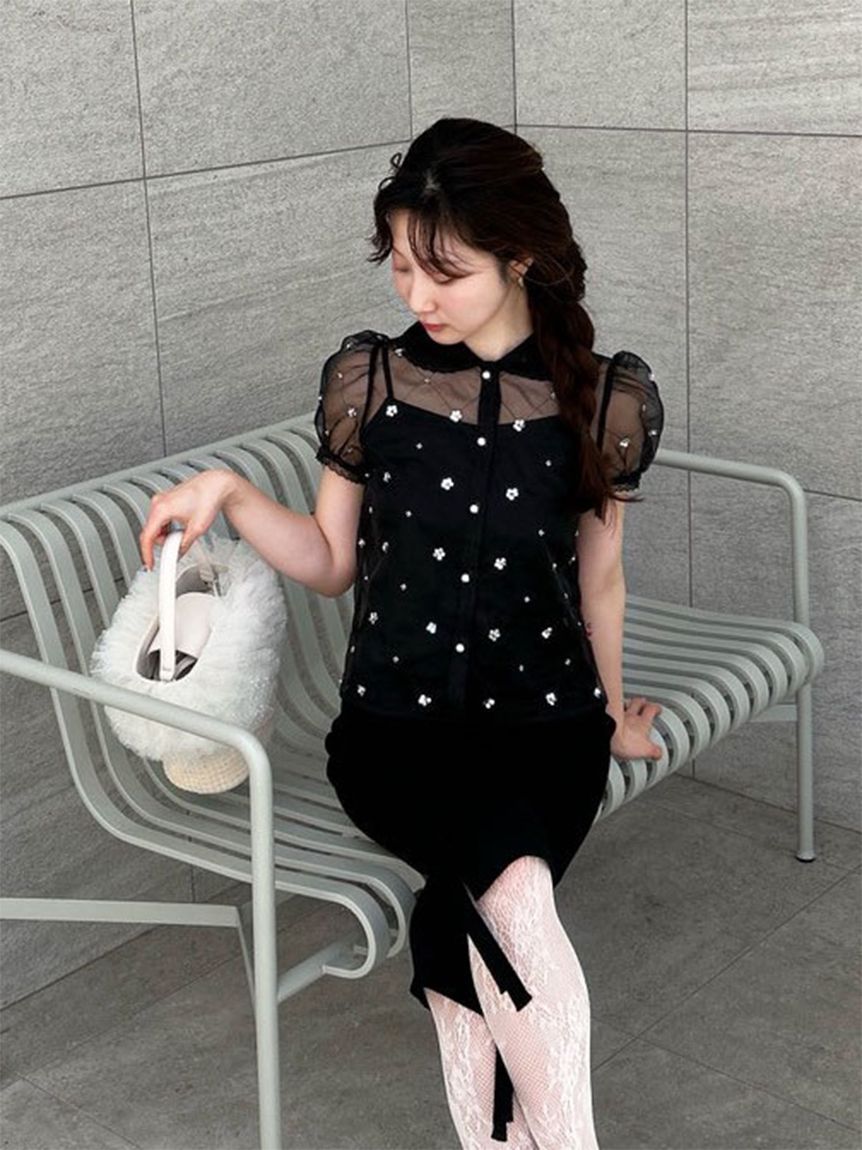 圓領邊緣點綴蕾絲滾邊,小巧袖型與正面珍珠鈕扣成為甜美亮點。