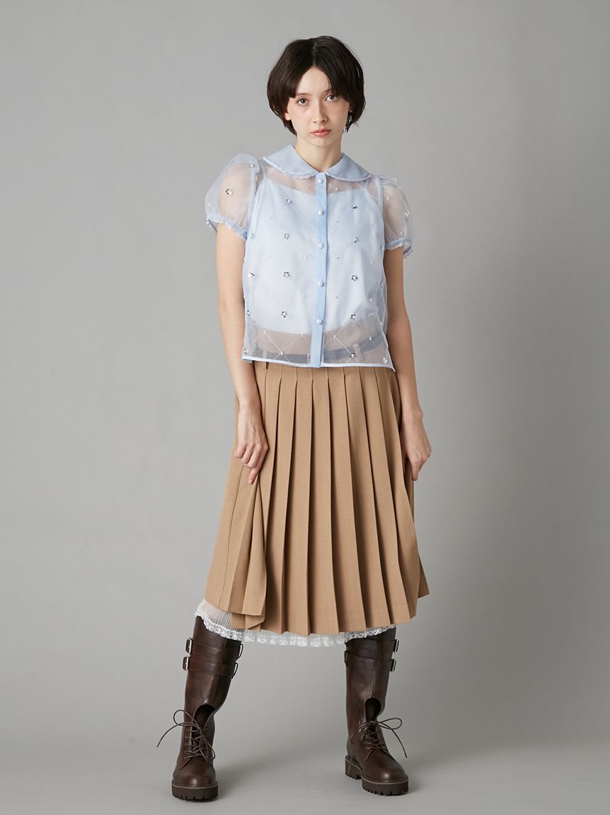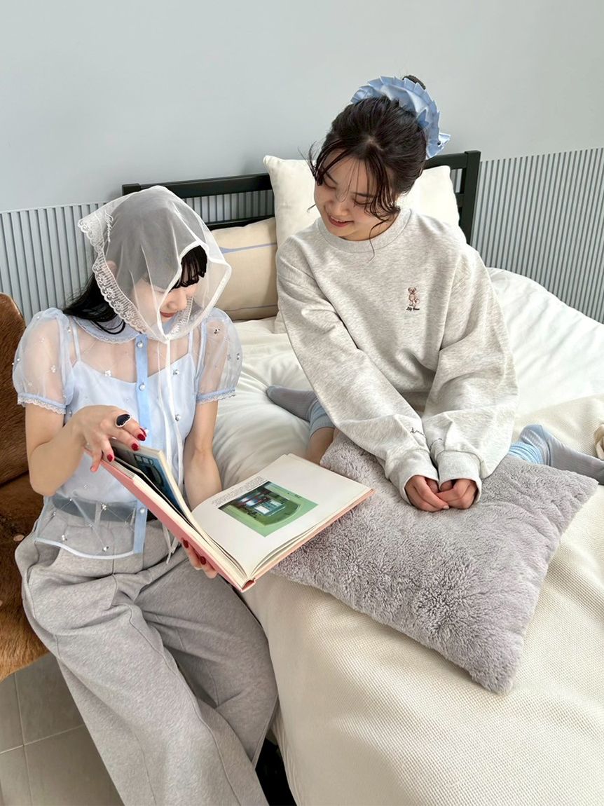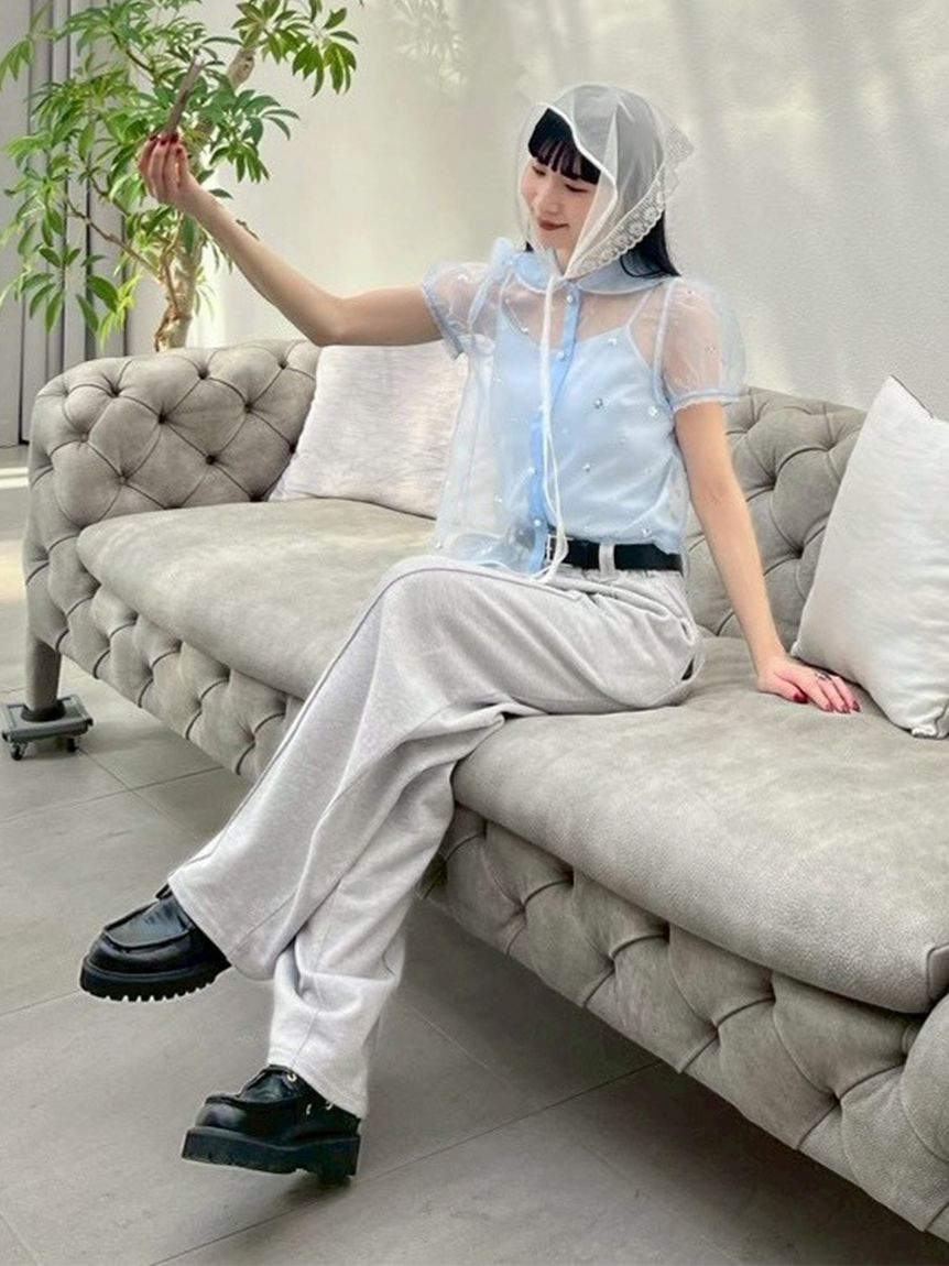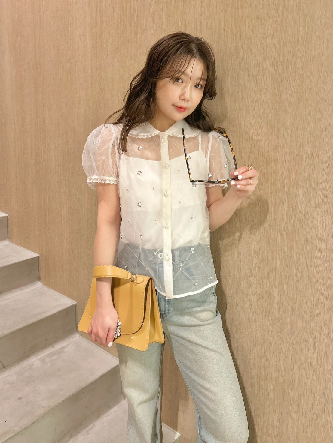 圓領邊緣點綴蕾絲滾邊,小巧袖型與正面珍珠鈕扣成為甜美亮點。