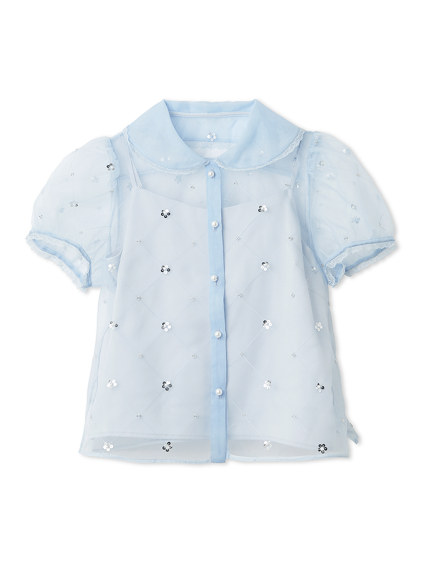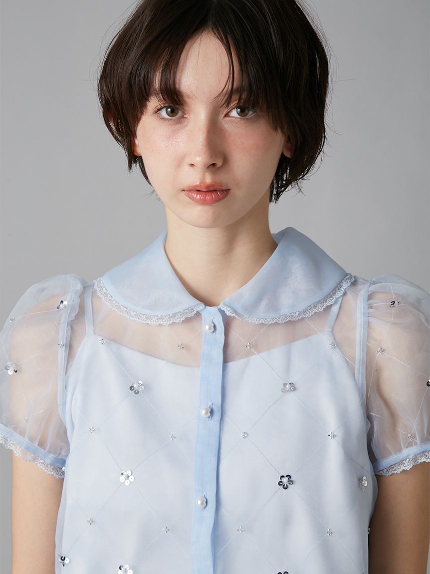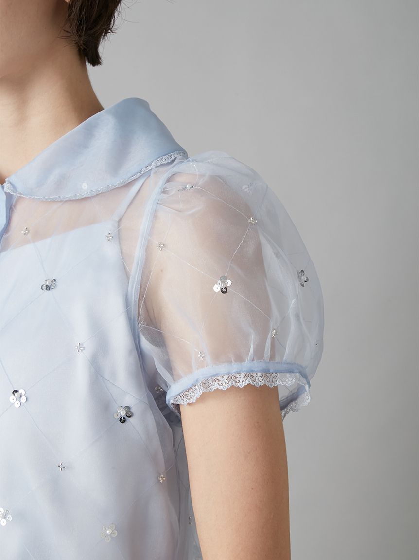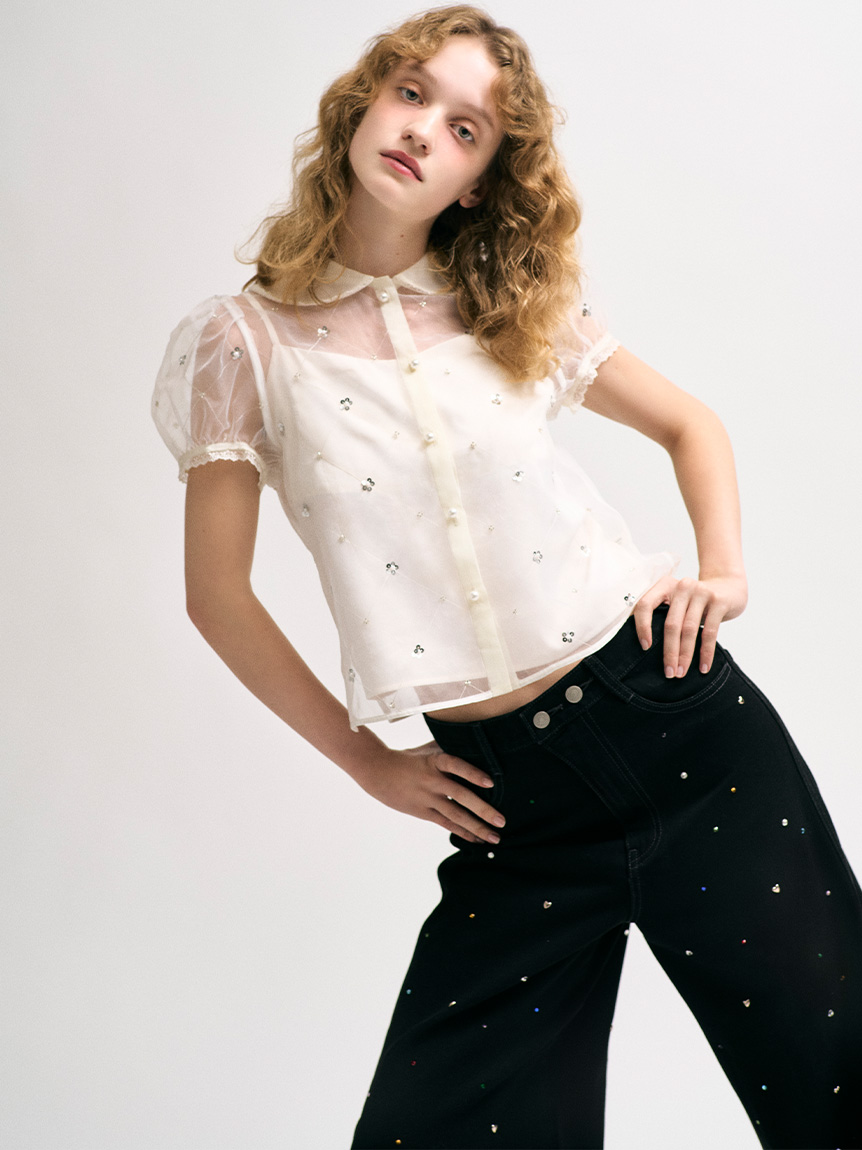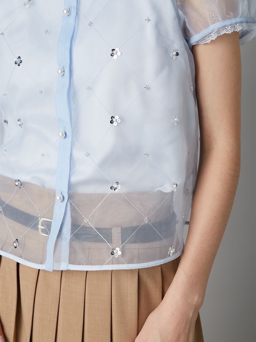 在柔軟的歐根紗布料上,以珠飾與亮片打造細緻小花刺繡,呈現精緻華麗的質感。