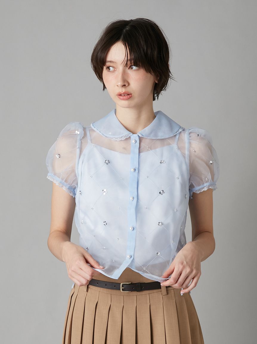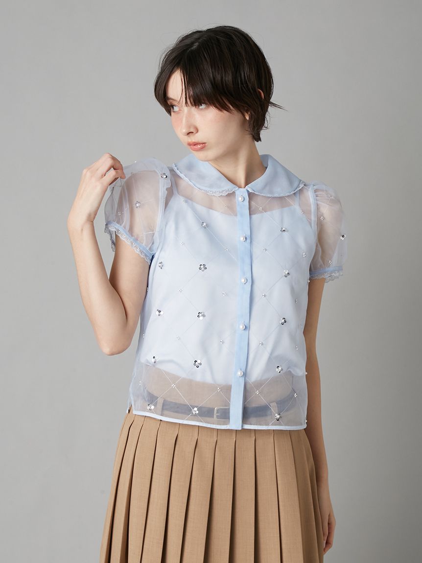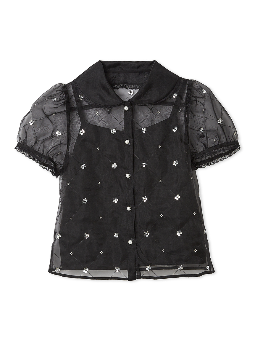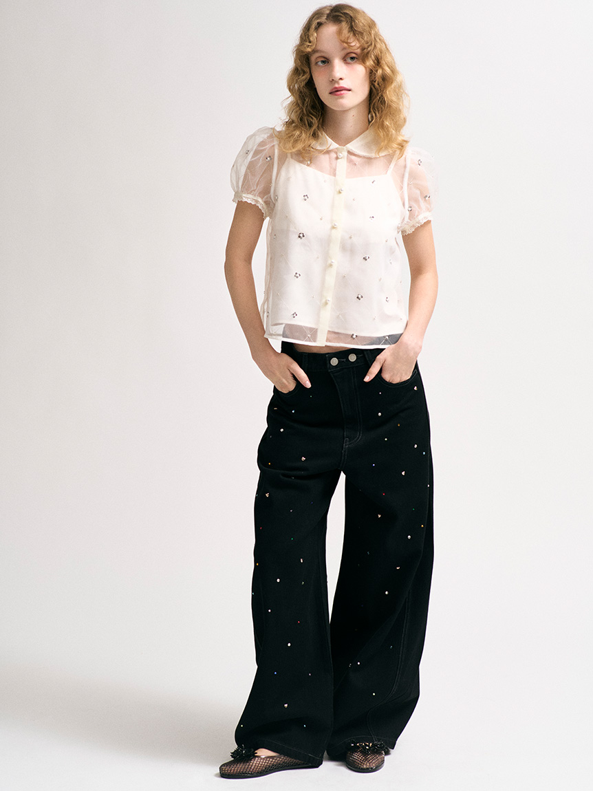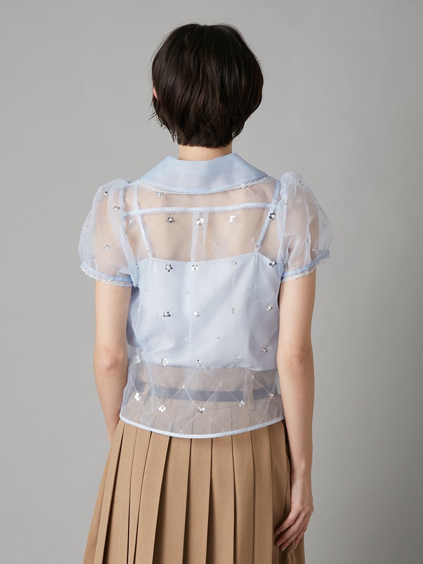 在柔軟的歐根紗布料上,以珠飾與亮片打造細緻小花刺繡,呈現精緻華麗的質感。
