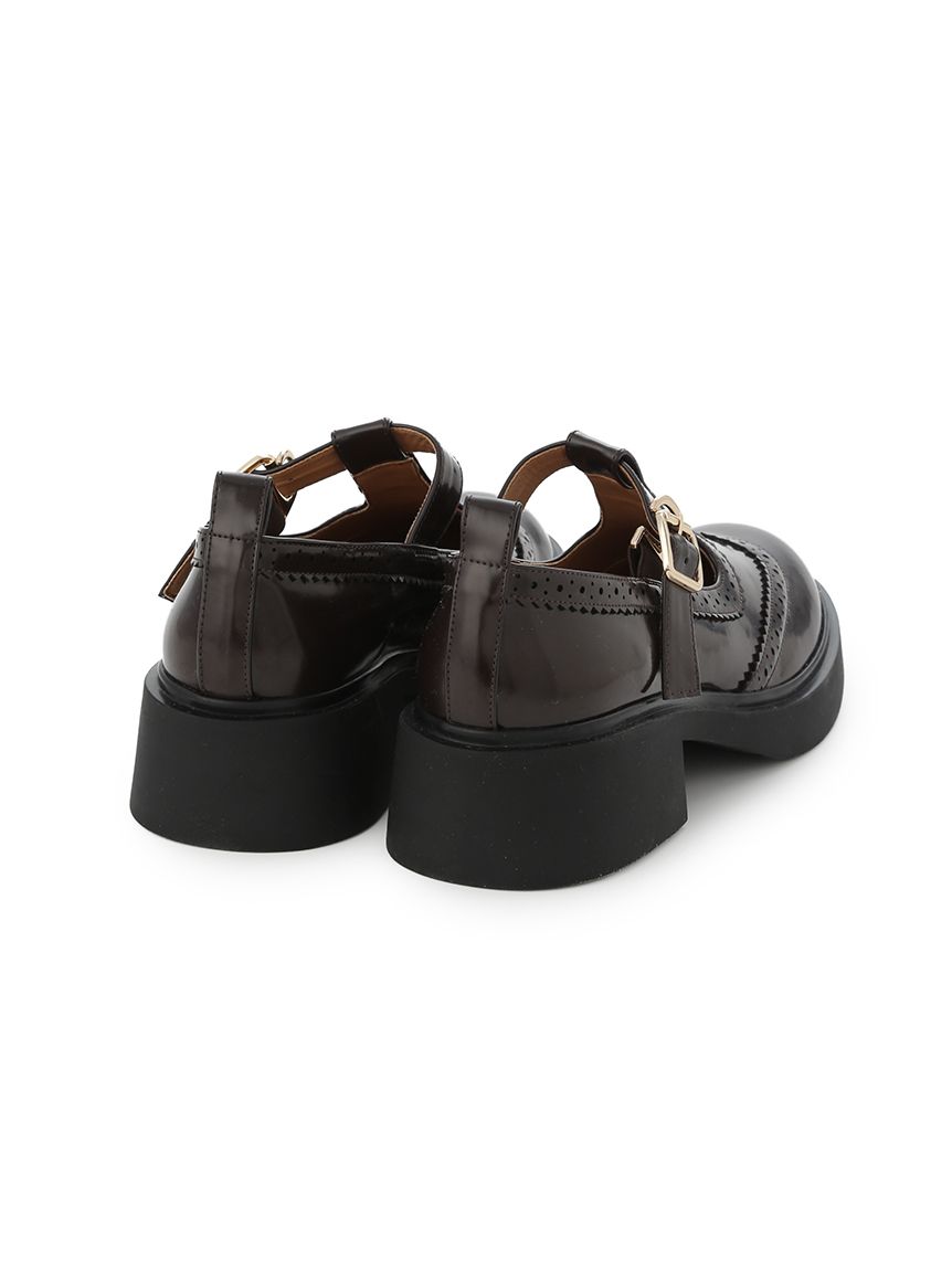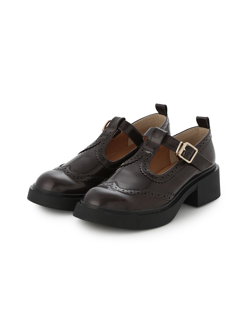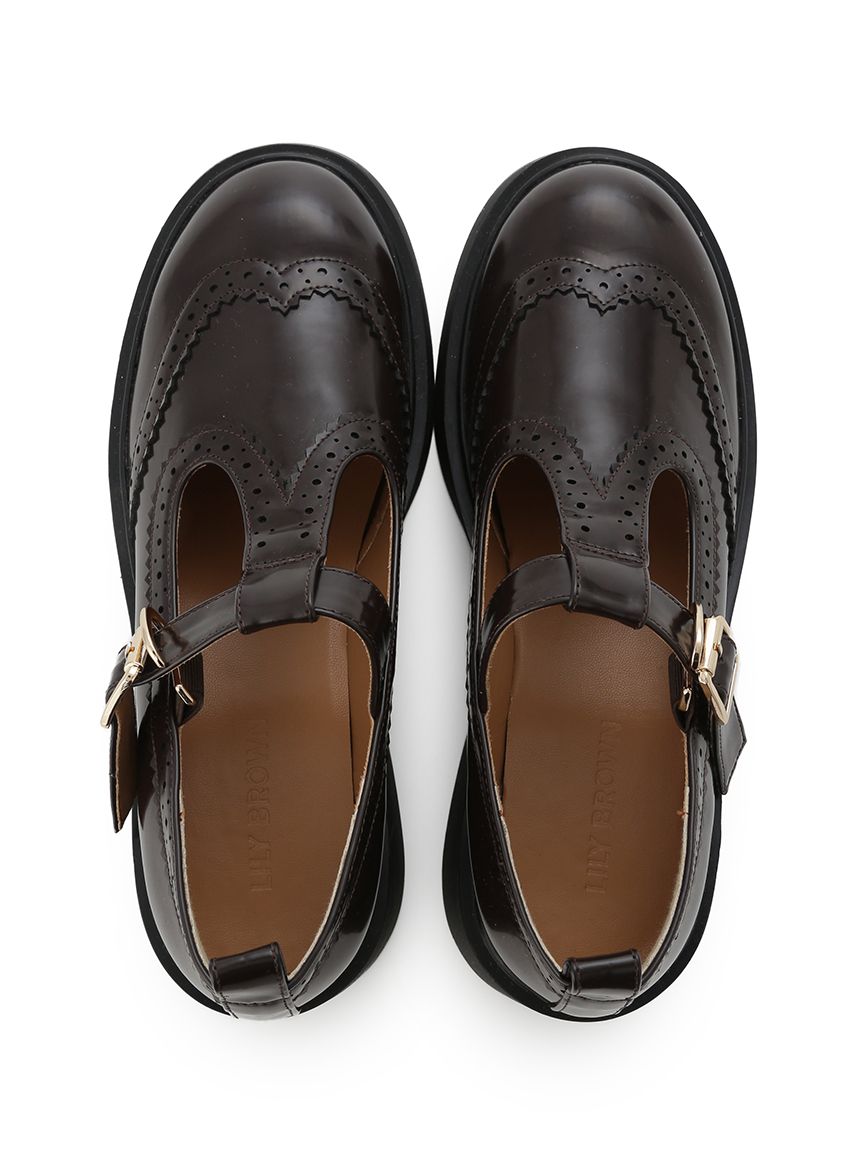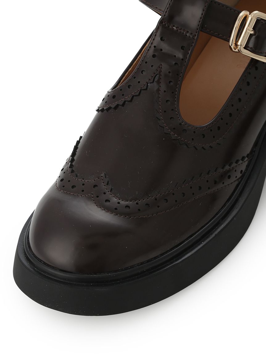將男性感的布洛克鞋注入女性化的 T 字帶設計,展現優雅氣質。具有光澤感的仿皮革材質,突顯經典氛圍。鞋帶可調整尺寸,貼合雙足。