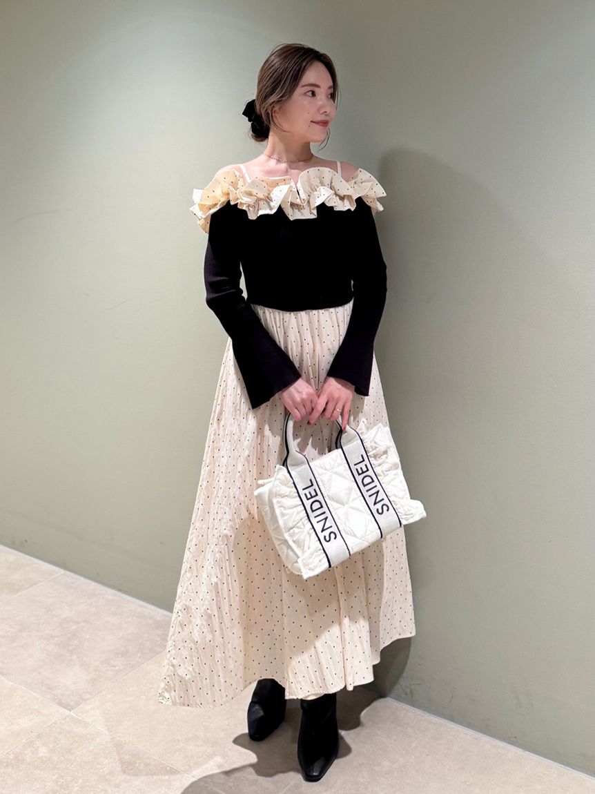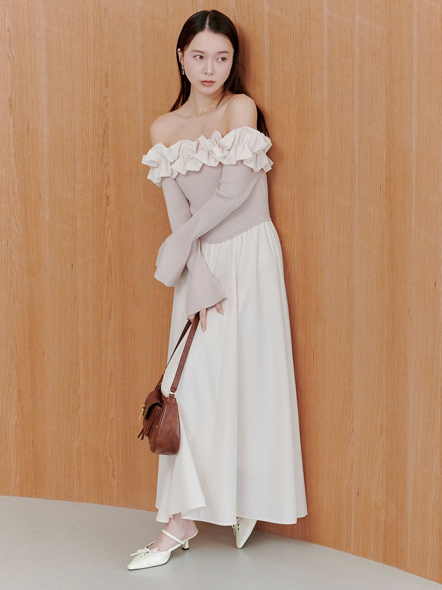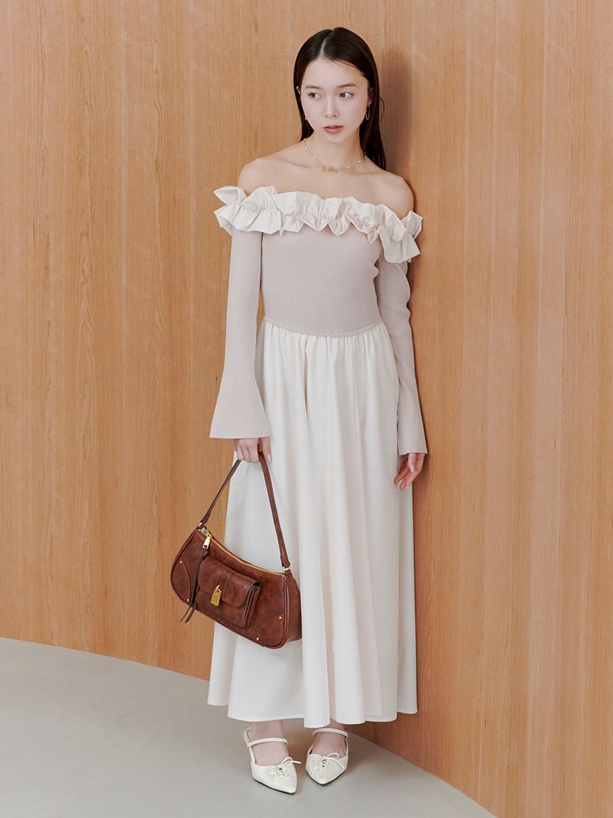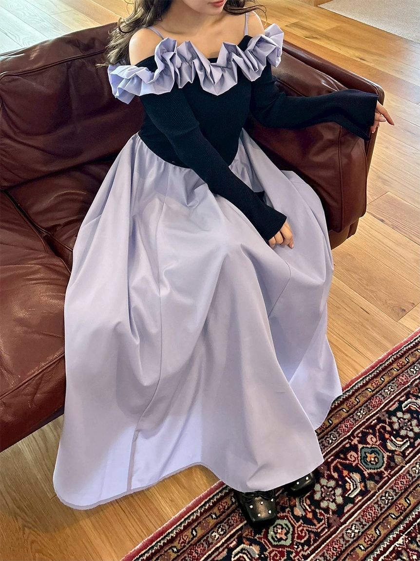 領口點綴如波浪般展開的荷葉邊領設計,為臉部周圍增添華麗亮點的針織拼接洋裝。