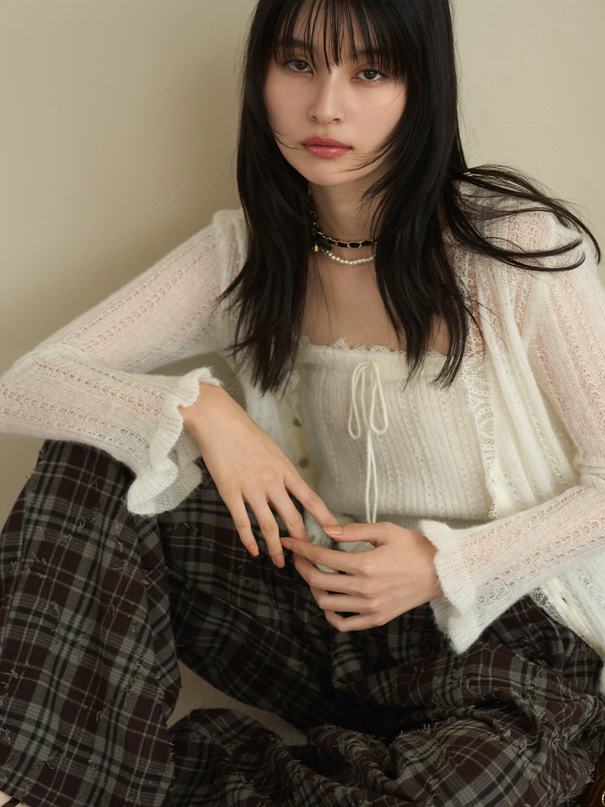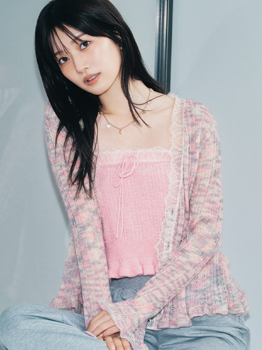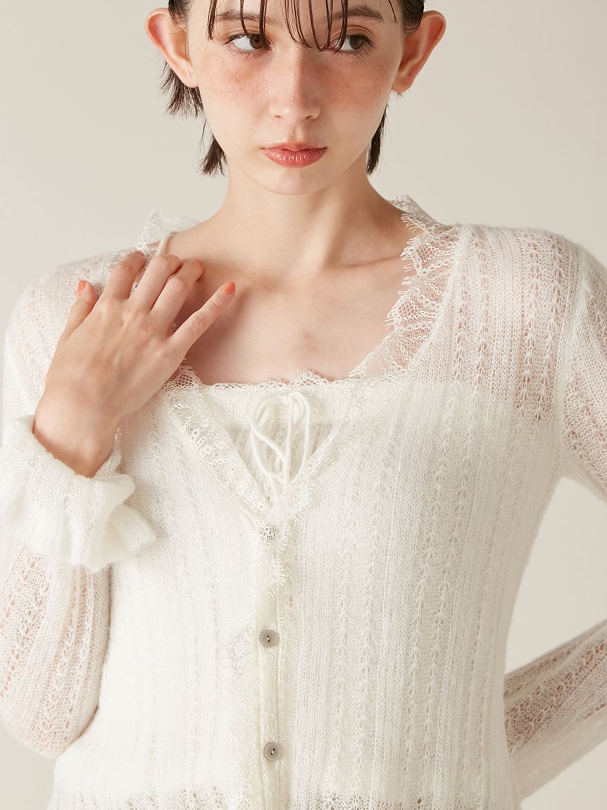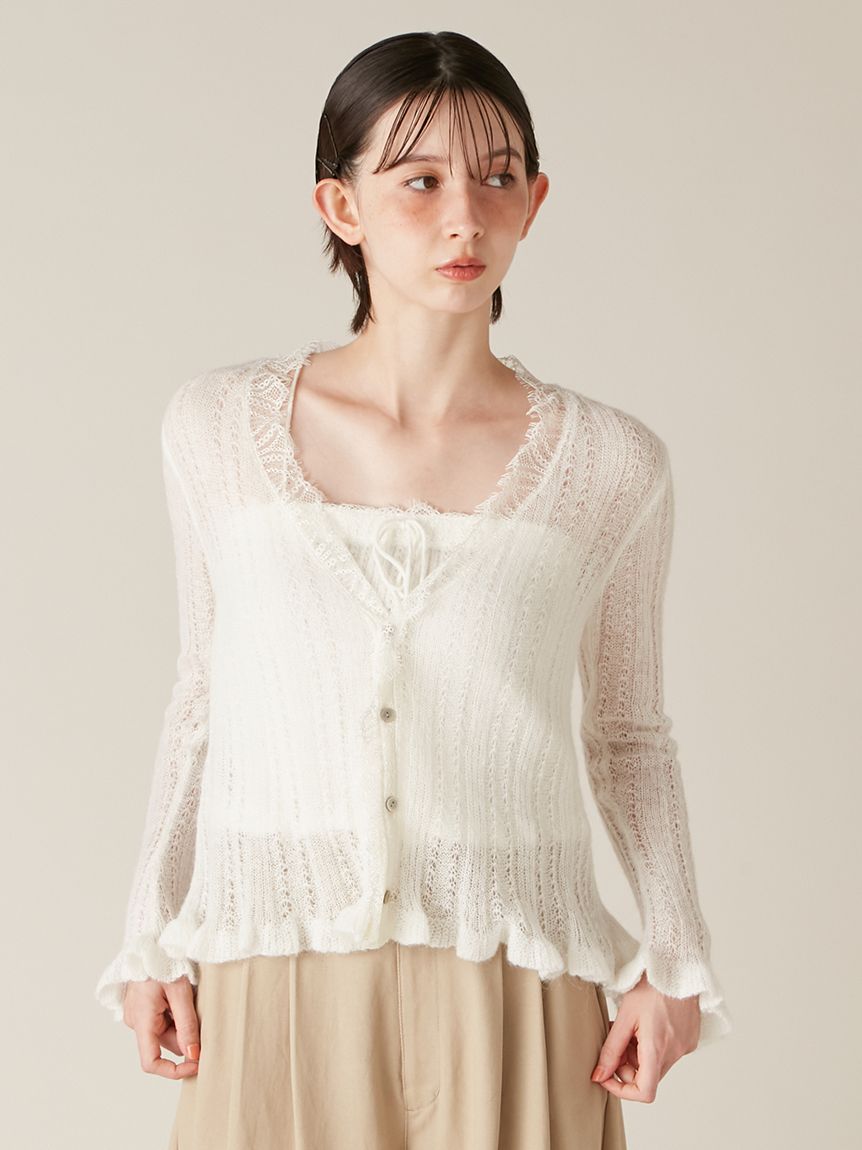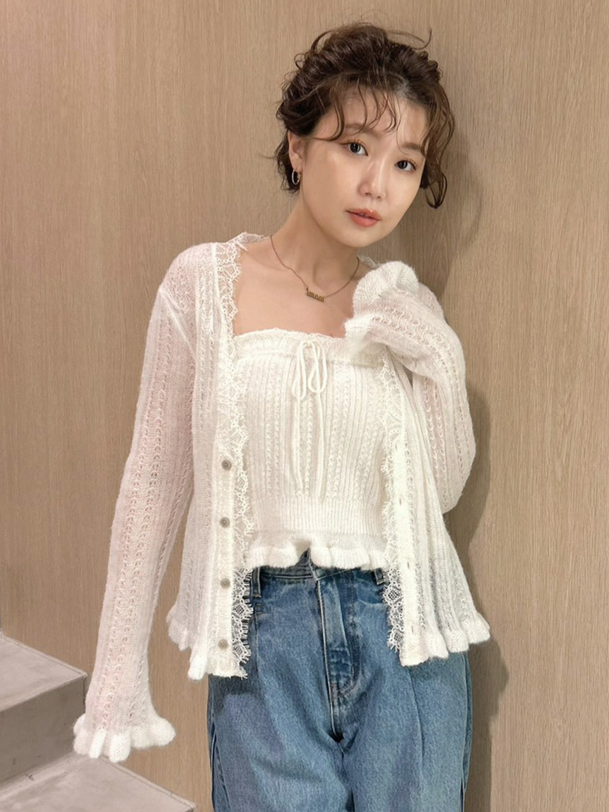 懷舊風透視針織開襟衫搭配露肩吊帶背心,構成此套裝。領口與胸前點綴的纖細蕾絲,更添柔美氛圍。無論成套穿搭或單品搭配皆能展現高實穿性。推薦搭配卡其褲或牛仔褲等休閒下裝,增添隨性氛圍。