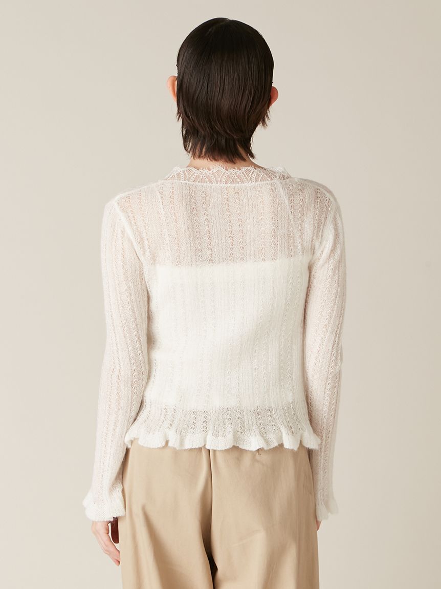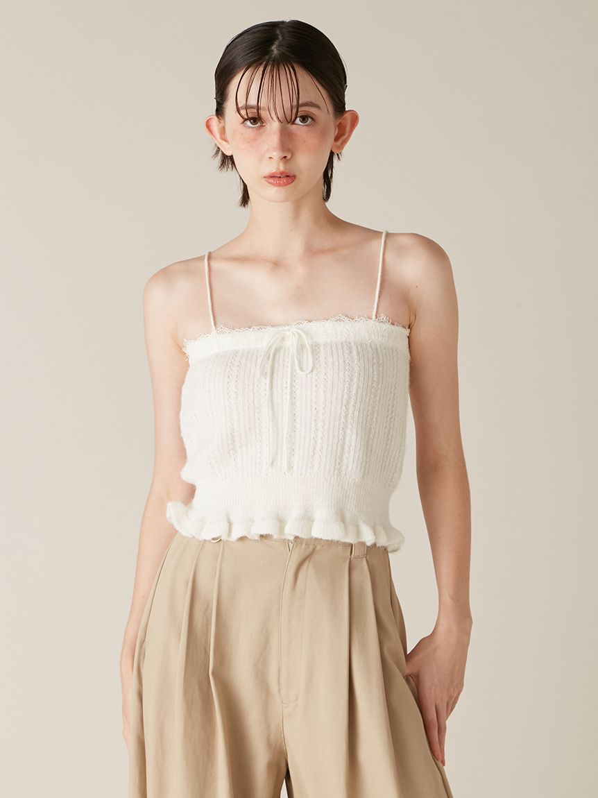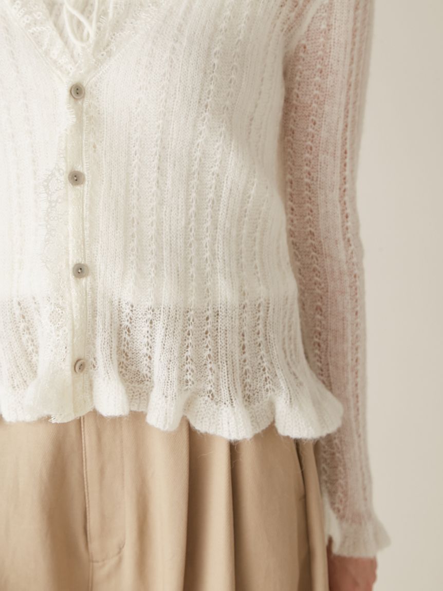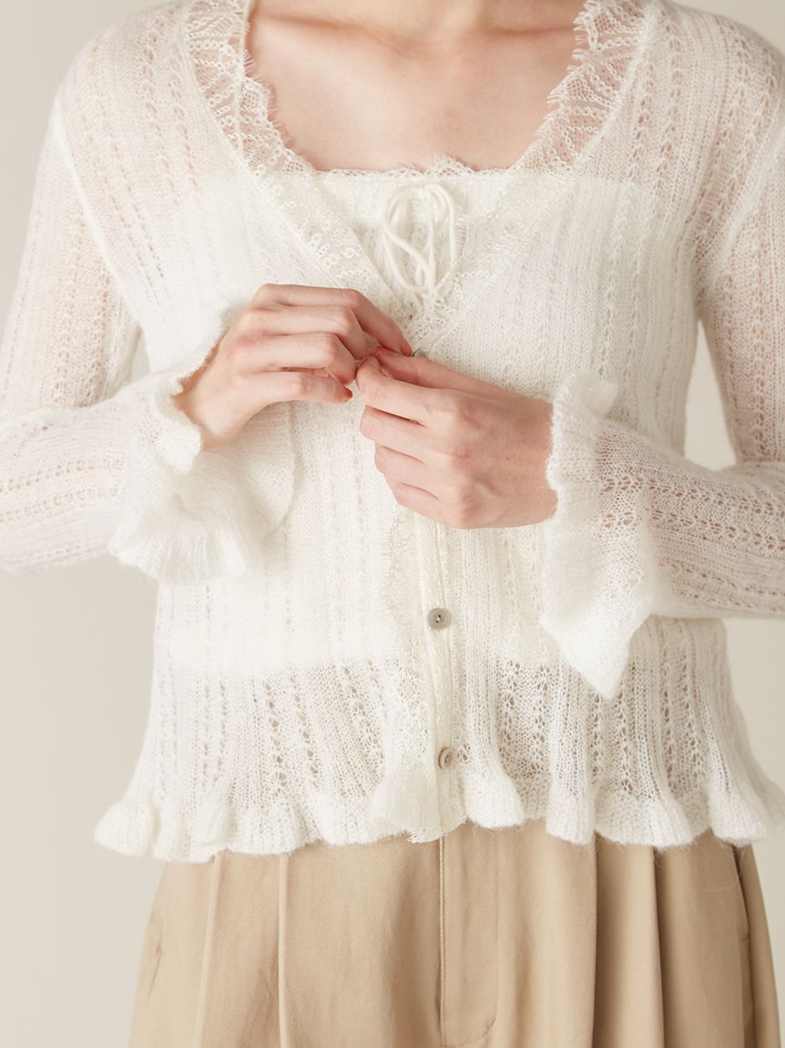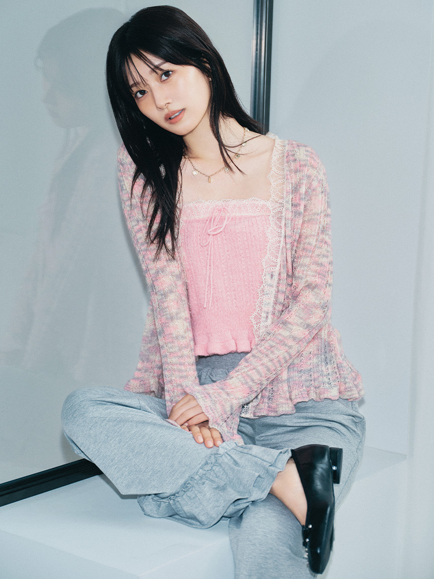 懷舊風透視針織開襟衫搭配露肩吊帶背心,構成此套裝。領口與胸前點綴的纖細蕾絲,更添柔美氛圍。無論成套穿搭或單品搭配皆能展現高實穿性。推薦搭配卡其褲或牛仔褲等休閒下裝,增添隨性氛圍。