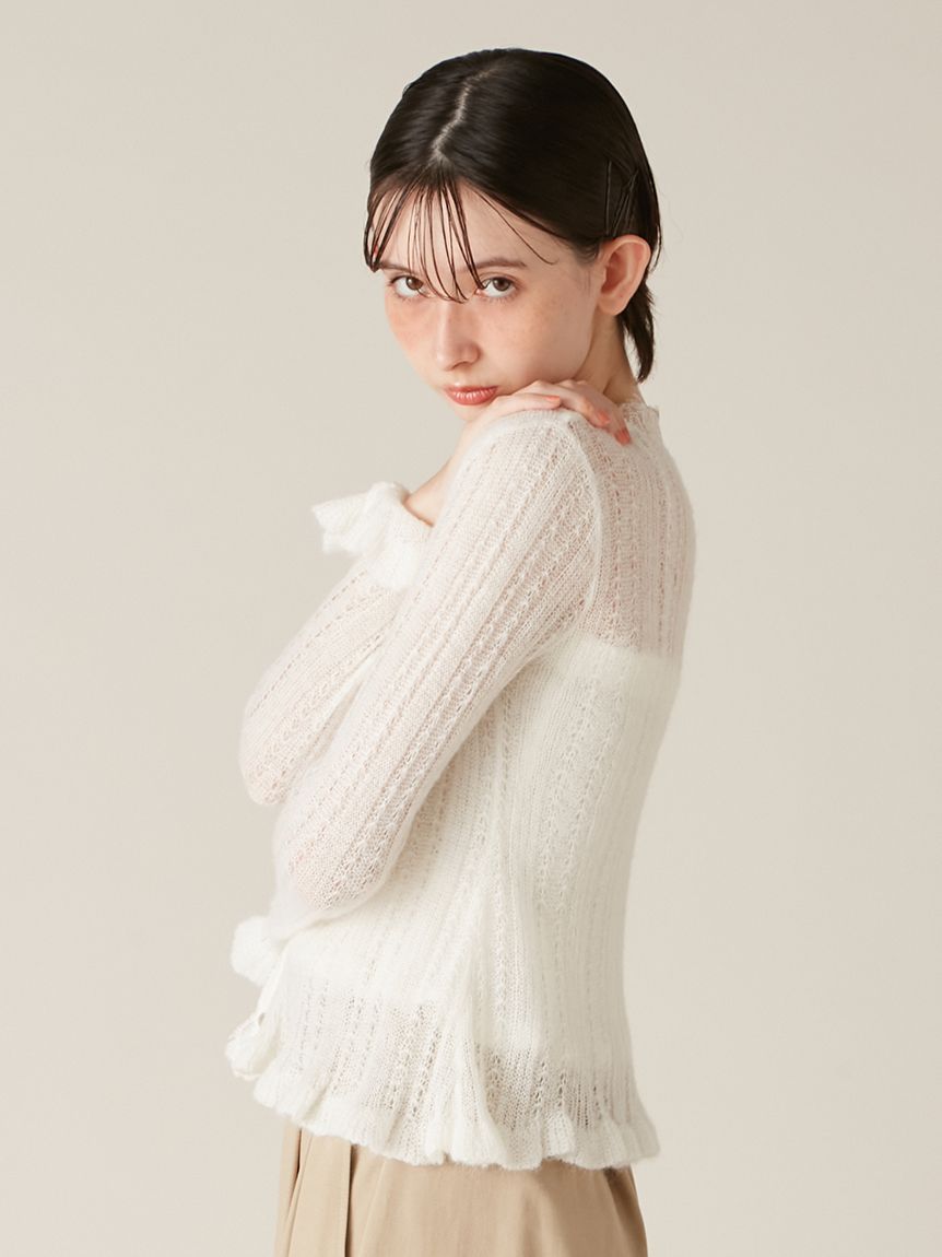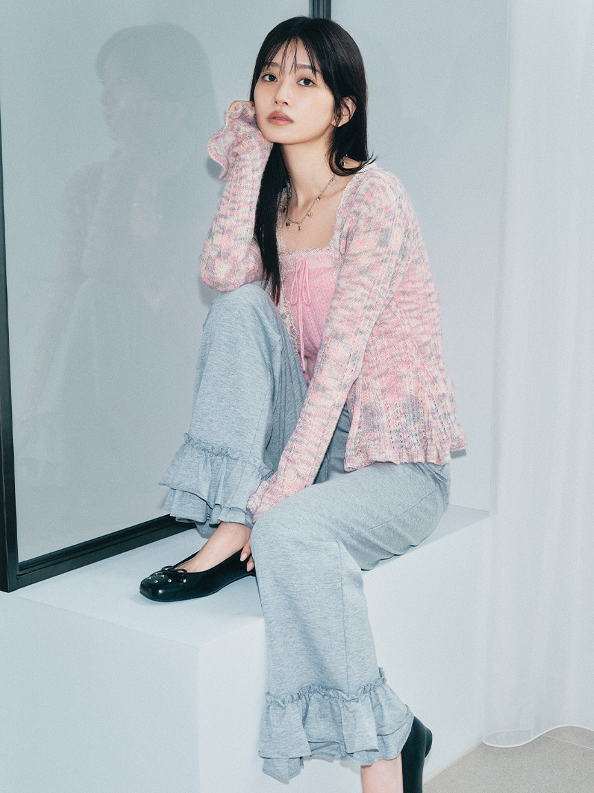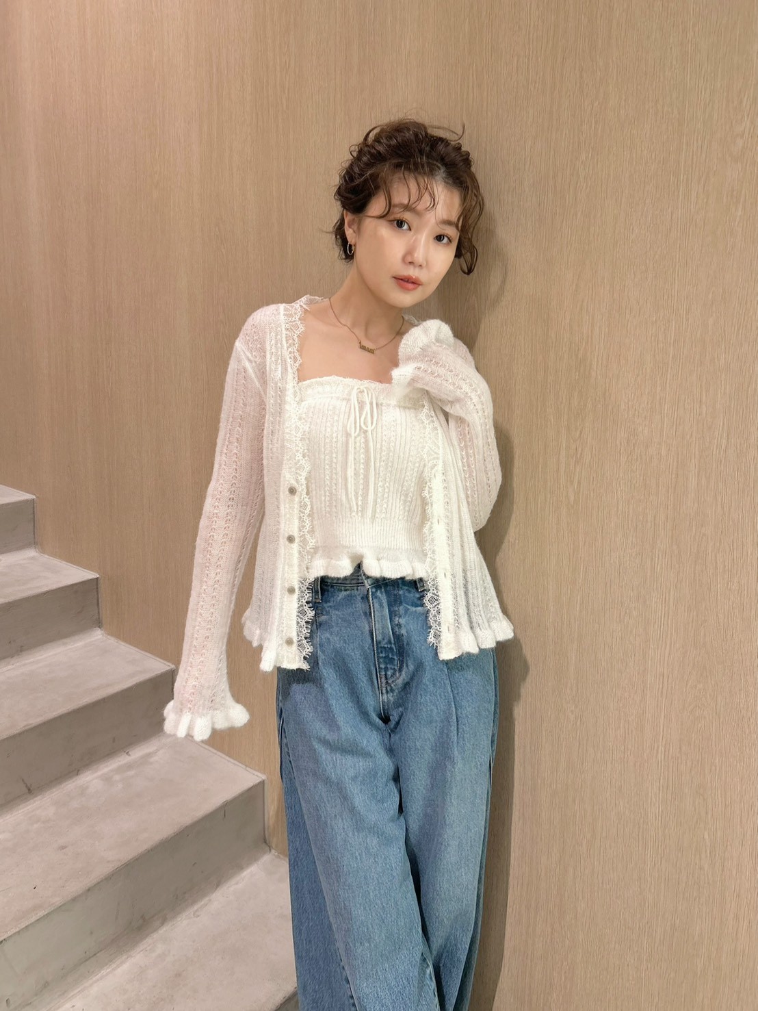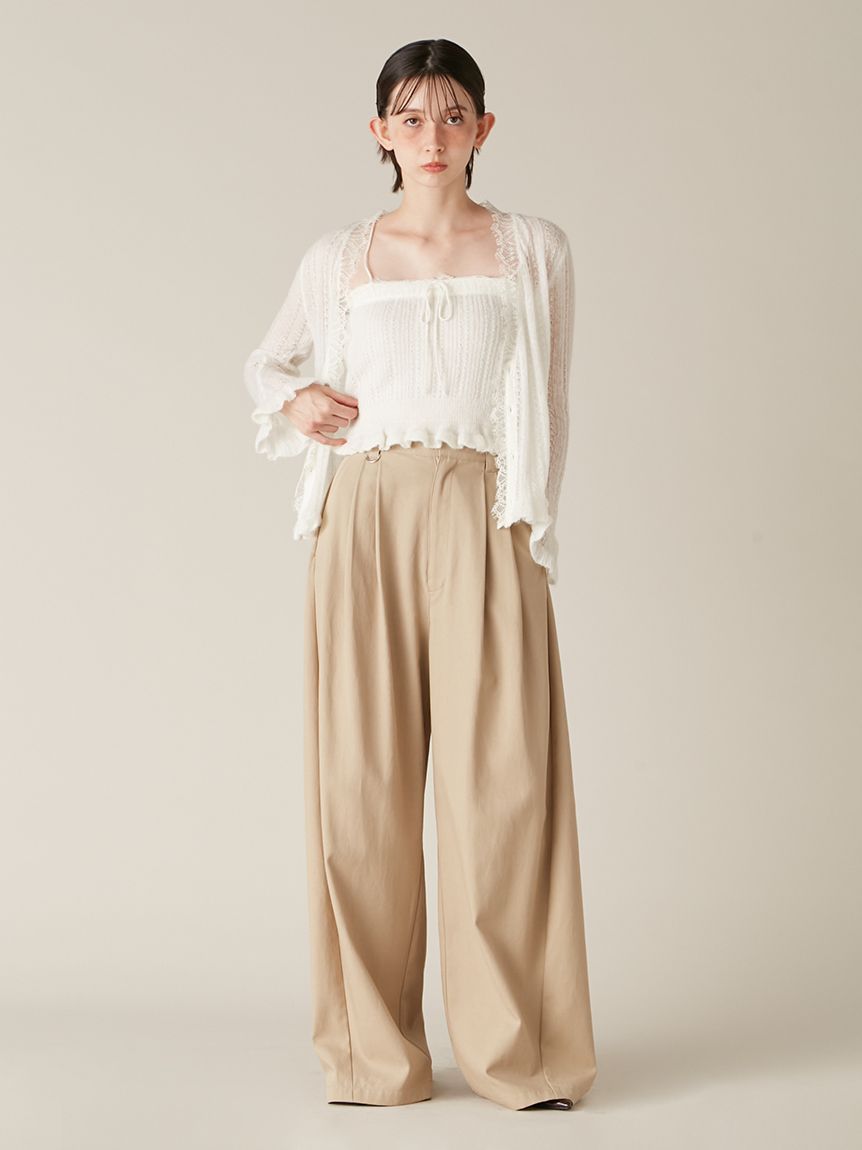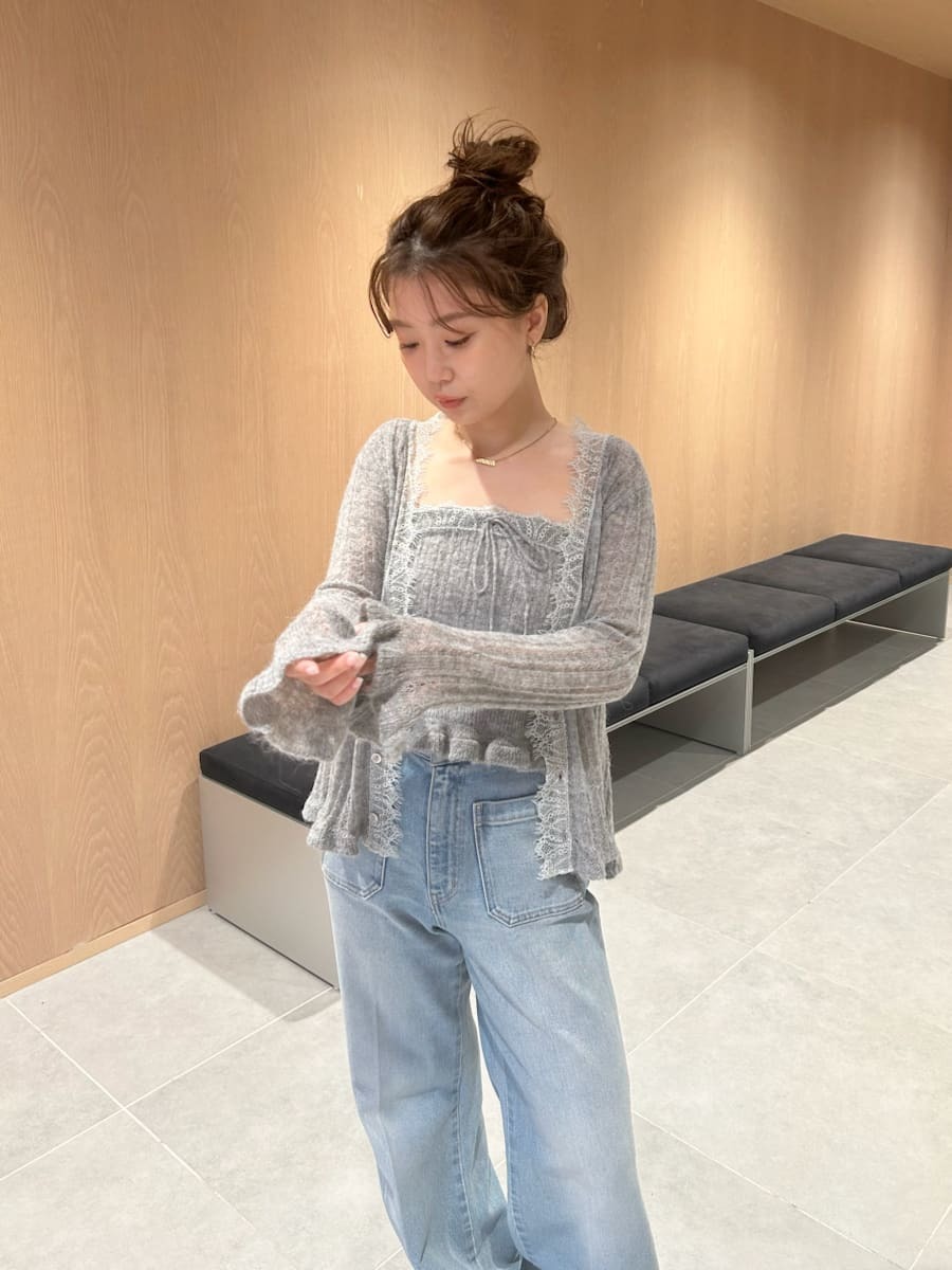 懷舊風透視針織開襟衫搭配露肩吊帶背心,構成此套裝。領口與胸前點綴的纖細蕾絲,更添柔美氛圍。無論成套穿搭或單品搭配皆能展現高實穿性。推薦搭配卡其褲或牛仔褲等休閒下裝,增添隨性氛圍。