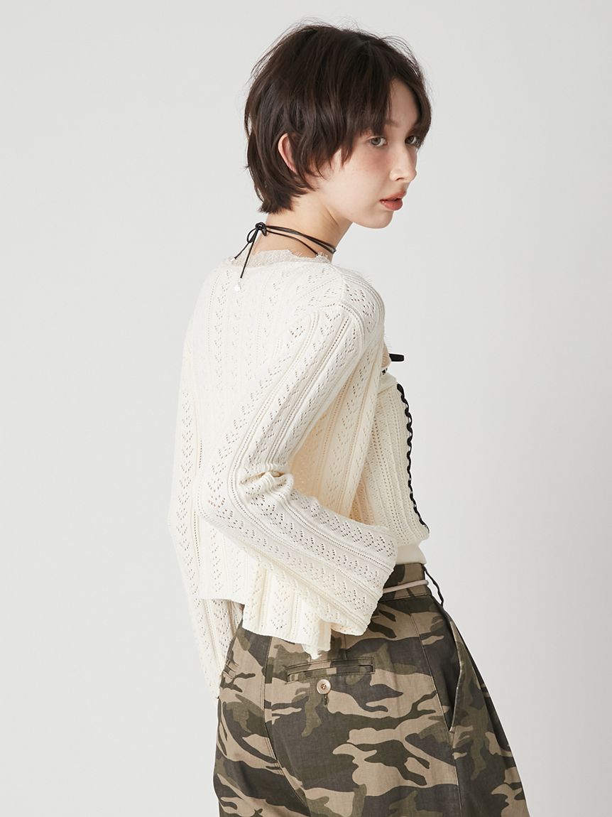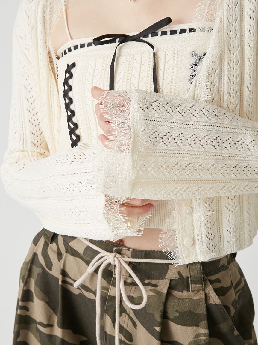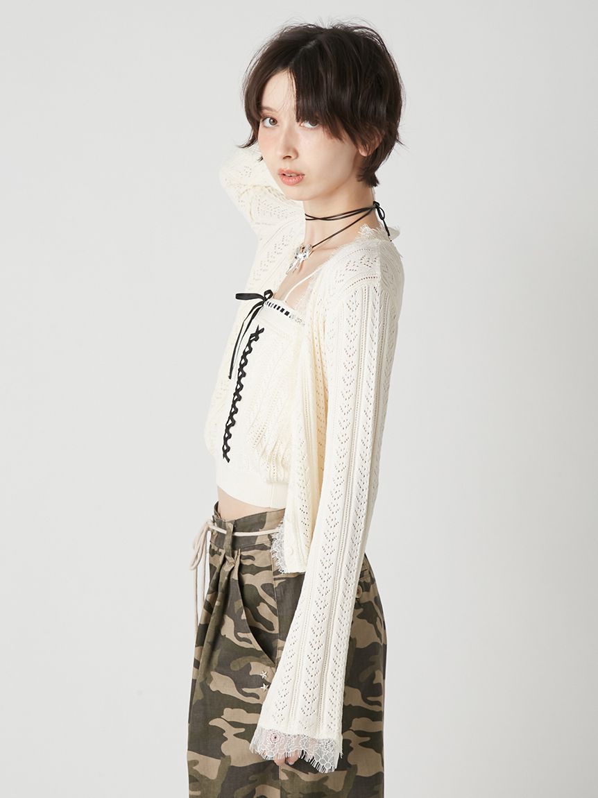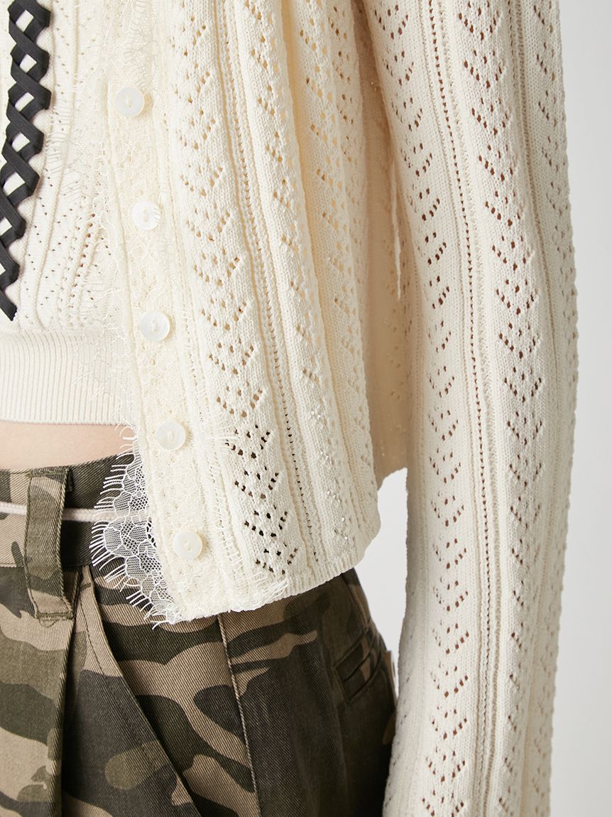 開襟針織外套以細緻鏤空編織,巧妙隱藏愛心圖案,領口與袖口點綴鬚邊蕾絲,增添浪漫氛圍。