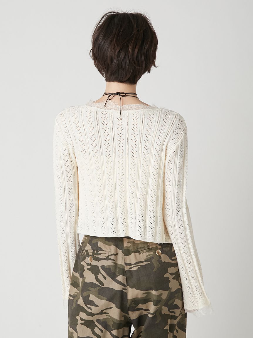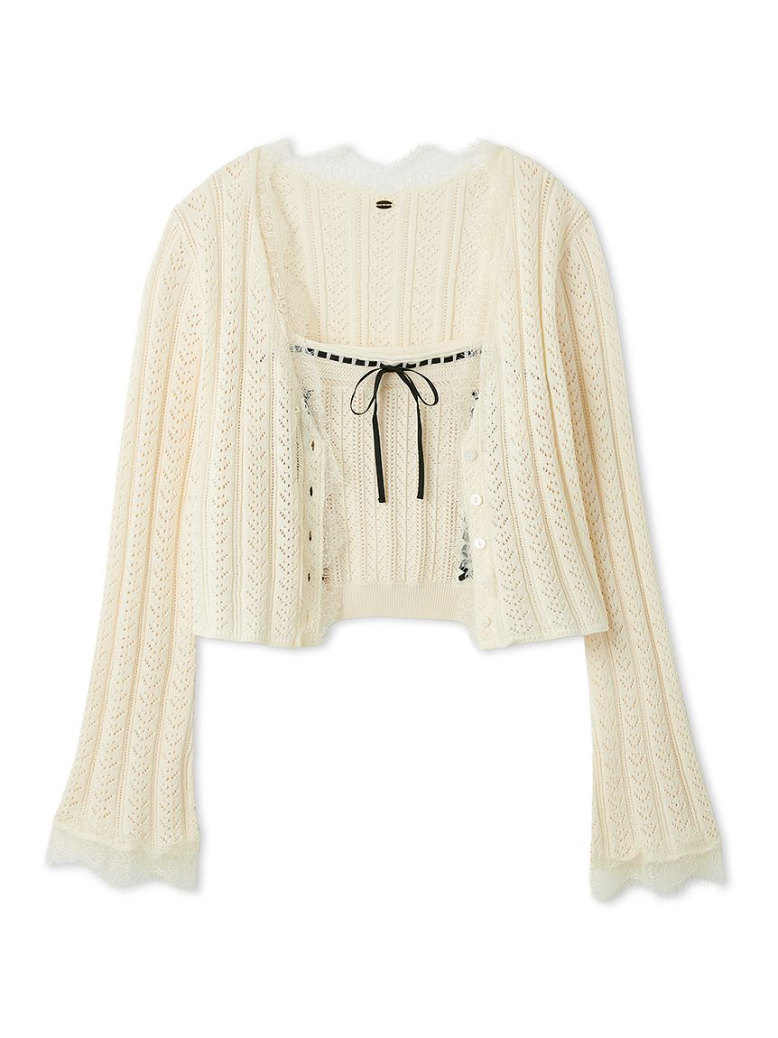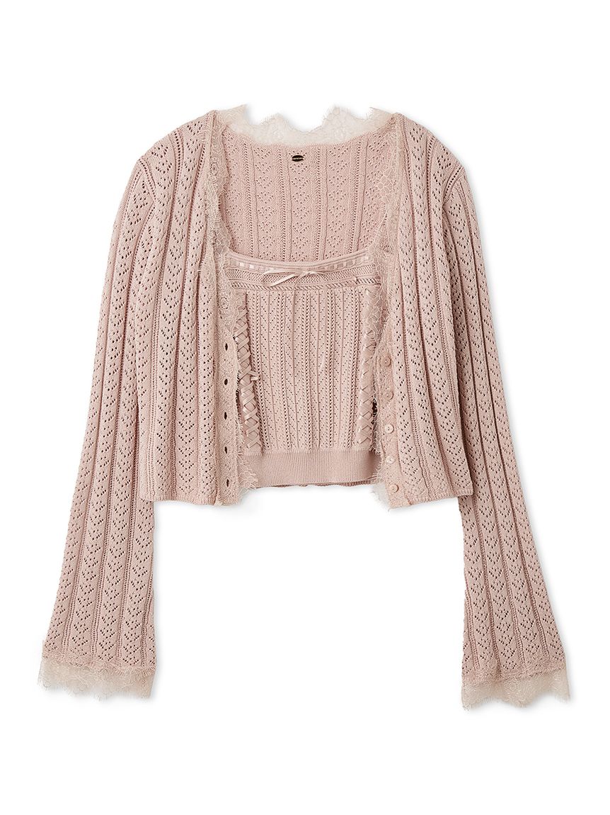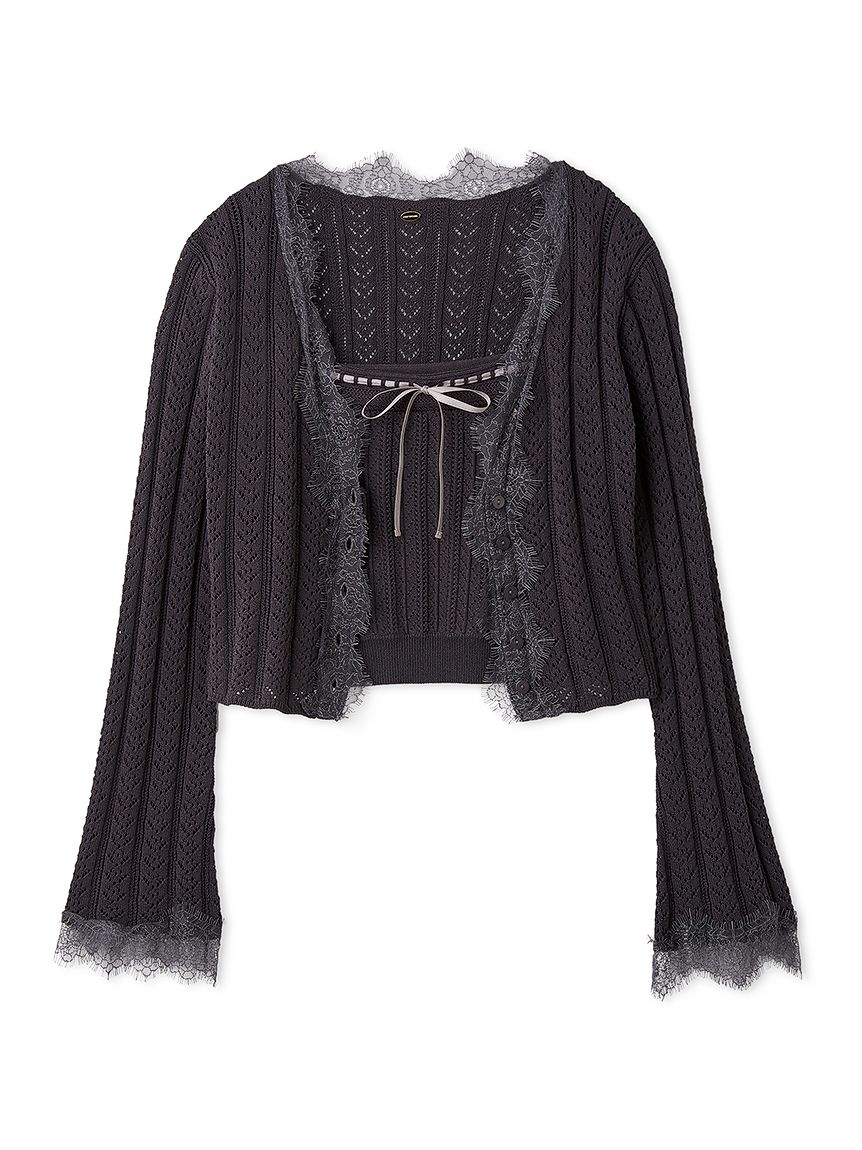 開襟針織外套以細緻鏤空編織,巧妙隱藏愛心圖案,領口與袖口點綴鬚邊蕾絲,增添浪漫氛圍。