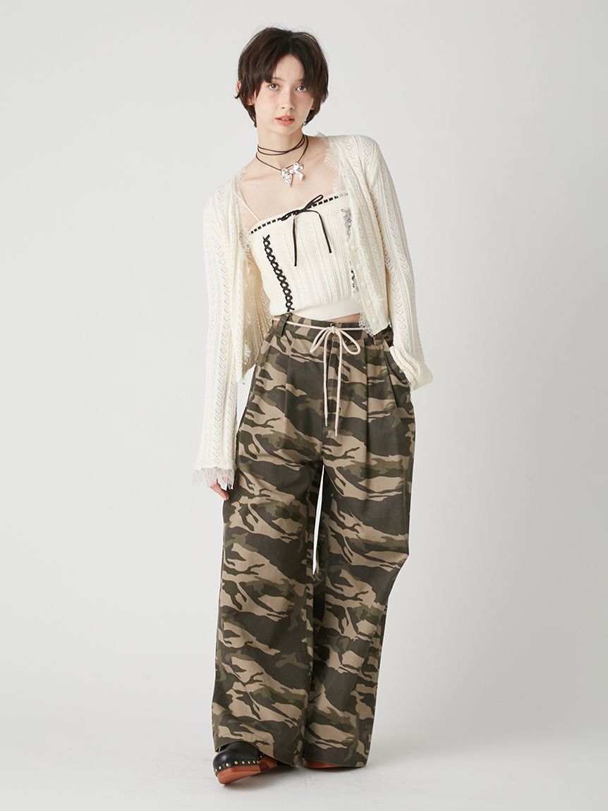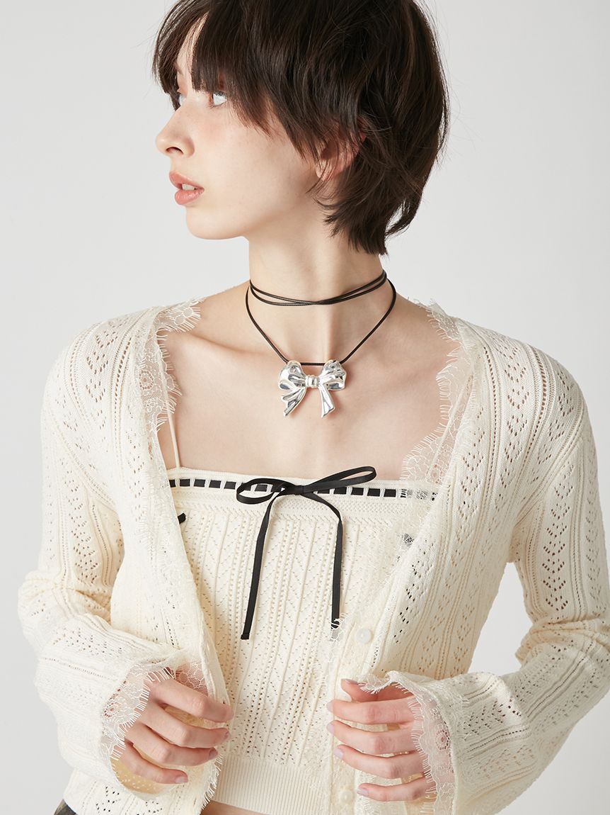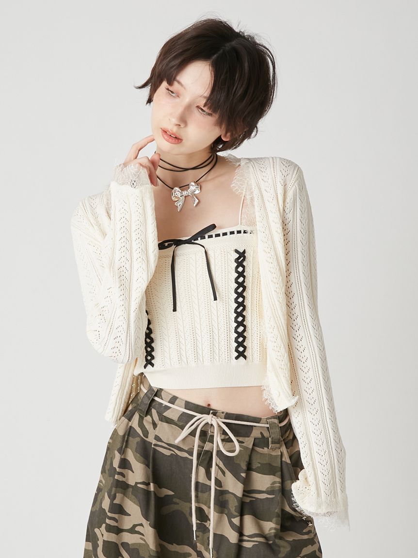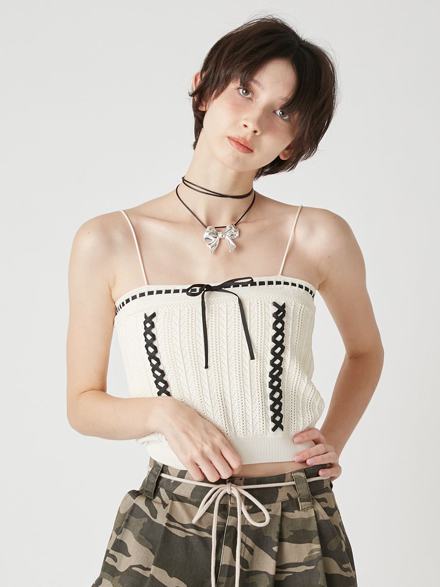 內搭吊帶背心結合多種圖案編織,前方穿過蝴蝶結的緊身設計如束身胸衣般,是亮眼的設計細節。