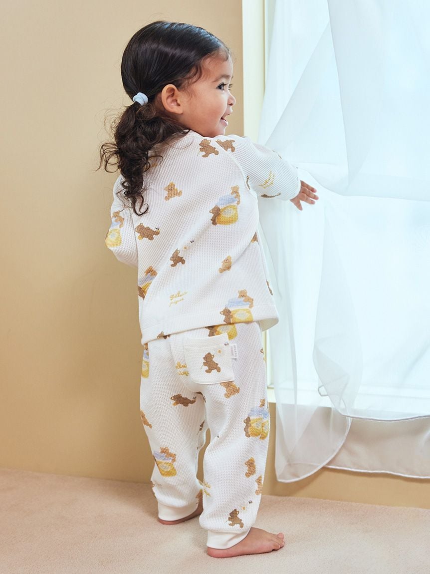 以繪本般筆觸描繪可愛的小熊與蜂蜜,打造出親子皆能共享的蜂蜜小熊系列。這款BABY休閒上衣採柔軟華夫格布料製成,滿版印有小熊與蜂蜜圖案,插肩袖設計休閒好穿,配色選用秋季氛圍的黃色與棕色。