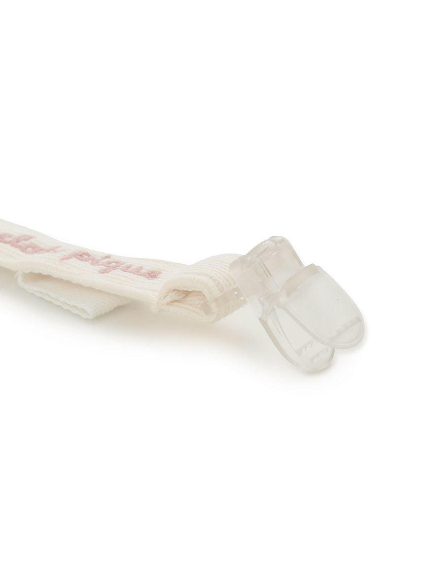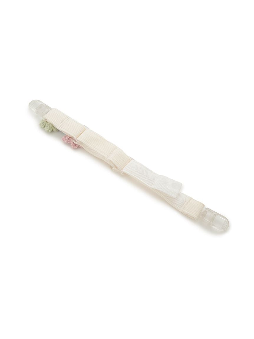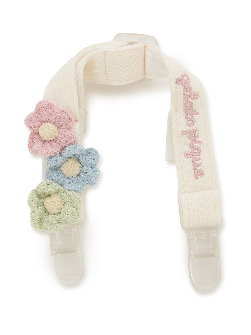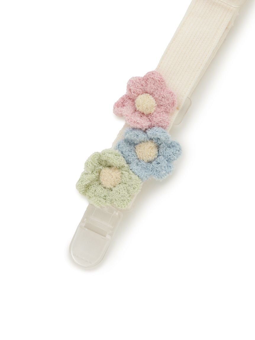 輕盈的Airy MOCO素材,散布立體繽紛小花,組成可愛的BABY小物系列。多功能夾結合配色小花與棉混彈性羅紋帶,可用來固定手帕即成臨時圍兜,或防止嬰兒車上的玩具掉落,是外出時便利的小物。可與同系列服飾或小物搭配,也非常適合作為禮物。
