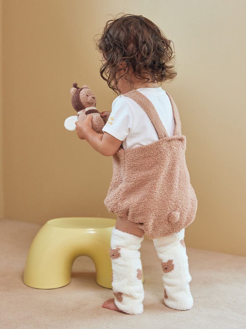 屬於蜂蜜小熊BABY系列小物。BABY腿套採用柔軟的BABY MOCO材質,米白色基底容易搭配穿著,並有一點品牌Logo刺繡點綴。可與同系列小熊BABY連身衣搭配,也很適合作為禮物。