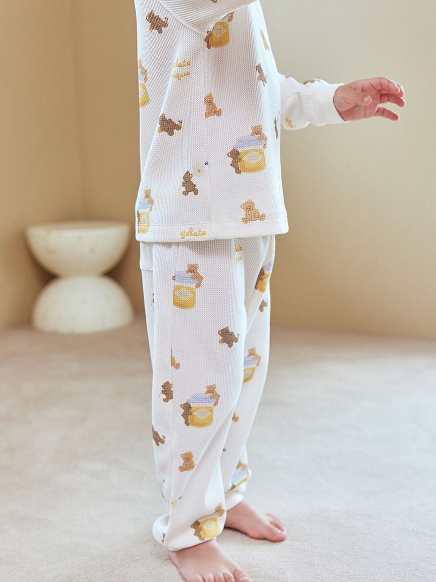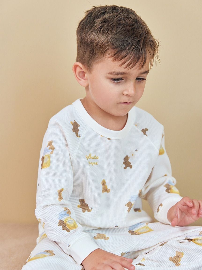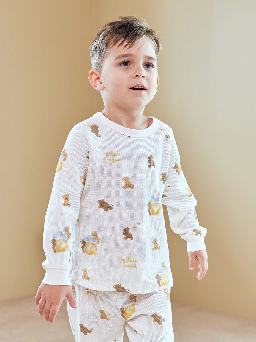 以繪本般筆觸描繪可愛的小熊與蜂蜜,打造出親子皆能共享的蜂蜜小熊系列。這款KIDS休閒上衣採柔軟蓬鬆的華夫格布料製成,滿版印有小熊與蜂蜜圖案,插肩袖設計休閒好穿,配色以秋季氛圍的黃色與棕色為主。
