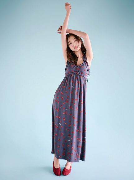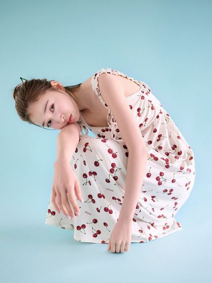 這款杯墊式洋裝以濃郁色調的滿版櫻桃,充滿趣味感。