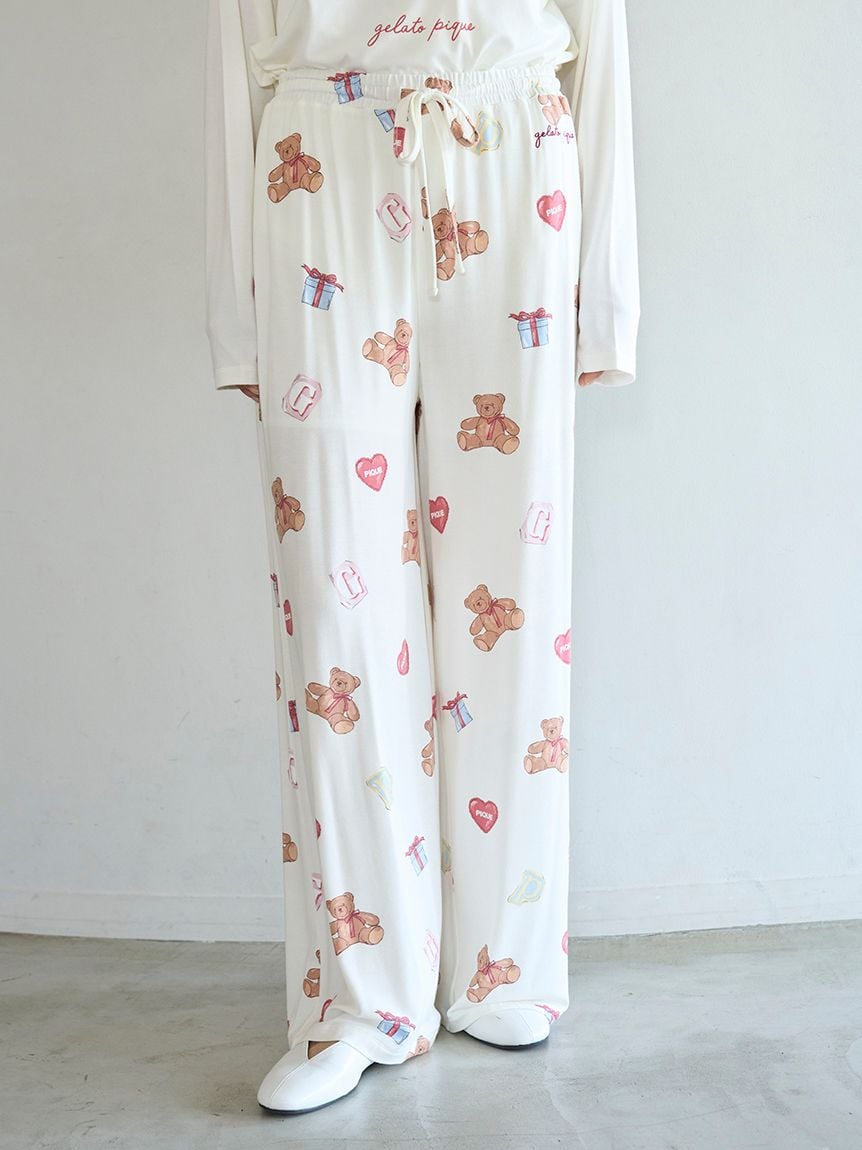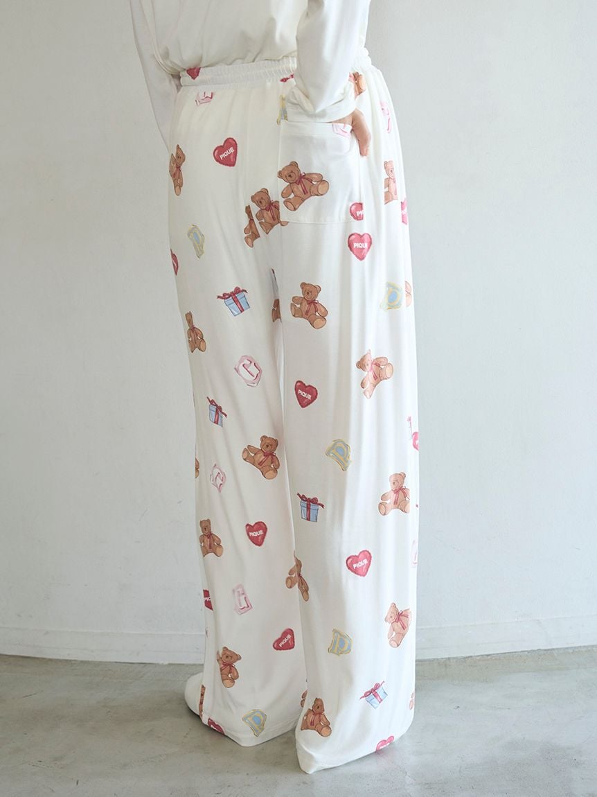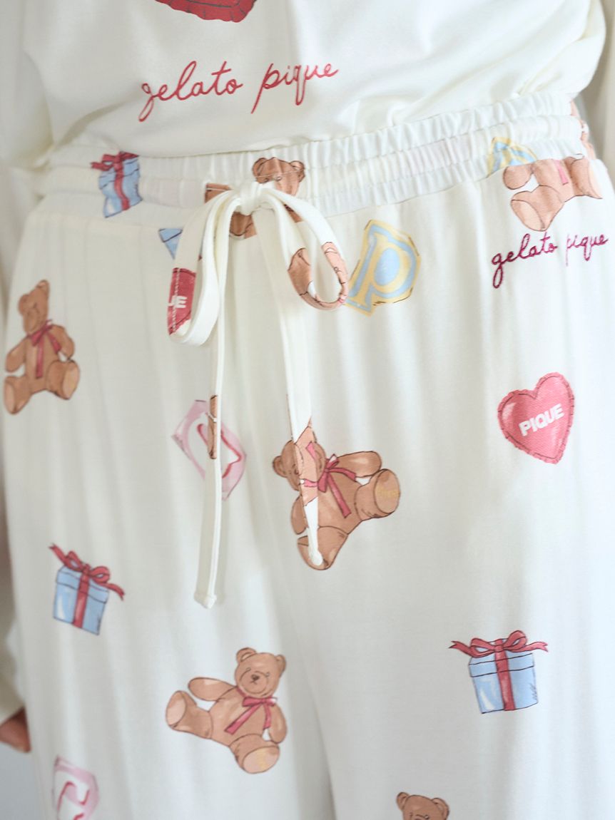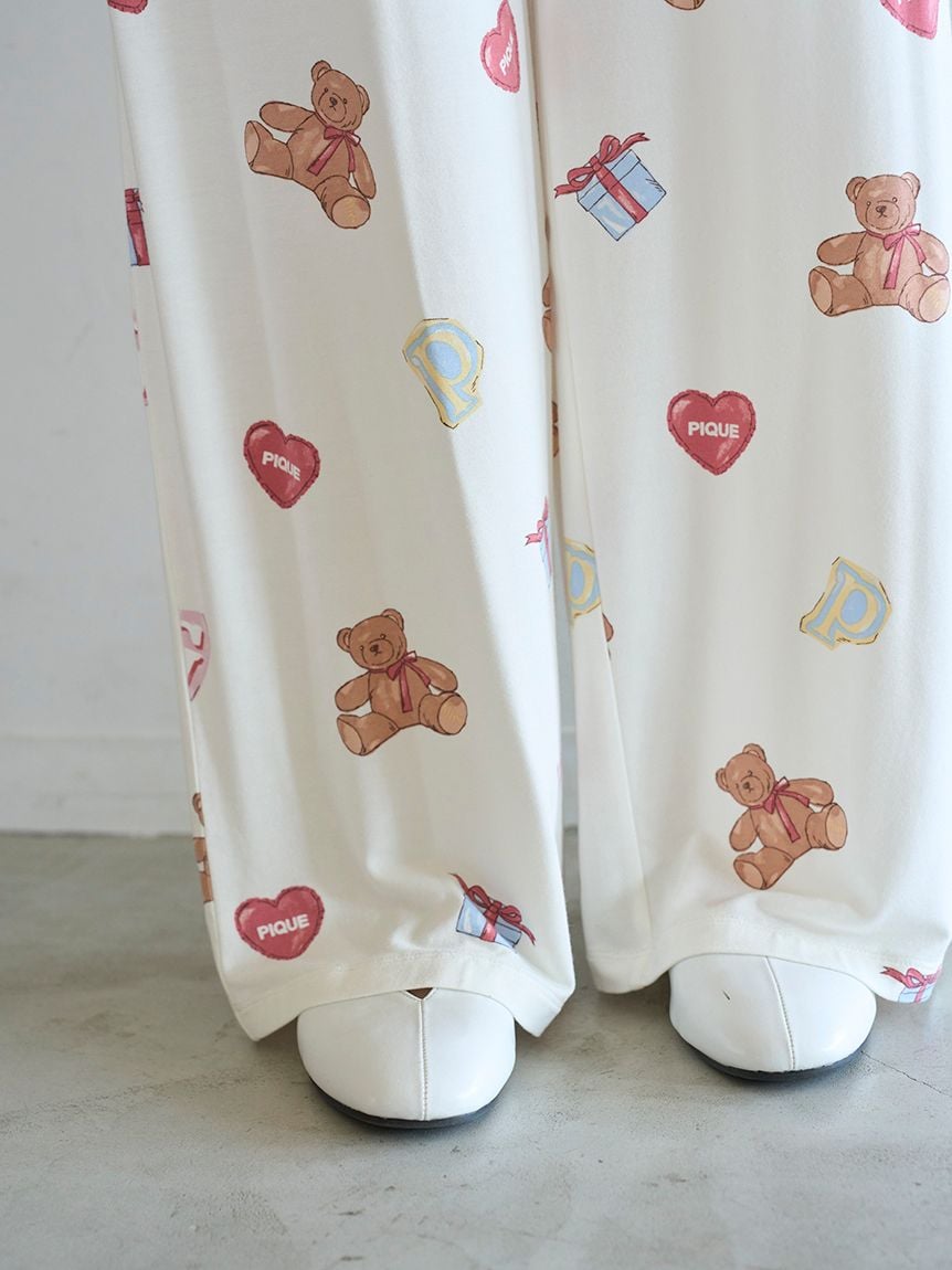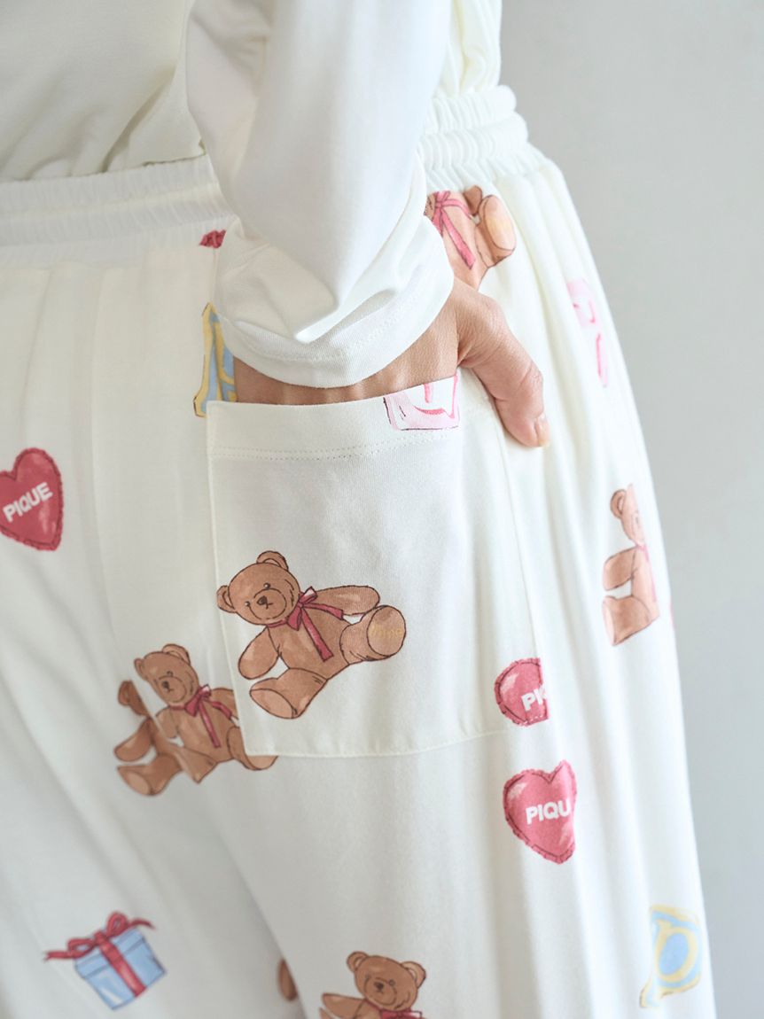 以女孩房間與心愛小熊玩偶為靈感打造的印花系列長褲。將小熊玩偶、禮物盒、愛心抱枕,以及仿雜誌剪貼感的「P」與「G」字母化作滿版印花,甜美又充滿玩趣。版型為輕鬆好穿的直筒剪裁,帶來自在舒適的穿著感受。