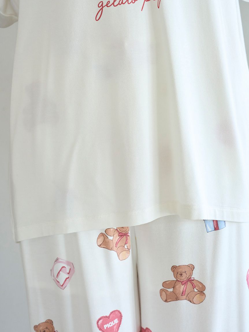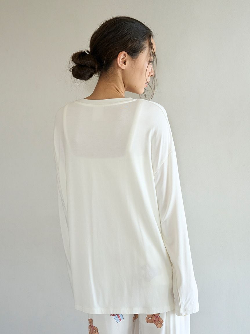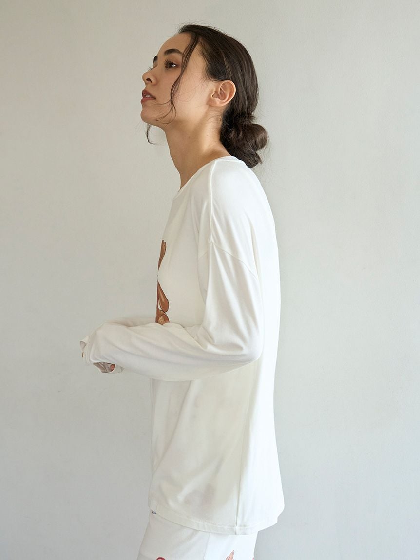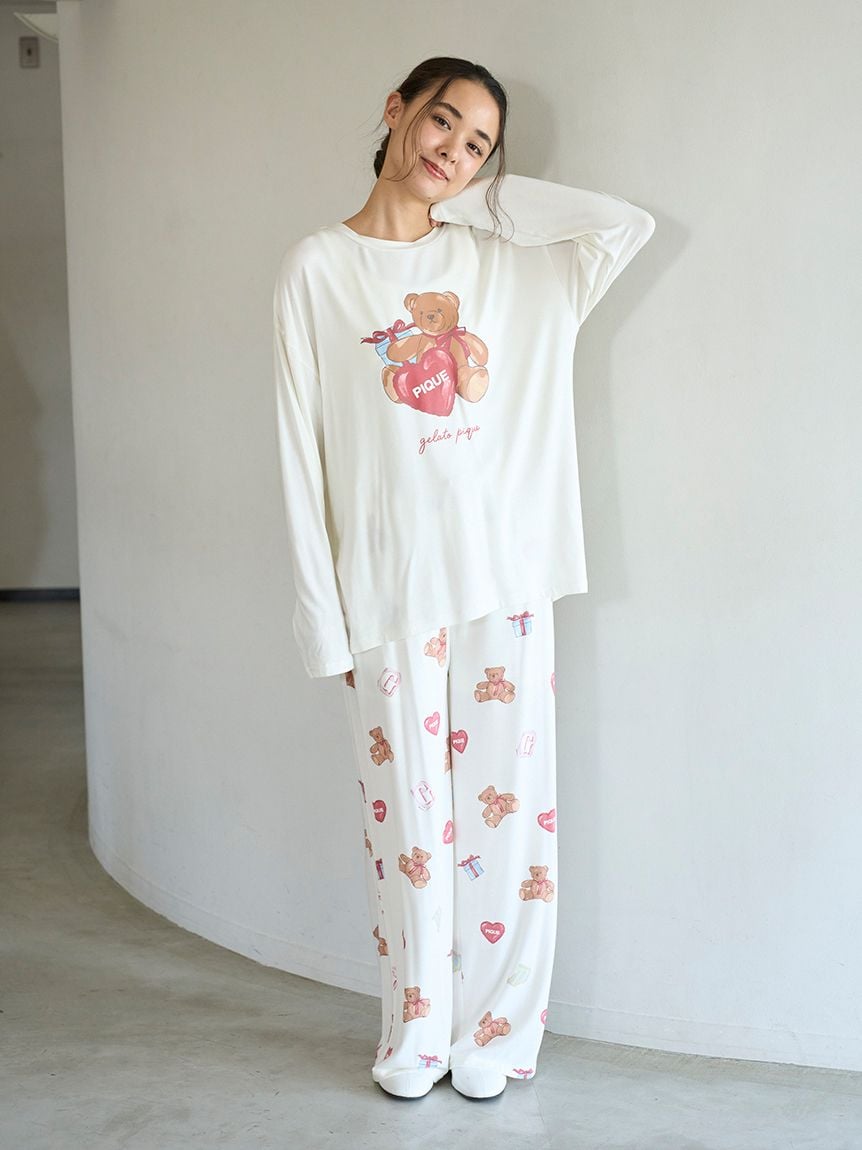 靈感來自女孩喜愛的小熊玩偶與可愛房間布置的系列印花長袖上衣。胸前以小熊玩偶、禮物盒與愛心抱枕作為印花點綴,營造溫馨的節日氛圍。