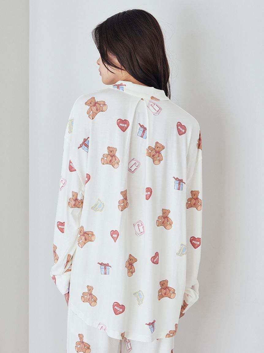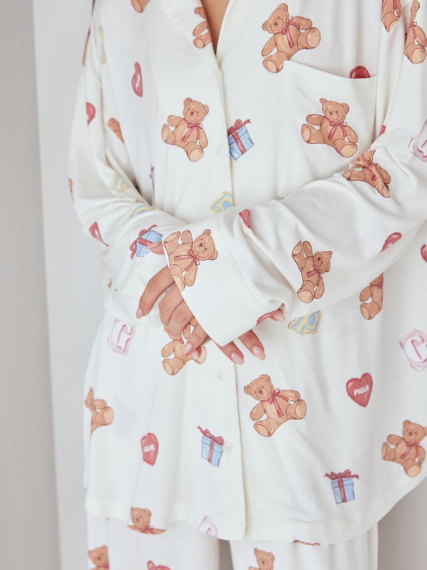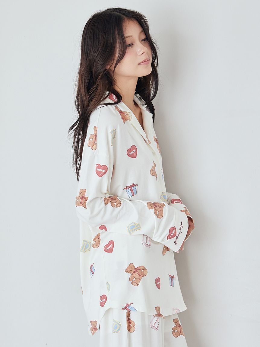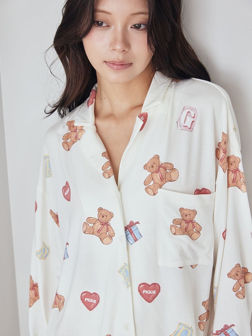 以女孩房間與心愛小熊玩偶為靈感的印花系列開領上衣。將小熊玩偶、禮物盒、愛心抱枕,以及仿雜誌剪貼感的「P」與「G」字母設計成滿版印花,甜美又帶點玩味。下襬做出前短後長的修飾剪裁,穿上即可呈現慵懶可愛的率性氛圍。