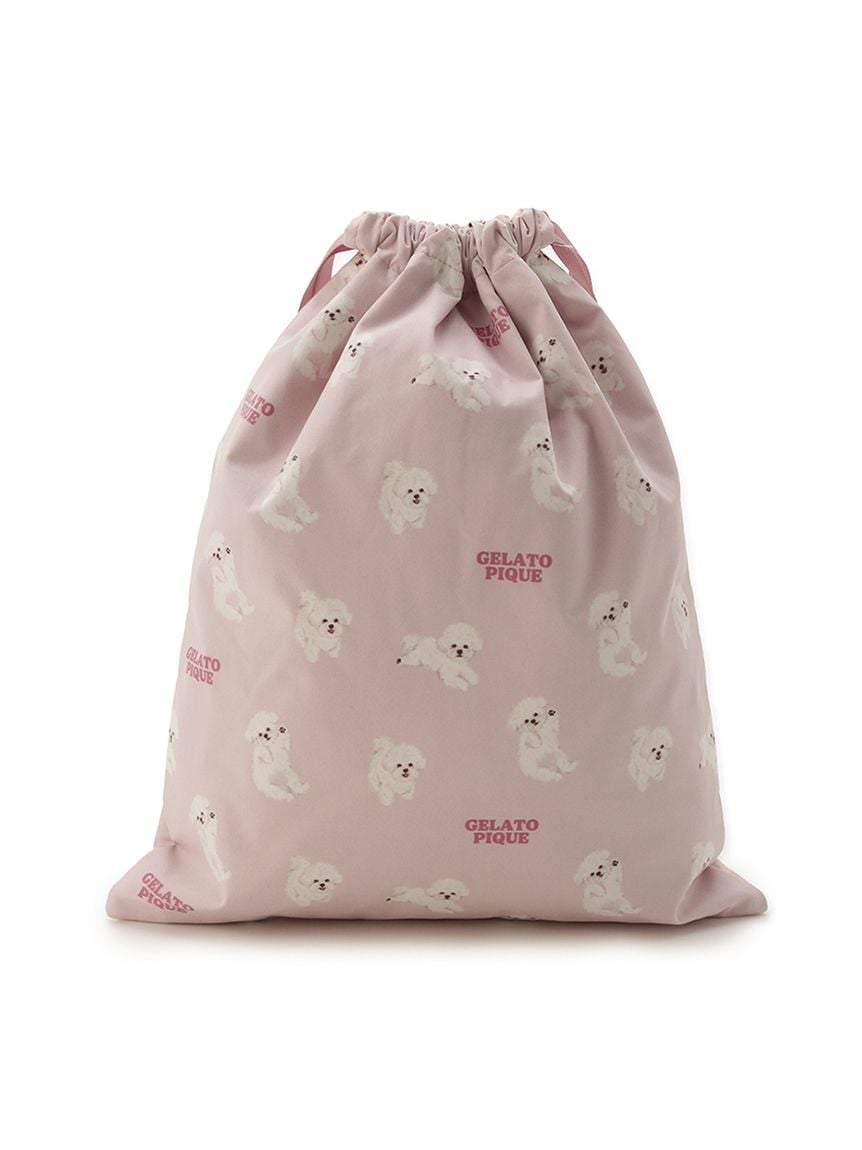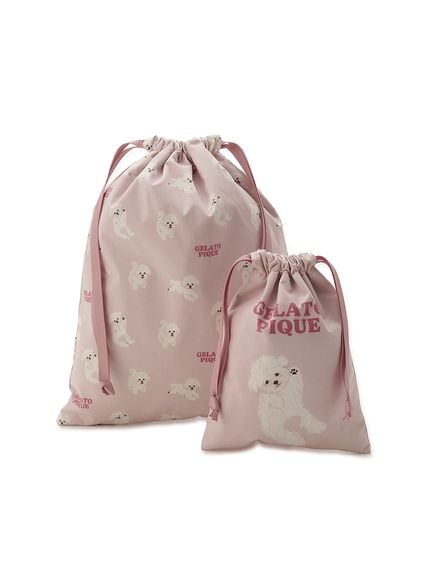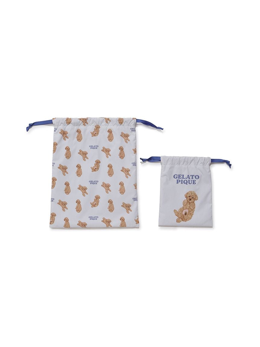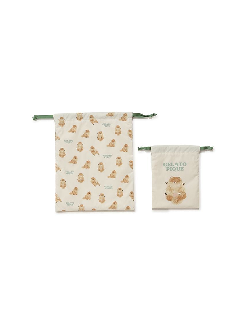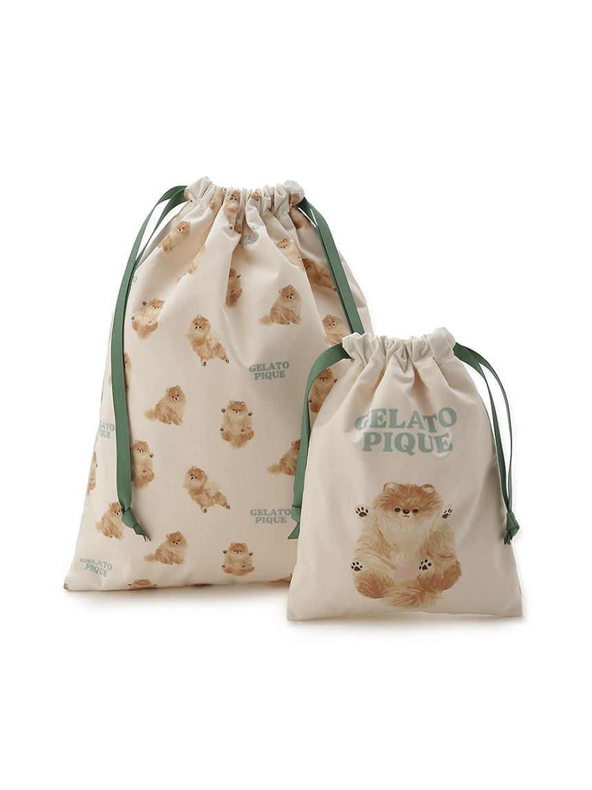 印有翻滾躺下露肚肚或坐著等各種姿勢小狗圖案的狗狗圖案系列束口袋套組。