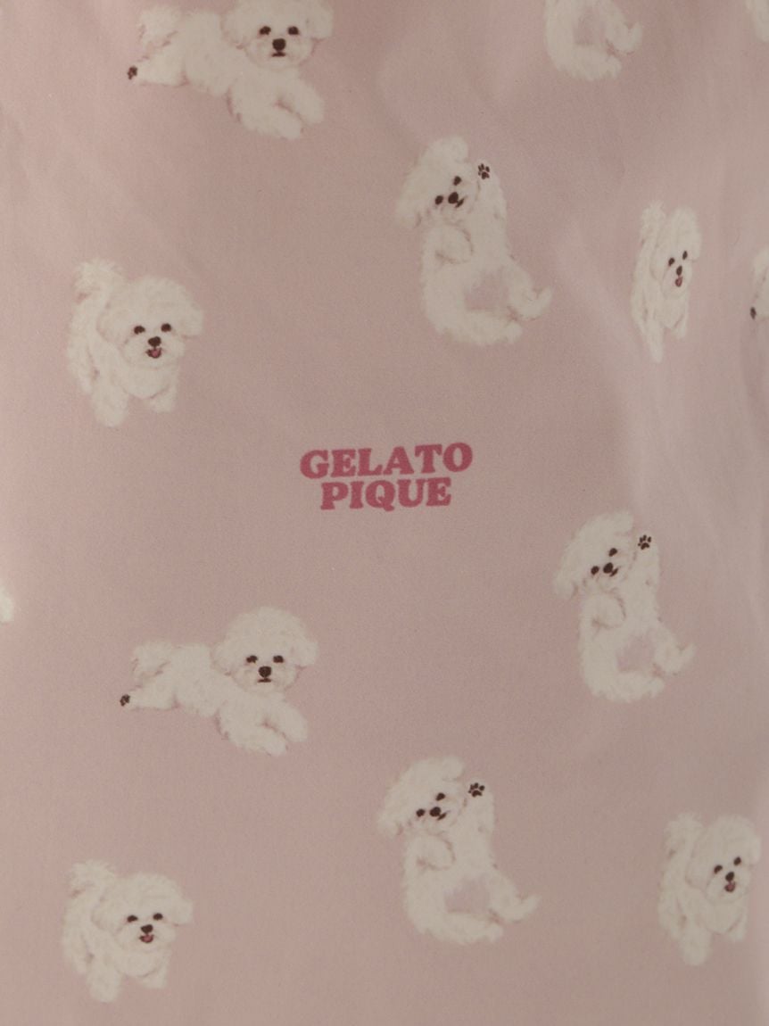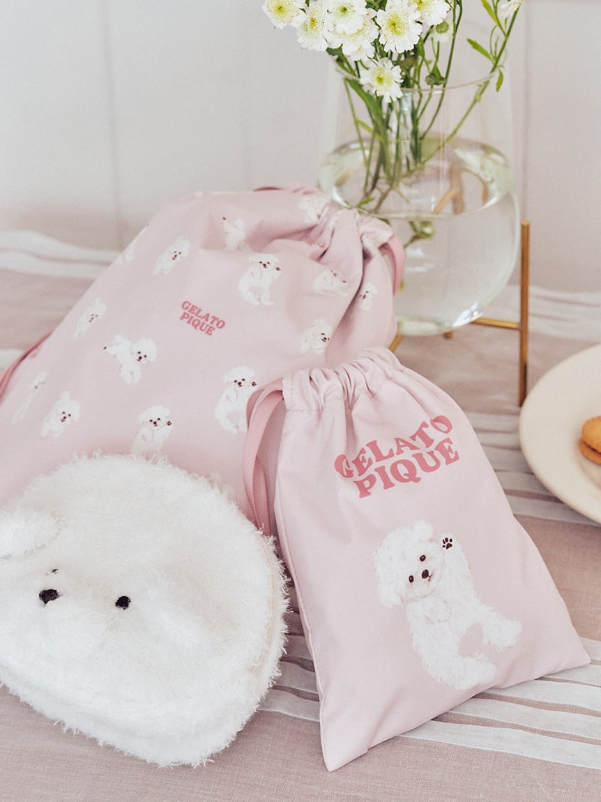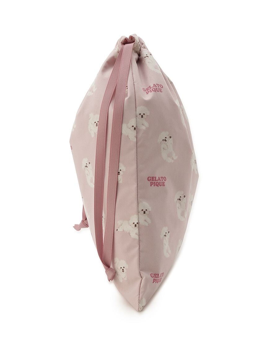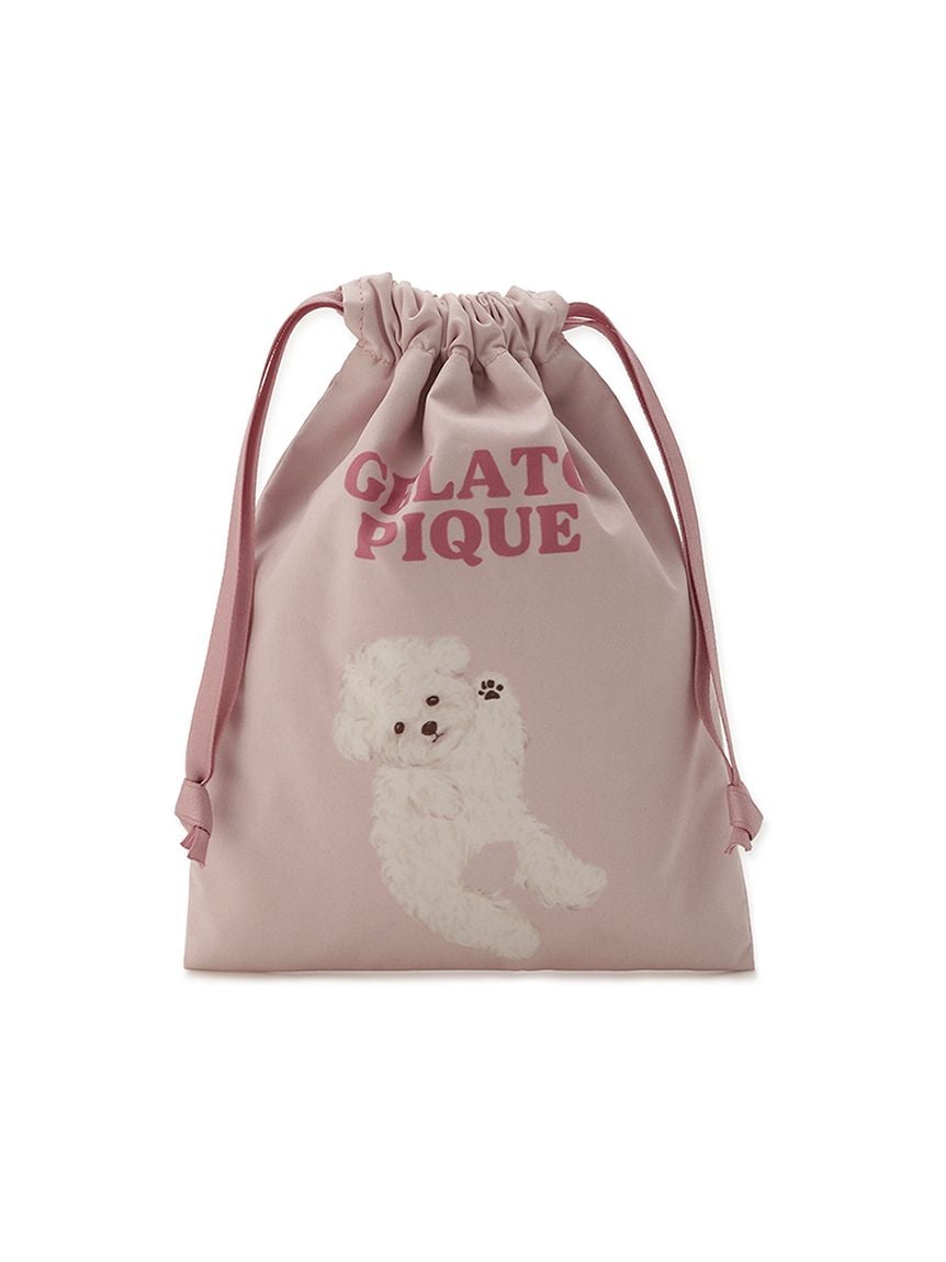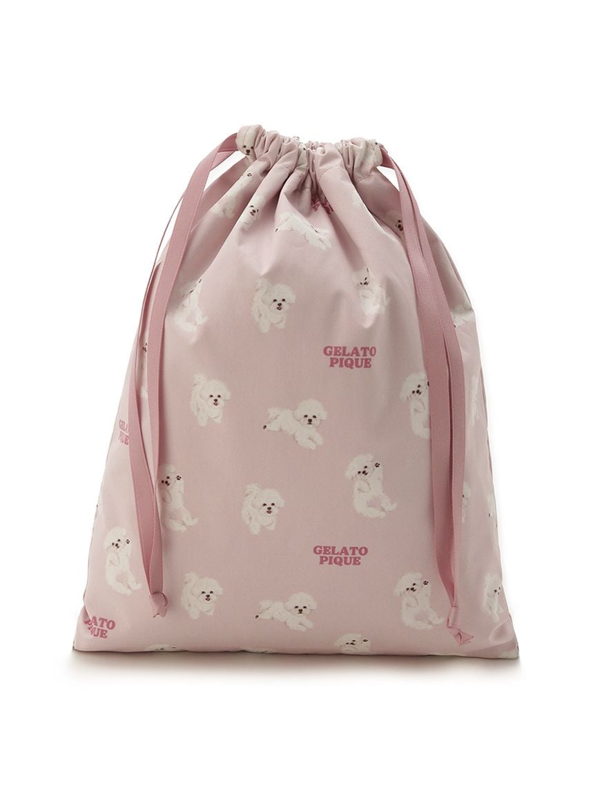 印有翻滾躺下露肚肚或坐著等各種姿勢小狗圖案的狗狗圖案系列束口袋套組。